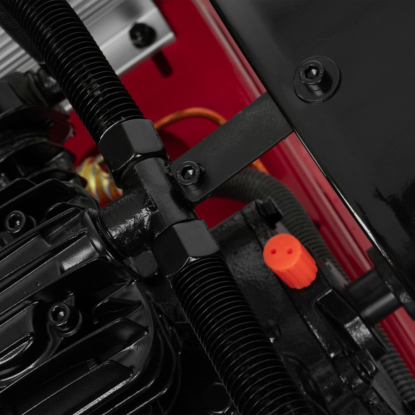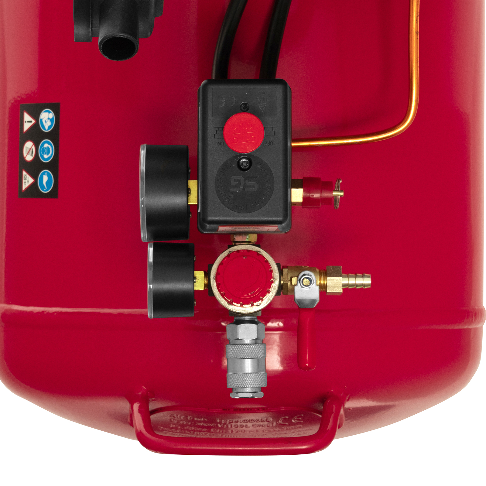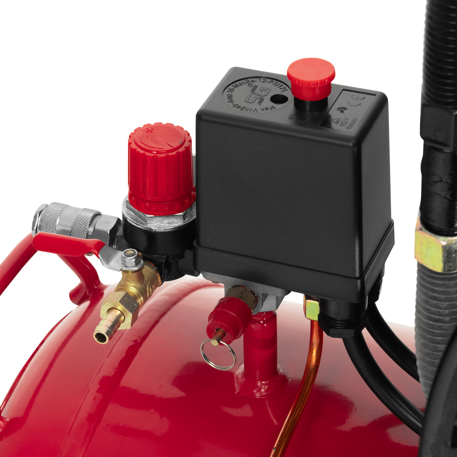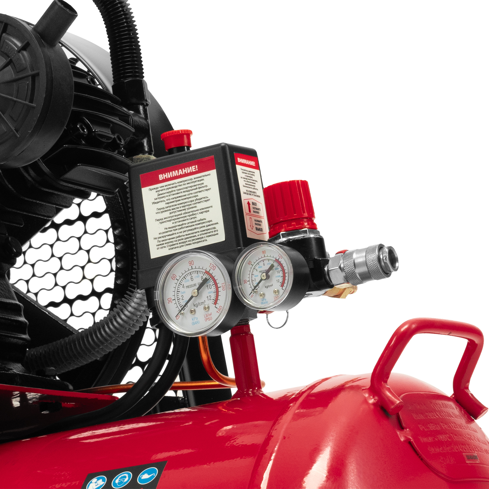 - Автоматическая регулировка производительности — прессостат останавливает двигатель при достижении максимального рабочего давления (8 бар) и запускает его при падении давления ниже минимально допустимого уровня.