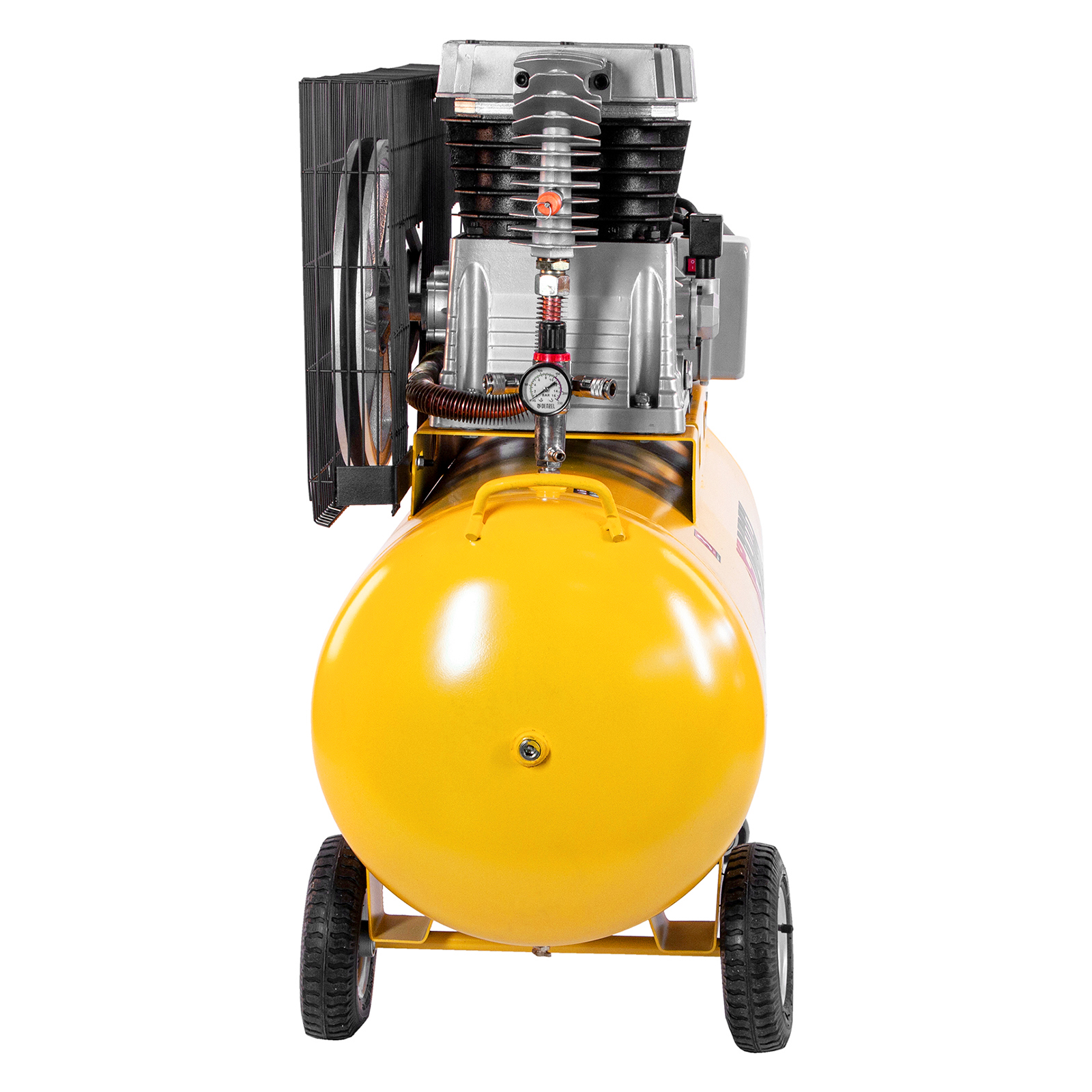 - Комфортная транспортировка — компрессор можно свободно перемещать по рабочей площадке благодаря удобной П-образной ручки и 4 колесам.