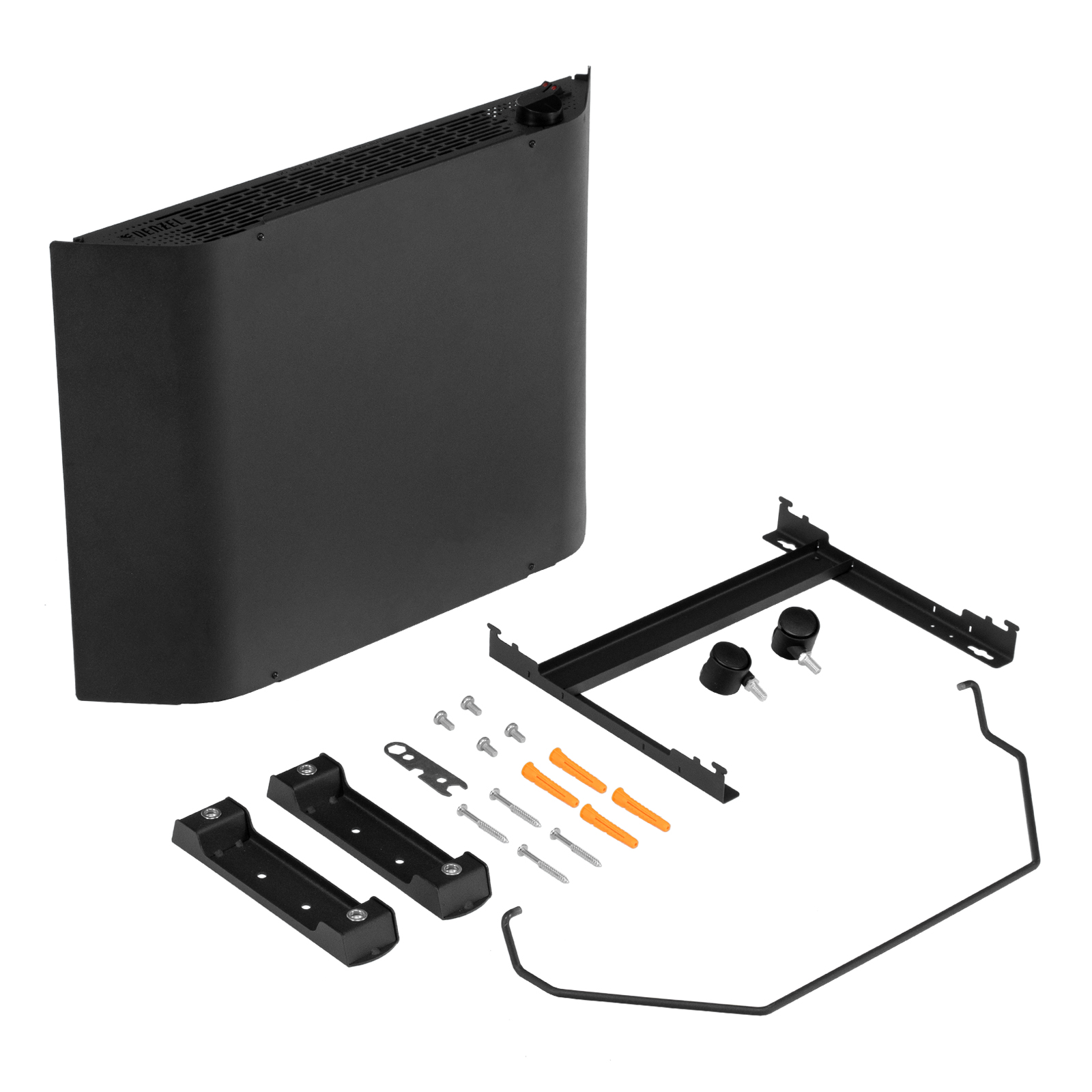 - Напольная или настенная установка — в комплект поставки включена цельнометаллическая крепежная рамка для стены, а также стальные ножки с колесами.