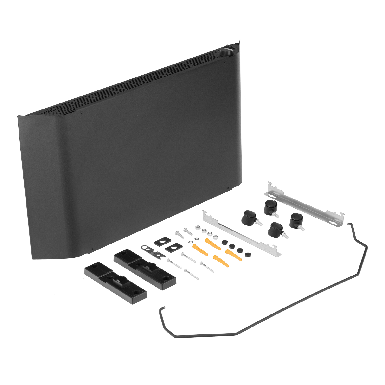 - Напольная или настенная установка — в комплект поставки включена цельнометаллическая крепежная рамка для стены, а также стальные ножки с колесами.