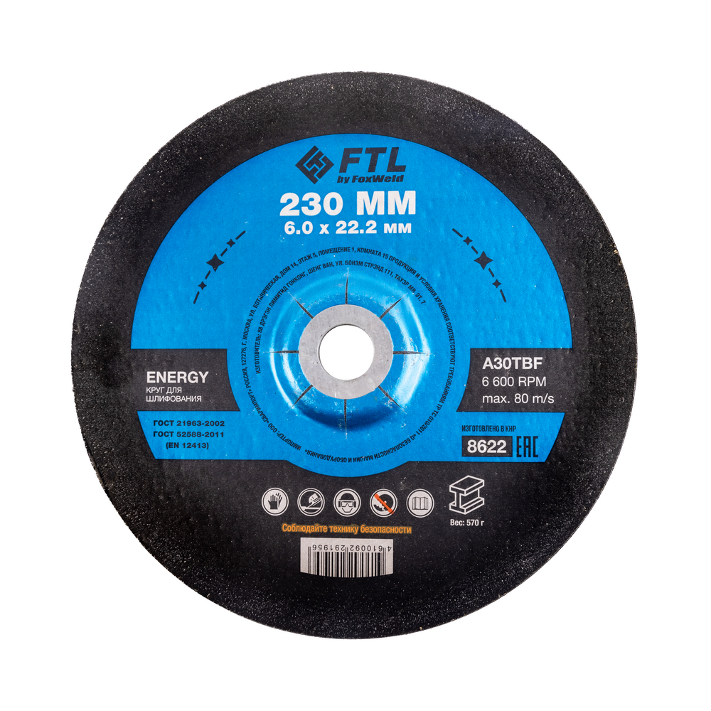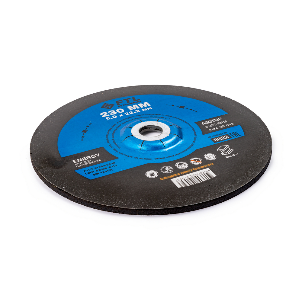 Шлифовальный диск FTL Energy 230 х 6,0 х 22,2 мм A30TBF – расходный материал для ручной угловой шлифовальной машины при работе с изделиями из чёрных металлов (чугуна). Диск предназначен для шлифовки и обдирки разных видов поверхностей, зачистки сварных швов, арматуры, профильных труб, стальных уголков, швеллера, удаления краски, ржавчины, обработки кромок. Поверхность куполообразного диска покрыта слоем абразивных частиц, скрепленных между собой бакелитовой связкой, и армирована одной стекловолоконной сеткой и тканой подложкой. Двойное металлическое кольцо обеспечивает плотную посадку на фланец УШМ, исключая биения и вибрацию при работе. Поставляется во влагозащитной упаковке. Особенность серии ENERGY - крупнозернистый абразивный состав высокой твёрдости для чёрных металлов на базе оксида алюминия. Не рекомендуется для работы с изделиями из нержавеющей стали.ИЗНОСОСТОЙКОСТЬ: Долгий срок службы диска - армирование одной стекловолоконной сеткой и нетканой подложкой плюс толщина связки 6 мм обеспечивают дополнительный запас прочности.УНИКАЛЬНЫЙ СОСТАВ: Технология производства включает в себя эксклюзивный рецепт абразива и смол: применение только твёрдых составов класса ВТ1, ВТ2, армирование сеткой из стекловолокна. Высокая твёрдость связывающей смолы позволяет сделать значительно большее количество съёма металла с заготовки по сравнению с кругами с обычным абразивом.ДВОЙНОЕ МЕТАЛЛИЧЕСКОЕ КОЛЬЦО: Двойное металлическое кольцо на диске обеспечивает плотную посадку на фланец УШМ, исключая биения и вибрацию при работе.ГЕРМЕТИЧНОСТЬ УПАКОВКИ: Диски упакованы в специальную термоусадочную герметичную плёнку, которая предохраняет от пыли и влаги при длительном хранении в условиях повышенной влажности, на строительных объектах и крупных промышленных производствах.ПРЕИМУЩЕСТВА:Для шлифовки изделий из черных металловКупольный профиль ТИП 27 – золотой стандарт для обдирочных и шлифовальных работНаиболее популярный посадочный диаметр 22,2 ммВысокая скорость обработкиКрупнозернистый абразив для лучшего зацепа при шлифованииТвёрдый состав абразиваВысокая износостойкостьДолгий срок службыКрупнозернистый абразив для лучшего зацепа при шлифованииСостав на базе оксида алюминияДвойное металлическое кольцо для плотной посадки на фланец УШМКОМПЛЕКТАЦИЯ: Круг для шлифования FTL Energy 230 х 6 х 22,2 мм A30TBF в термоусадочной плёнке со вкладышем – 5 шт.