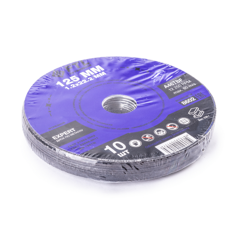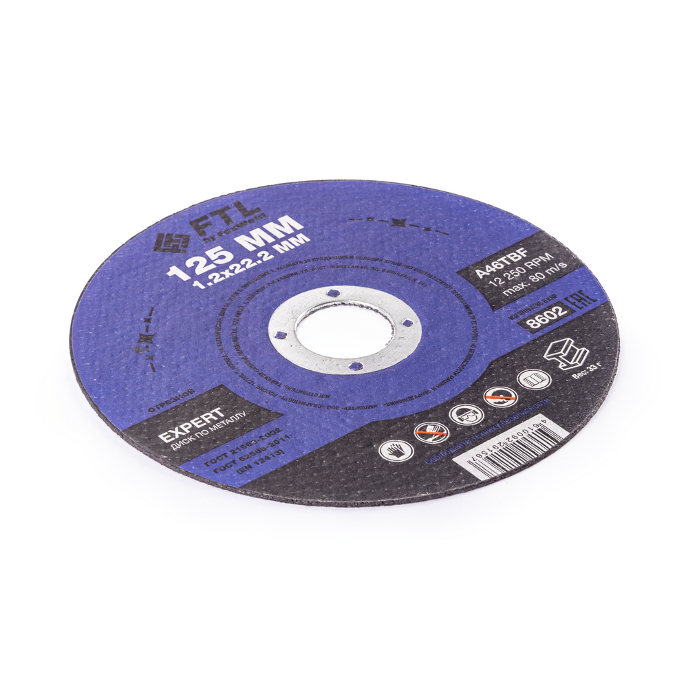 Диск отрезной по металлу FTL Expert 125 х 1,2 х 22,2 мм A46TBF - расходный инструмент для ручной угловой шлифовальной машины, предназначенный для резки различных изделий из чёрных металлов (чугунов). Конструктивно представляет собой плоский диск (тип 41), поверхность которого покрыта слоем абразивных частиц. Посыпка скреплена между собой бакелитовой связкой и армирована одной стекловолоконной сеткой и тканой подложкой. Поставляется во влагозащитной упаковке. Серия EXPERT - абразивный состав, оптимизированный для высокой износостойкости при резе чёрных металлов. Это свойство даёт увеличенный срок службы одного круга, давая возможность сделать значительно бóльшее количество резов заготовки, чем круги с обычным абразивом. Не рекомендуется для реза изделий из нержавеющей стали во избежание перегрева, прижога, окисления, потери эффективности легирующих добавок.ИЗНОСОСТОЙКОСТЬ: Благодаря премиальной формуле режущая и шлифовальная способность абразива снижается в процессе работы значительно медленнее, позволяя выполнить больше работы.УНИКАЛЬНЫЙ СОСТАВ: Технология производства включает в себя эксклюзивный рецепт абразива и смол: применение только твёрдых составов класса ВТ1, ВТ2, армирование сеткой из стекловолокна. Высокая твёрдость связывающей смолы позволяет сделать значительно большее количество резов по сравнению с кругами с обычным абразивом.МЕТАЛЛИЧЕСКОЕ КОЛЬЦО: Металлическое кольцо на диске обеспечивает плотную посадку на фланец УШМ, исключая биения и вибрацию при работе.ГЕРМЕТИЧНОСТЬ УПАКОВКИ: Диски упакованы в специальную термоусадочную герметичную плёнку, которая предохраняет от пыли и влаги при длительном хранении в условиях повышенной влажности, на строительных объектах и крупных промышленных производствах.ПРЕИМУЩЕСТВА:По чёрному металлу (!)Тип 41 (плоский)Высокая износостойкость (долгий срок службы)Состав на базе оксида алюминияПрофессиональный компаундМеталлическое кольцо для плотной посадки на фланец УШМВлагозащитная упаковкаКОМПЛЕКТАЦИЯ: Отрезной круг по чёрному металлу в термоусадочной плёнке со вкладышем – 10 шт.