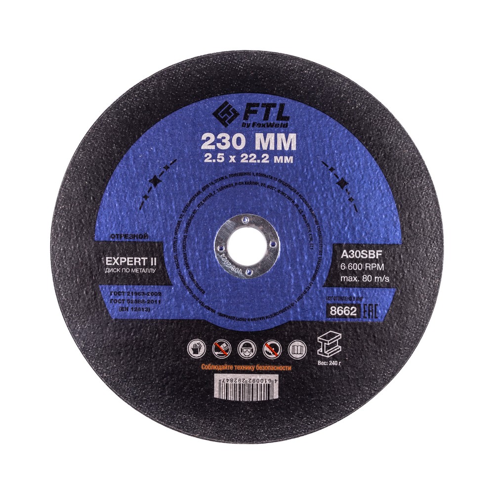 Диск отрезной по металлу FTL Expert II 230 х 2,5 х 22,2 мм A30SBF - расходный инструмент для ручной угловой шлифовальной машины, предназначенный для резки различных изделий из чёрных металлов (чугунов). Конструктивно представляет собой плоский диск (тип 41), поверхность которого покрыта слоем абразивных частиц. Посыпка скреплена между собой бакелитовой связкой и армирована одной стекловолоконной сеткой и тканой подложкой. Поставляется во влагозащитной упаковке. Серия EXPERT II — это эволюция абразивного компаунда общего назначения, оптимизированного для повышенной износостойкости. Новая формула состава предлагает ещё больше универсальности, позволяя работать также по изделиям из нержавеющей стали без искрообразования в случаях, если к качеству состава нержавеющей стали заготовки не предъявляются высокие требования. Максимальное количество резов достигается при работе с изделиями из чёрных металлов. *ВНИМАНИЕ! В случае повышенных требований к качеству нержавеющей стали заготовок не рекомендуется использовать во избежание перегрева, прижога, окисления, потери эффективности легирующих добавок - например, при резе элементов ответственных конструкций.ИЗНОСОСТОЙКОСТЬ: Благодаря премиальной формуле режущая и шлифовальная способность абразива снижается в процессе работы значительно медленнее, позволяя выполнить больше работы.УНИКАЛЬНЫЙ СОСТАВ: Технология производства включает в себя эксклюзивный рецепт абразива и смол: применение только твёрдых составов класса ВТ1, ВТ2, армирование сеткой из стекловолокна. Высокая твёрдость связывающей смолы позволяет сделать значительно большее количество резов по сравнению с кругами с обычным абразивом.МЕТАЛЛИЧЕСКОЕ КОЛЬЦО: Металлическое кольцо на диске обеспечивает плотную посадку на фланец УШМ, исключая биения и вибрацию при работе.ГЕРМЕТИЧНОСТЬ УПАКОВКИ: Диски упакованы в специальную термоусадочную герметичную плёнку, которая предохраняет от пыли и влаги при длительном хранении в условиях повышенной влажности, на строительных объектах и крупных промышленных производствах.ПРЕИМУЩЕСТВА:Универсальный круг (*)Тип 41 (плоский)Высокая износостойкость (долгий срок службы)Состав на базе оксида алюминияПрофессиональный компаундМеталлическое кольцо для плотной посадки на фланец УШМВлагозащитная упаковкаКОМПЛЕКТАЦИЯ: Отрезной круг по чёрному металлу в термоусадочной плёнке со вкладышем – 5 шт.