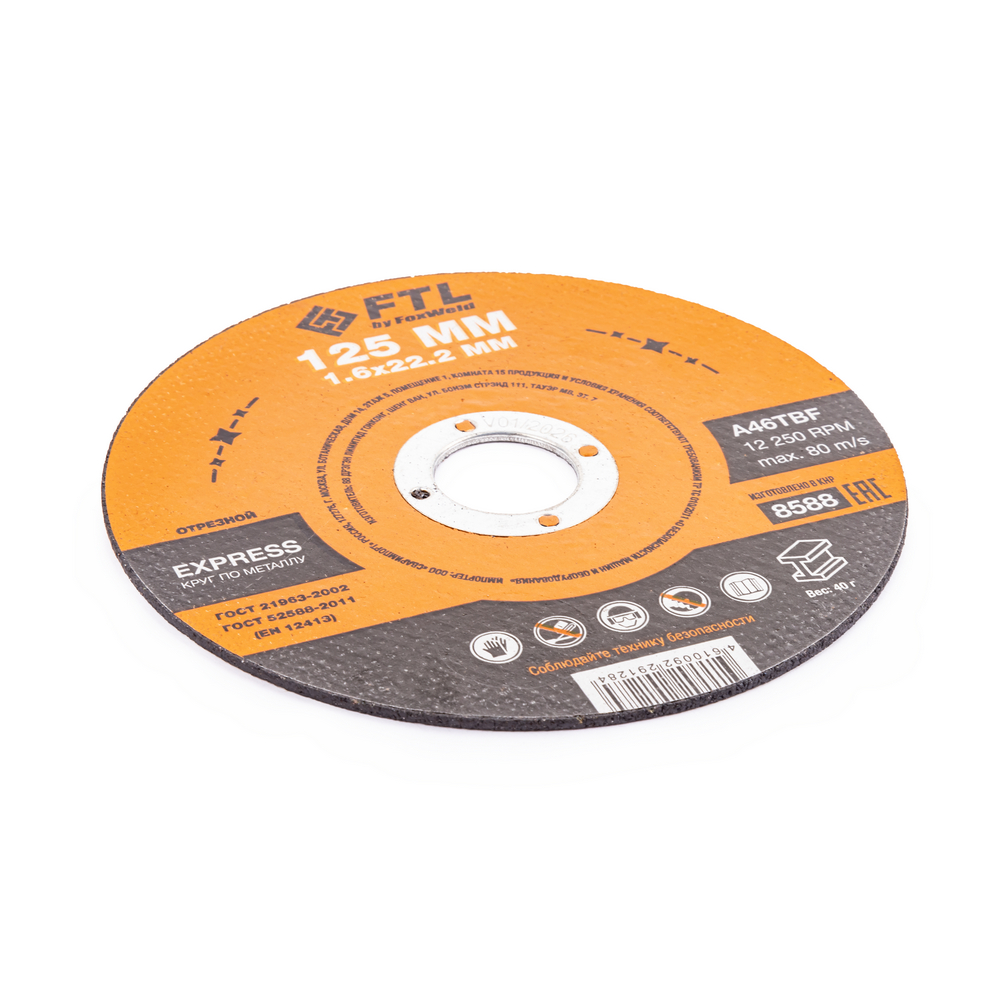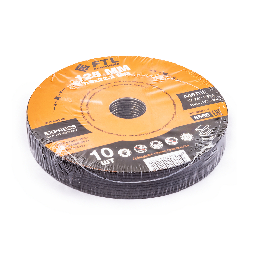 Диск отрезной по металлу FTL Express 125 х 1,6 х 22,2 мм A46TBF - расходный инструмент для ручной угловой шлифовальной машины, предназначенный для резки различных изделий из чёрных металлов (чугунов). Конструктивно представляет собой плоский диск (тип 41), поверхность которого покрыта слоем абразивных частиц. Посыпка скреплена между собой бакелитовой связкой и армирована одной стекловолоконной сеткой и тканой подложкой. Поставляется во влагозащитной упаковке. Серия EXPRESS представляет абразивный состав высокой твёрдости, оптимизированный для скоростного реза чёрных металлов. Не рекомендуется для реза изделий из нержавеющей стали во избежание перегрева, прижога, окисления, потери эффективности легирующих добавок.ИЗНОСОСТОЙКОСТЬ: Благодаря премиальной формуле режущая и шлифовальная способность абразива снижается в процессе работы значительно медленнее, позволяя выполнить больше работы.УНИКАЛЬНЫЙ СОСТАВ: Технология производства включает в себя эксклюзивный рецепт абразива и смол: применение только твёрдых составов класса ВТ1, ВТ2, армирование сеткой из стекловолокна. Высокая твёрдость связывающей смолы позволяет сделать значительно большее количество резов по сравнению с кругами с обычным абразивом.МЕТАЛЛИЧЕСКОЕ КОЛЬЦО: Металлическое кольцо на диске обеспечивает плотную посадку на фланец УШМ, исключая биения и вибрацию при работе.ГЕРМЕТИЧНОСТЬ УПАКОВКИ: Диски упакованы в специальную термоусадочную герметичную плёнку, которая предохраняет от пыли и влаги при длительном хранении в условиях повышенной влажности, на строительных объектах и крупных промышленных производствах.ПРЕИМУЩЕСТВА:По чёрному металлу (!)Тип 41 (плоский)Быстрый резСостав на базе оксида алюминияМеталлическое кольцо для плотной посадки на фланец УШМВысокая твёрдость составаВлагозащитная упаковкаКОМПЛЕКТАЦИЯ: Отрезной круг по чёрному металлу в термоусадочной плёнке со вкладышем – 10 шт.