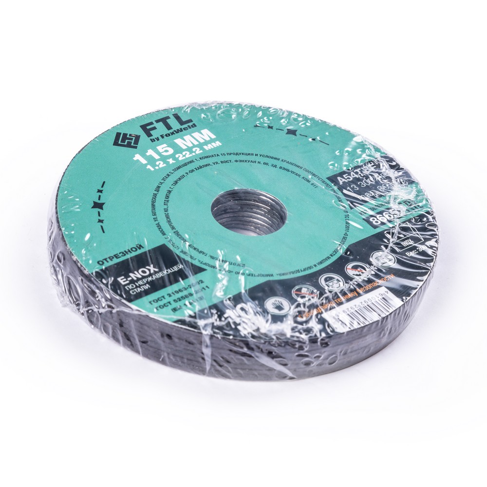 Диск отрезной по нержавеющей стали FTL E-Nox 115 х 1,2 х 22,2 мм A54TBF – это расходный инструмент для ручной угловой шлифовальной машины, предназначенный для резки деталей и конструкций, профиля и листового металла из нержавеющих и легированных сталей. Конструктивно представляет собой плоский диск (тип 41), поверхность которого покрыта слоем абразивных частиц. Посыпка скреплена между собой бакелитовой связкой и армирована одной стекловолоконной сеткой и тканой подложкой. Поставляется во влагозащитной упаковке. Серия E-NOX - новый специализированный абразивный компаунд для работы по изделиям из нержавеющей стали. Оксид циркония с лучшей теплопроводностью эффективно отводит тепло из зоны реза, противостоит прижогу и перегреву, сохраняя легирующие свойства нержавеющей стали. Минимальные значения железа, серы и хлора в составе абразива гарантируют защиту от окисления. Не рекомендуется к работе с изделиями из чёрных металлов из-за недостаточной износостойкости (увеличенного расхода материала диска при работе).УВЕЛИЧЕННАЯ СКОРОСТЬ РЕЗА: Компаунд на базе оксида циркония не перегревает, не окисляет, не искрит, не дымит, при этом демонстрируя высокий результат по количеству резов и скорости работы по сравнению с составами абразива общего значения.ВЫСОКОКАЧЕСТВЕННЫЙ ОКСИД ЦИРКОНИЯ: Серия E-NOX – это новый, узко специализированный состав для работы по нержавеющей стали, титану и меди. Благодаря присутствию оксида циркония в составе компаунда, круги не перегревают материалы, сберегая заготовки от побежалостей, посинений, окислений, при этом демонстрируя высокие результаты по количеству резов и скорости работы. Комфортный и мягкий рез по нержавейке.УНИКАЛЬНЫЙ СОСТАВ: Технология производства включает в себя эксклюзивный рецепт абразива и смол: применение только твёрдых составов класса ВТ1, ВТ2, армирование сеткой из стекловолокна. Высокая твёрдость связывающей смолы позволяет сделать значительно большее количество резов по сравнению с кругами с обычным абразивом.МЕТАЛЛИЧЕСКОЕ КОЛЬЦО: Металлическое кольцо на диске обеспечивает плотную посадку на фланец УШМ, исключая биения и вибрацию при работе.ГЕРМЕТИЧНОСТЬ УПАКОВКИ: Диски упакованы в специальную термоусадочную герметичную плёнку, которая предохраняет от пыли и влаги при длительном хранении в условиях повышенной влажности, на строительных объектах и крупных промышленных производствах.ПРЕИМУЩЕСТВА:По нержавеющей и легированной сталиОксид циркония (не перегревает материалы)Минимальное содержание железа, серы, хлора (не окисляет материалы)Тип 41 (плоский)Увеличенный срок службыФибергласс – прочное стекловолоконное основание дискаМеталлическое кольцо для плотной посадки на фланец УШМВлагозащитная упаковкаКОМПЛЕКТАЦИЯ: Отрезной круг по чёрному металлу в термоусадочной плёнке со вкладышем – 10 шт.