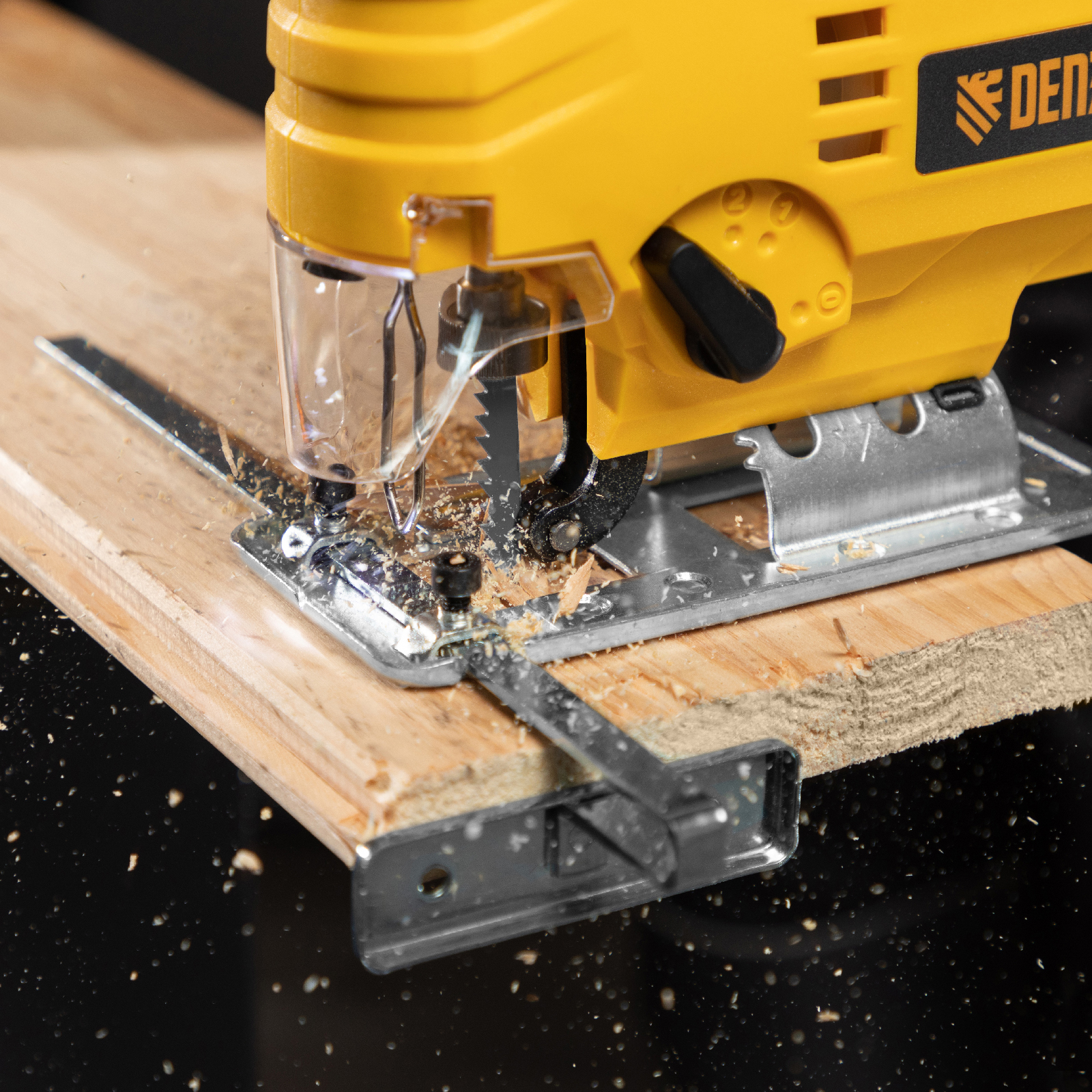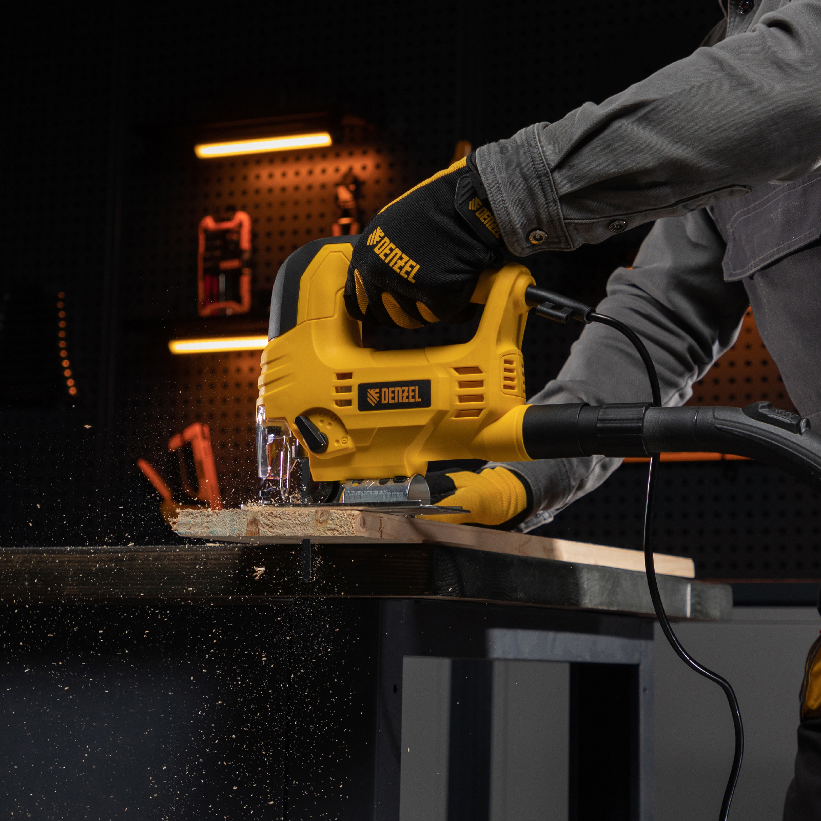 Электрический лобзик Denzel JS-65 27101 мощностью 550 Вт предназначен для прямого и фигурного реза листовых материалов из металла, древесины, и пластмассы, а также для вырезки варочных панелей или отверстий под мойки в столешницах. Двигатель обеспечивает частоту хода оснастки 1000-2800 ход/мин. Для резки древесины максимальная глубина пропила составляет 65 мм, для цветных металлов — 12 мм, а для стали — 6 мм. Угол наклона подошвы регулируется, что позволяет совершать пропилы под углом до 45°.