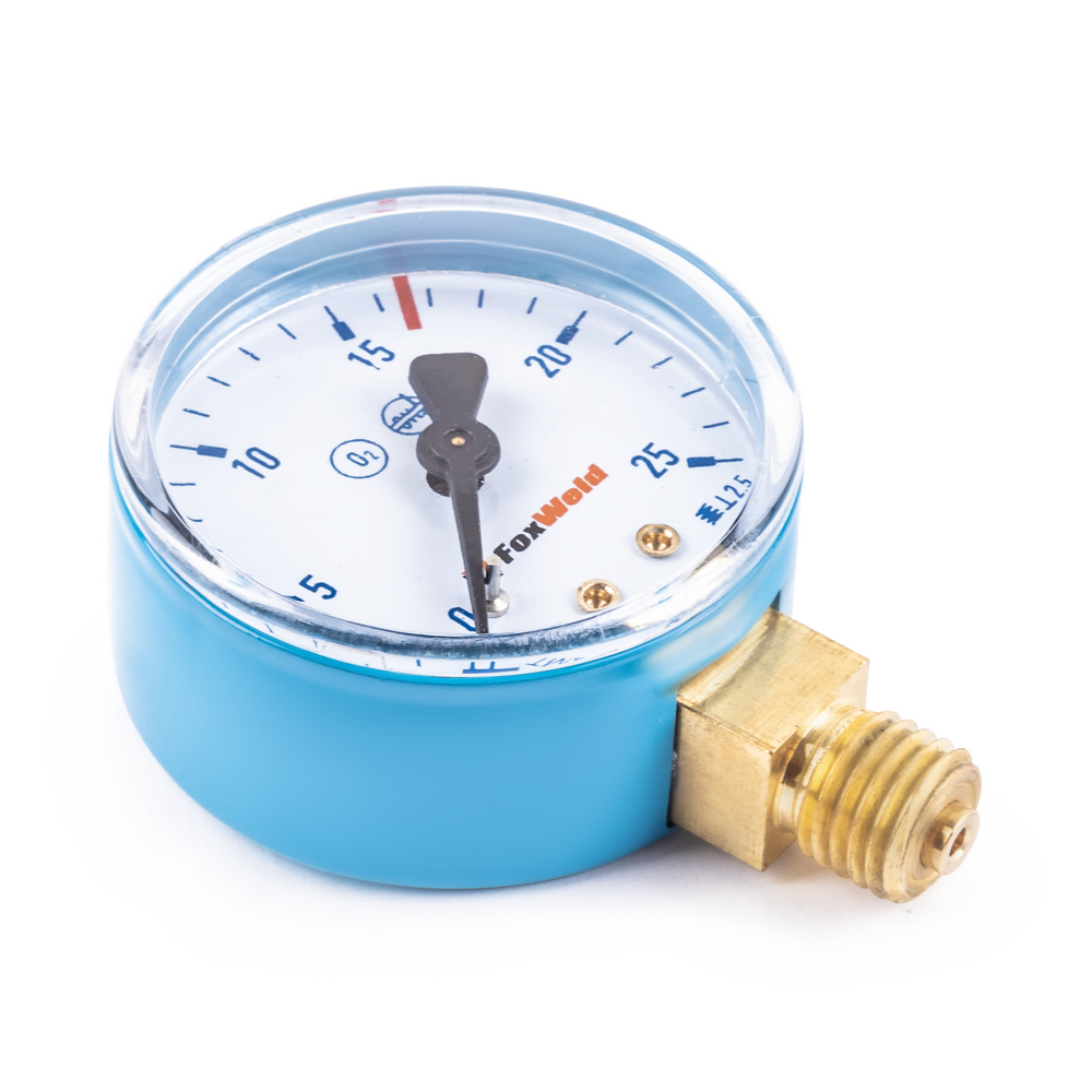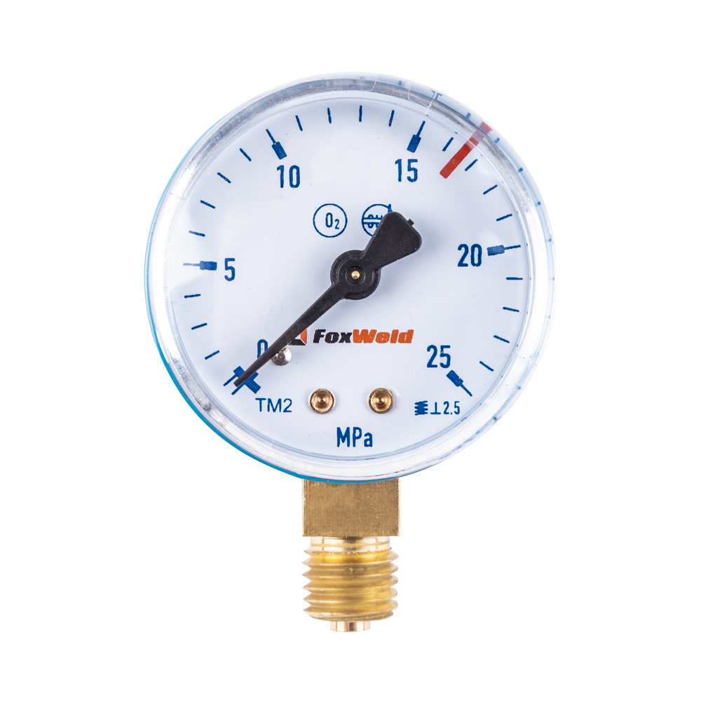 Манометр Foxweld предназначен для измерения и отражения давления кислорода от 0 до 25 МПа в баллоне при выполнении сварочных работ. В данном измерительном  приборе применяется аналоговый метод работы и индикации. Присоединяется  радиально. Корпус выполнен из латуни.