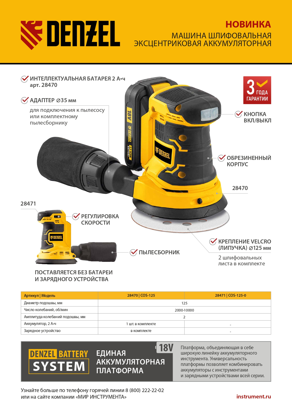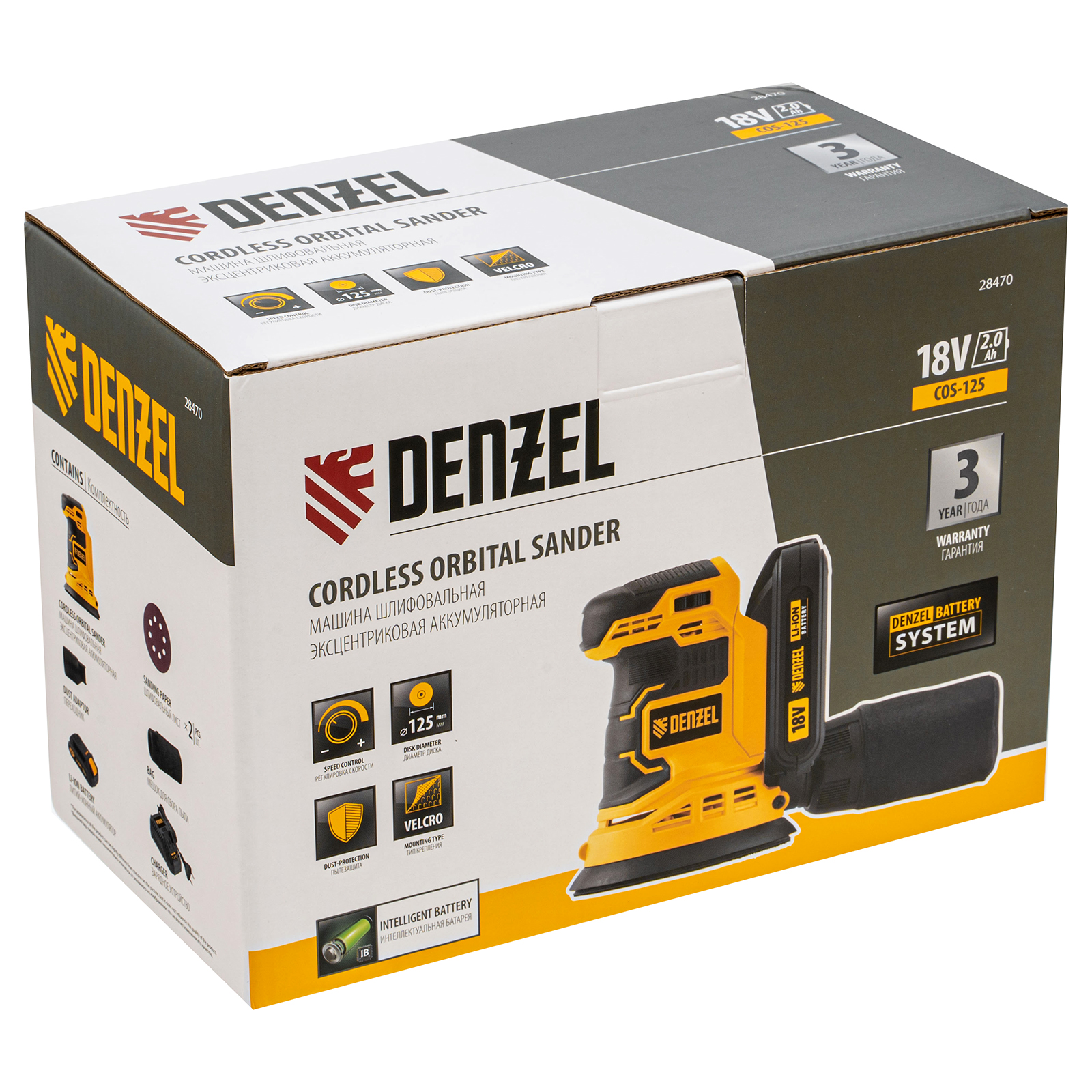 Аккумуляторная эксцентриковая шлифовальная машина Denzel COS-125 28470 работает от источника питания Li-Ion емкостью 2 А/ч, с рабочим напряжением 18 В. Предназначена для выполнения зачистных, шлифовальных и полировальных работ по древесине, металлу, пластику и камню. Применяется со шлифовальными и полировальными кругами диаметром 125 мм, скорость вращения составляет 2000-10000 об/мин, благодаря чему можно эффективно решать различные задачи.,Универсальный аккумулятор с интеллектуальной системой распознавания нагрузки совместим со всеми инструментами единой платформы Denzel battery system 18V серии IB.