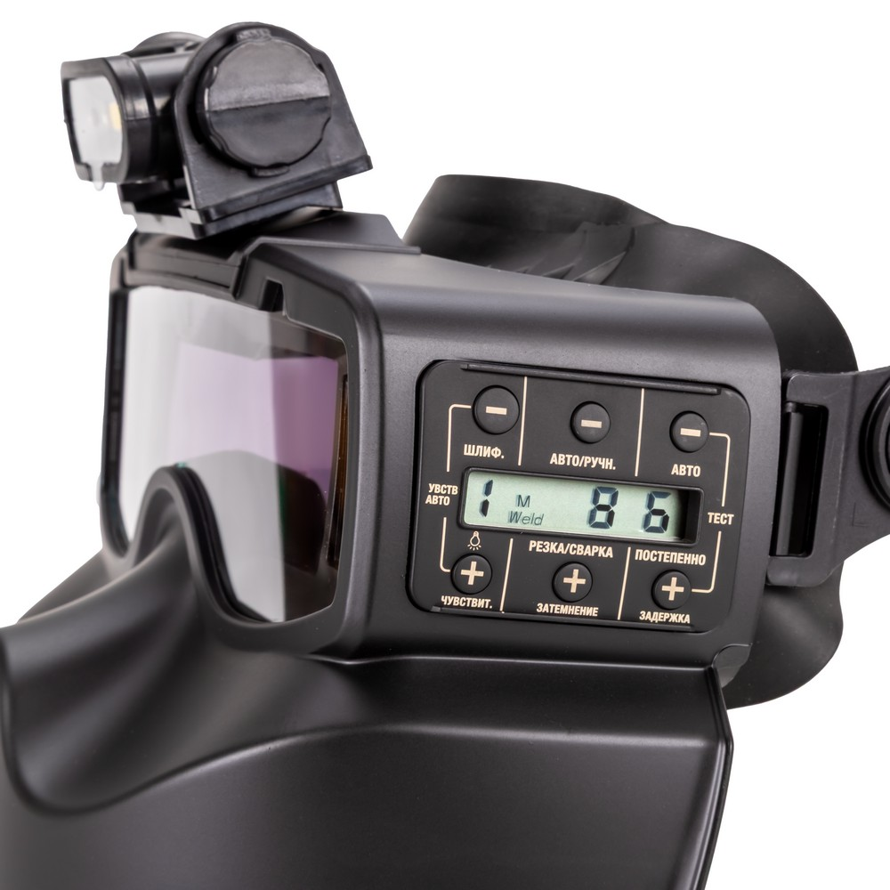 Сварочная маска M X650 серии Ultimate предназначена для защиты глаз, лица и шеи сварщика от вредного ультрафиолетового излучения, искр и брызг расплавленного металла в ограниченном пространстве и труднодоступных местах. Новый уровень комфорта и свободы действий во время сварочного процесса достигается за счёт уникальной конструкции. Режимы и параметры настраиваются с помощью удобных кнопок на внешней панели управления, а вся необходимая информация отображается на LCD экране. Маска плотно прилегает к лицу, увеличивая площадь обзора. Защитный капюшон в виде шлема с пластиковым наголовником обеспечивает дополнительную защиту головы и шеи. Специальный налобный фонарь с несколькими режимами яркости предусмотрен для работы в условиях недостаточного освещения.АВТОМАТИЧЕСКАЯ НАСТРОЙКА ЗАТЕМНЕНИЯ: Сварочная маска оборудована синергетическим подбором параметров затемнения. В режиме синергетики система автоматически устанавливает нужные параметры затемнения в зависимости от условий рабочего процесса.ИНФОРМАТИВНАЯ ПАНЕЛЬ УПРАВЛЕНИЯ: С внешней стороны маска оборудована цифровой панелью управления для удобной настройки светофильтра. На панели расположены органы управления светофильтра и LCD дисплей с индикацией настроек и параметров.2 ДИАПАЗОНА ЗАТЕМНЕНИЯ: Эта модель маски имеет 2 диапазона степени затемнения: 4 – 8 DIN и 8 - 13 DIN. Первый диапазон больше подходит для плазменной резки, ручной, полуавтоматической и аргонодуговой сварки на малых токах. Диапазон 8 – 13 DIN подойдёт для сварки MMA, MIG/MAG, TIG при сварочном токе 125 А и выше.ФОНАРЬ: Сварочная маска оснащена специальным налобным фонарём с защитным стеклом и несколькими режимами яркости для работы в условиях недостаточного освещения.ЗАЩИТНЫЙ КАПЮШОН: Капюшон в виде шлема с пластиковым наголовником обеспечивает дополнительную защиту головы и шеи сварщика от искр и брызг раскалённого металла во время работы.ПРЕИМУЩЕСТВА:Внешняя цифровая панель управления с LCD дисплеемЧувствительность светофильтра в TIG-сварке меньше 2 амперЛёгкий и прочный материал маски, негорючий и стойкий к излучению сварочной дугиОптимальный размер смотрового окна2 диапазона затемнения3 независимых фотодатчикаТехнология FULL COLORМаксимальная постоянная защита от невидимого УФ/ИК излучения дугиНалобный фонарьЗащитный капюшонКомбинированное питаниеСоответствие современным стандартам качества DIN, ISO, EN379ФУНКЦИОНАЛЬНЫЕ ОСОБЕННОСТИ:РЕЖИМ GRIND: Режим шлифовки (Grind) даёт возможность блокировать затемнение светофильтра для использования маски в качестве защитного щитка при работе с УШМ («болгаркой») или шлифовальным инструментом. Кнопка включения/выключения режима удобно расположена с внешней стороны корпуса маски.3 ОПТИЧЕСКИХ ДАТЧИКА: Независимые фотодатчики мгновенно срабатывают при появлении сварочной дуги и поддерживают закрытое состояние светофильтра даже тогда, когда один из датчиков перекрыт каким-либо препятствием. Повышенная чувствительность сенсоров даёт исключительную стабильность обнаружения дуги. Маска оснащена тремя независимыми датчиками, что гарантирует срабатывание даже в том случае, если два датчика будут закрыты.ВЫСШИЙ ОПТИЧЕСКИЙ КЛАСС: Максимальный оптический класс 1/1/1/1 по параметрам оптический класс светофильтра, степень рассеивания света, однородность затемнения, угловая за