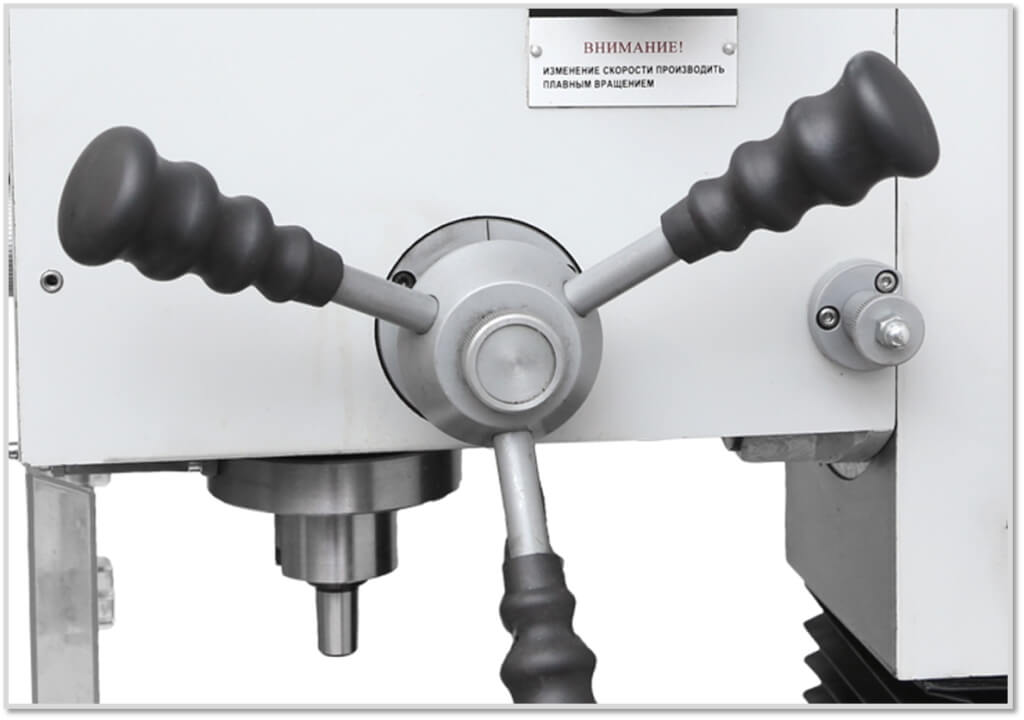Привод главного движения станка реализует вращение шпинделя в 2 диапазонах от 50 до 2250 об/мин, количество оборотов шпинделя в данных границах выбирается бесступенчато путем поворота соответствующей ручки на корпусе станка;