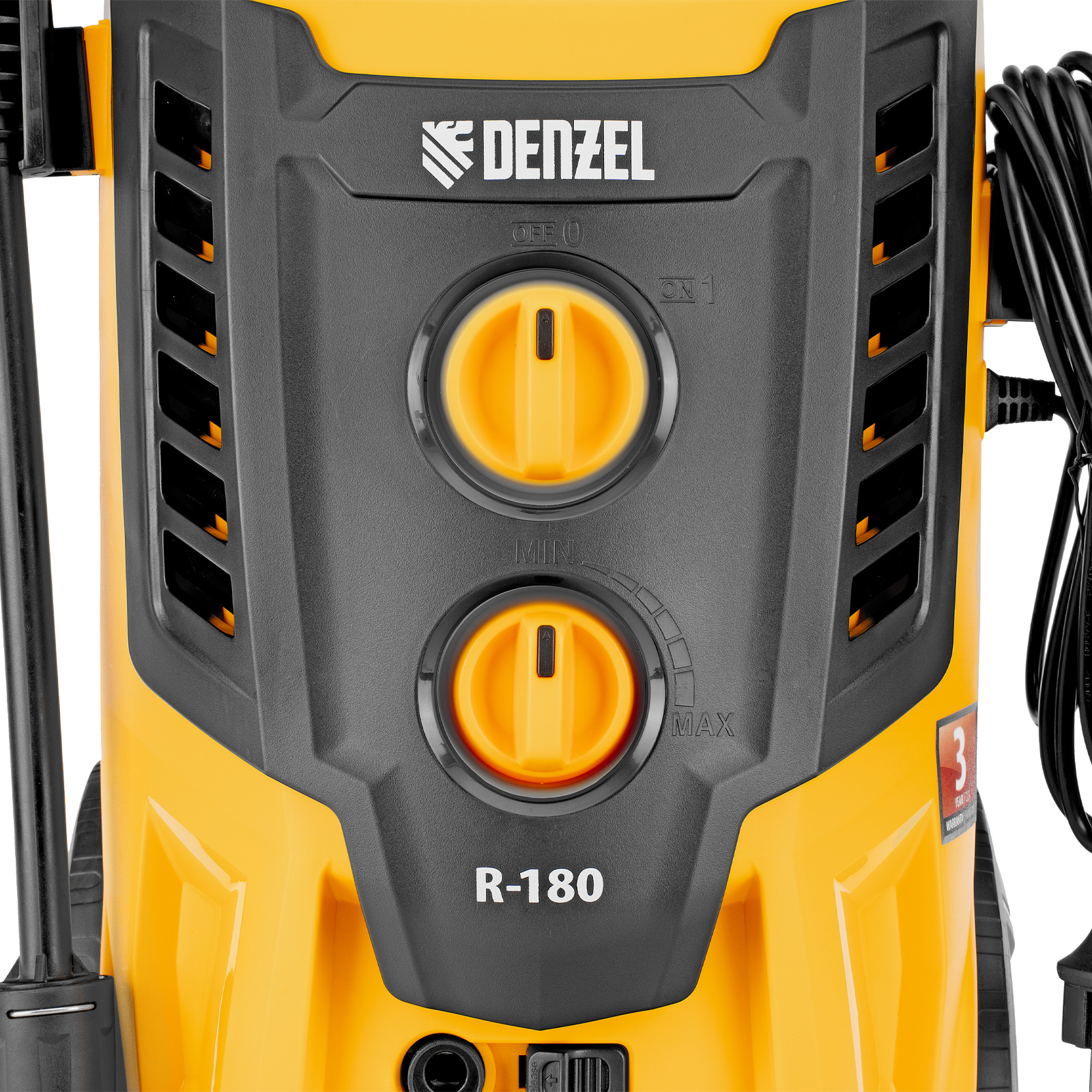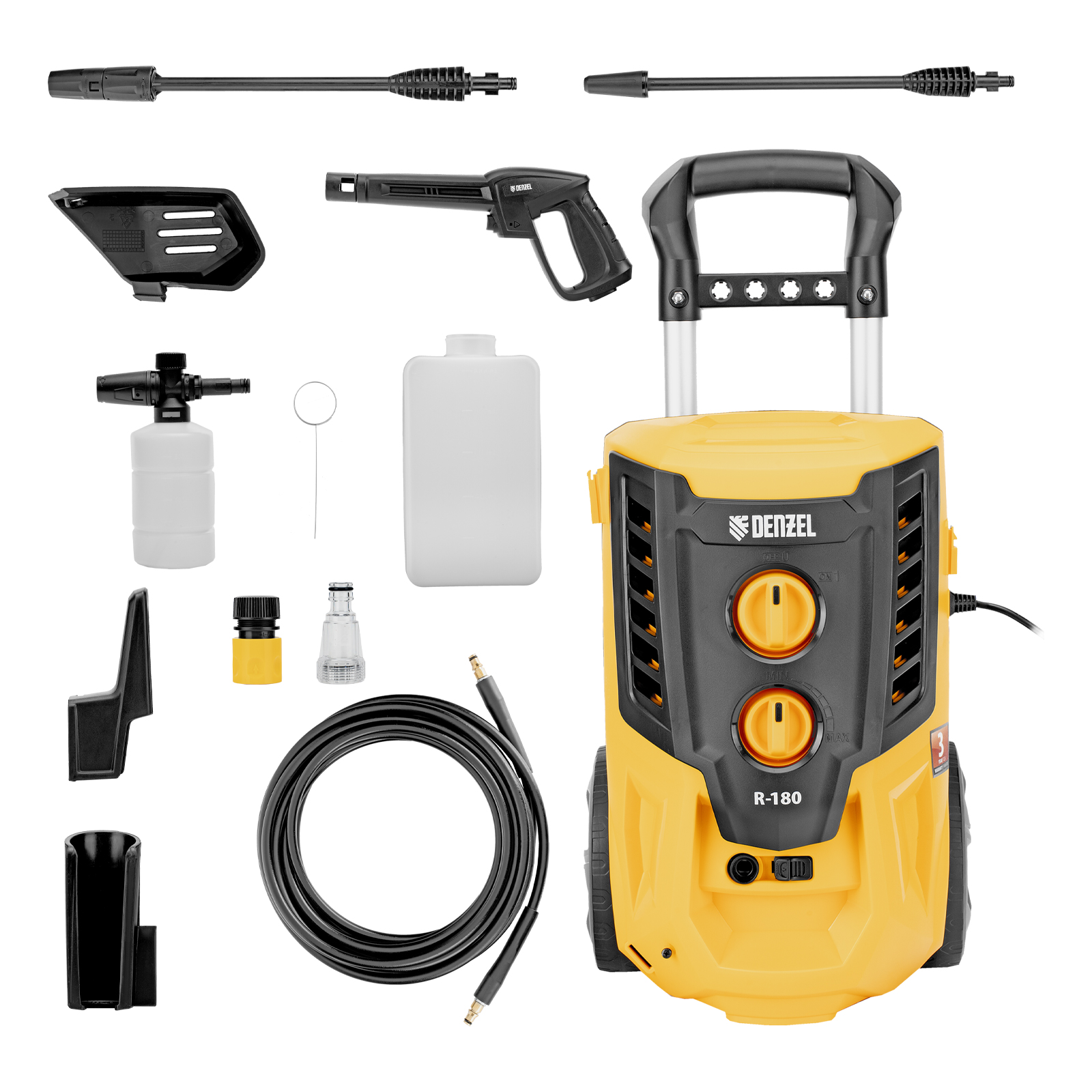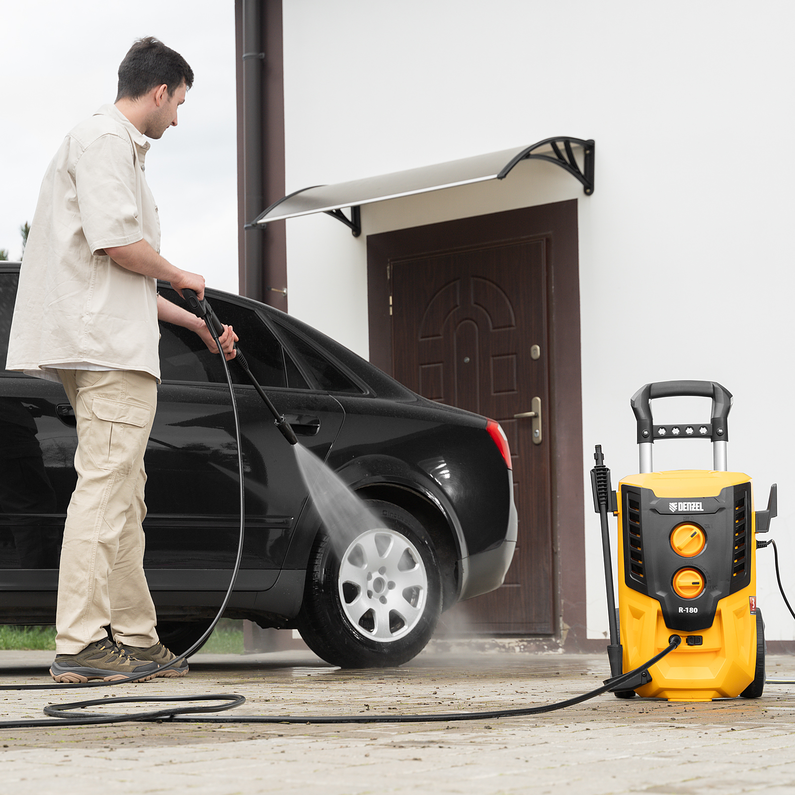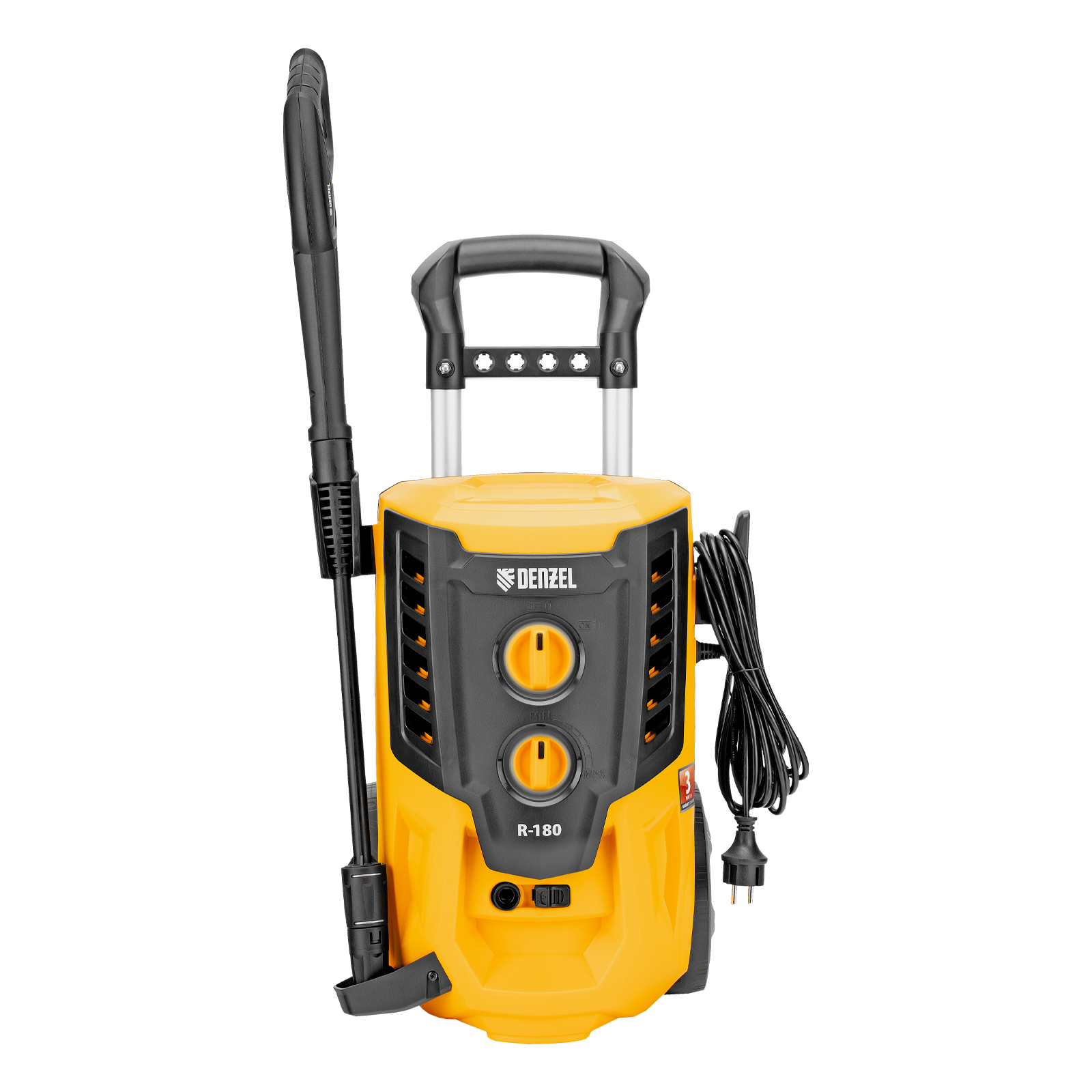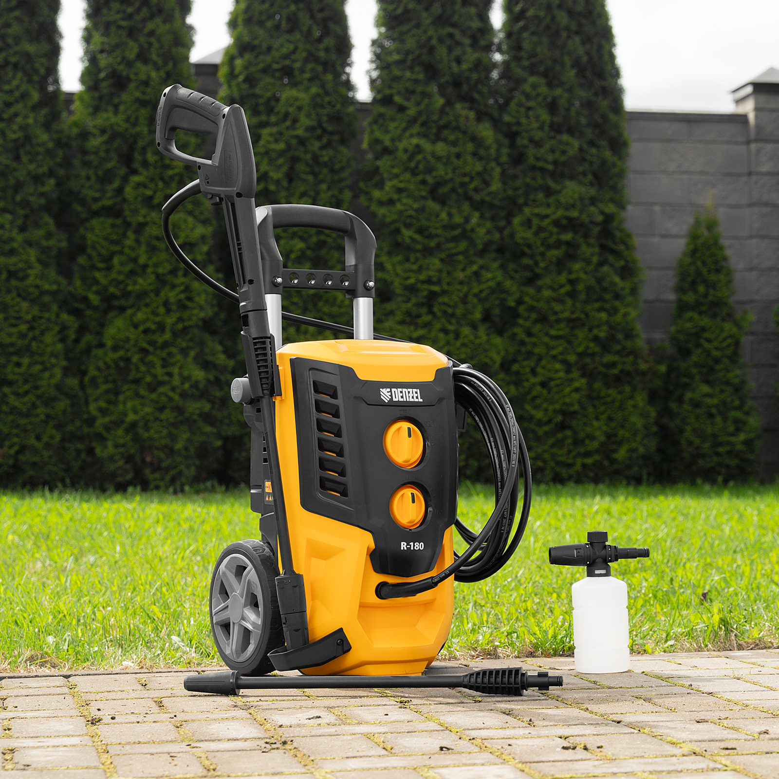 Колесная моечная машина высокого давления Denzel R-180 58238 мощностью 2200 Вт и производительностью 380 л/ч подает струю воды под давлением 180 бар и служит для очищения поверхностей. Позволяет быстро привести в порядок садовые дорожки, удалить пыль и грязь с фасада здания, автомобиля, велосипеда или мотоцикла, отмыть садовый инвентарь. Моечная машина подключается к водопроводу, а при его отсутствии может забирать воду из любого резервуара, работая в режиме самовсасывания. Устройство пригодится для поддержания порядка на загородном участке.