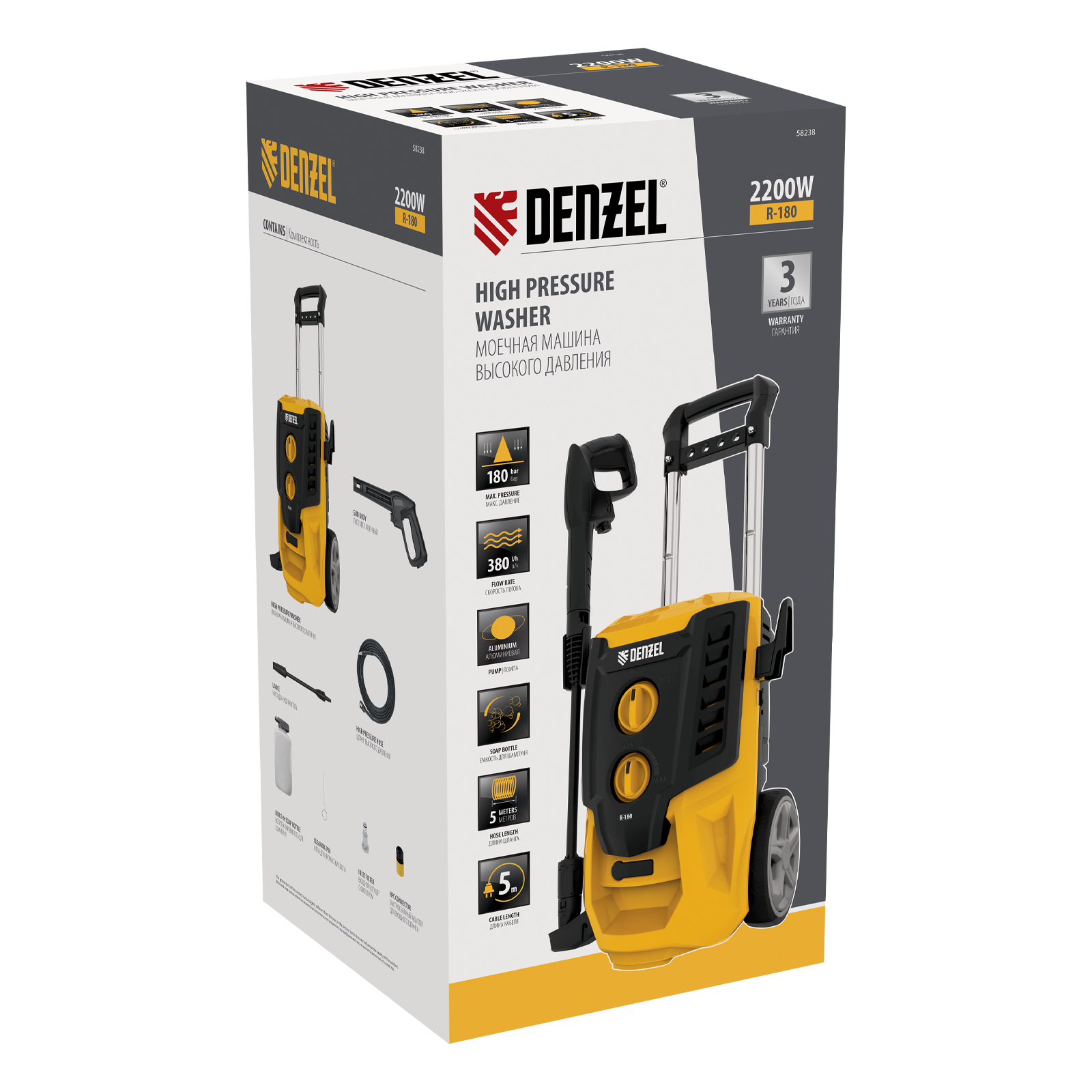 Моечная машина высокого давления R-180, 2200 Вт, 180 бар, 380 л/ч, колесная Denzel в Москве