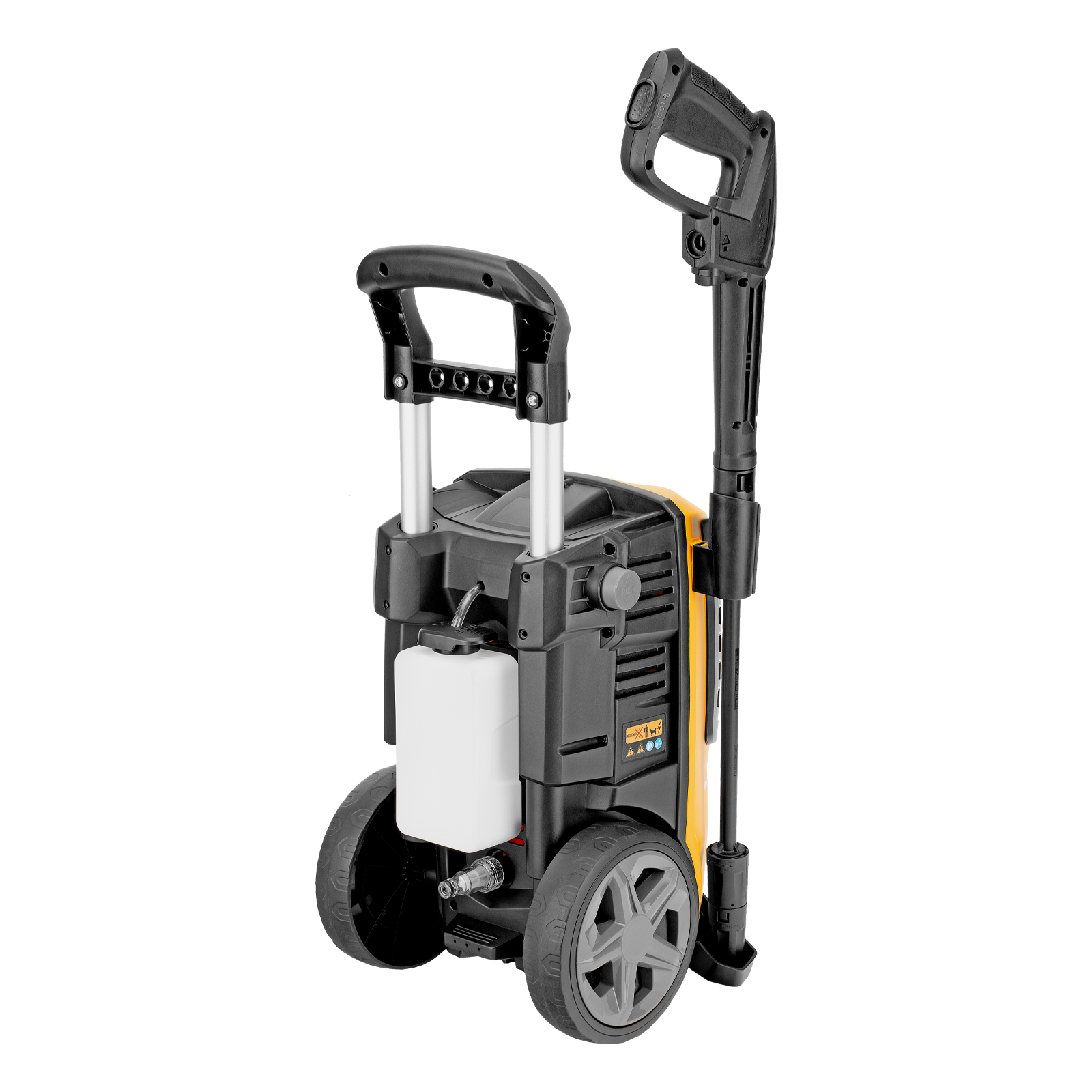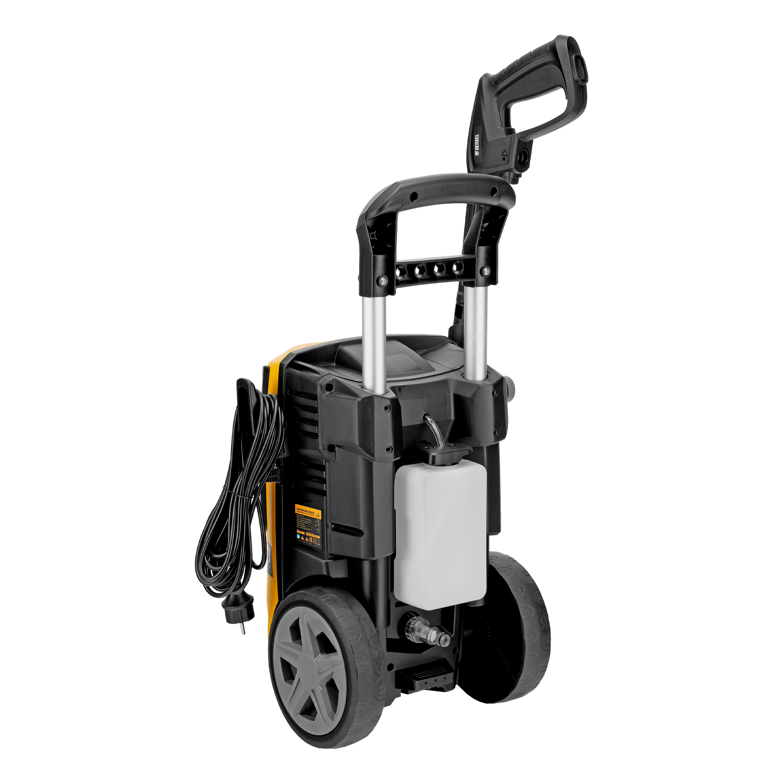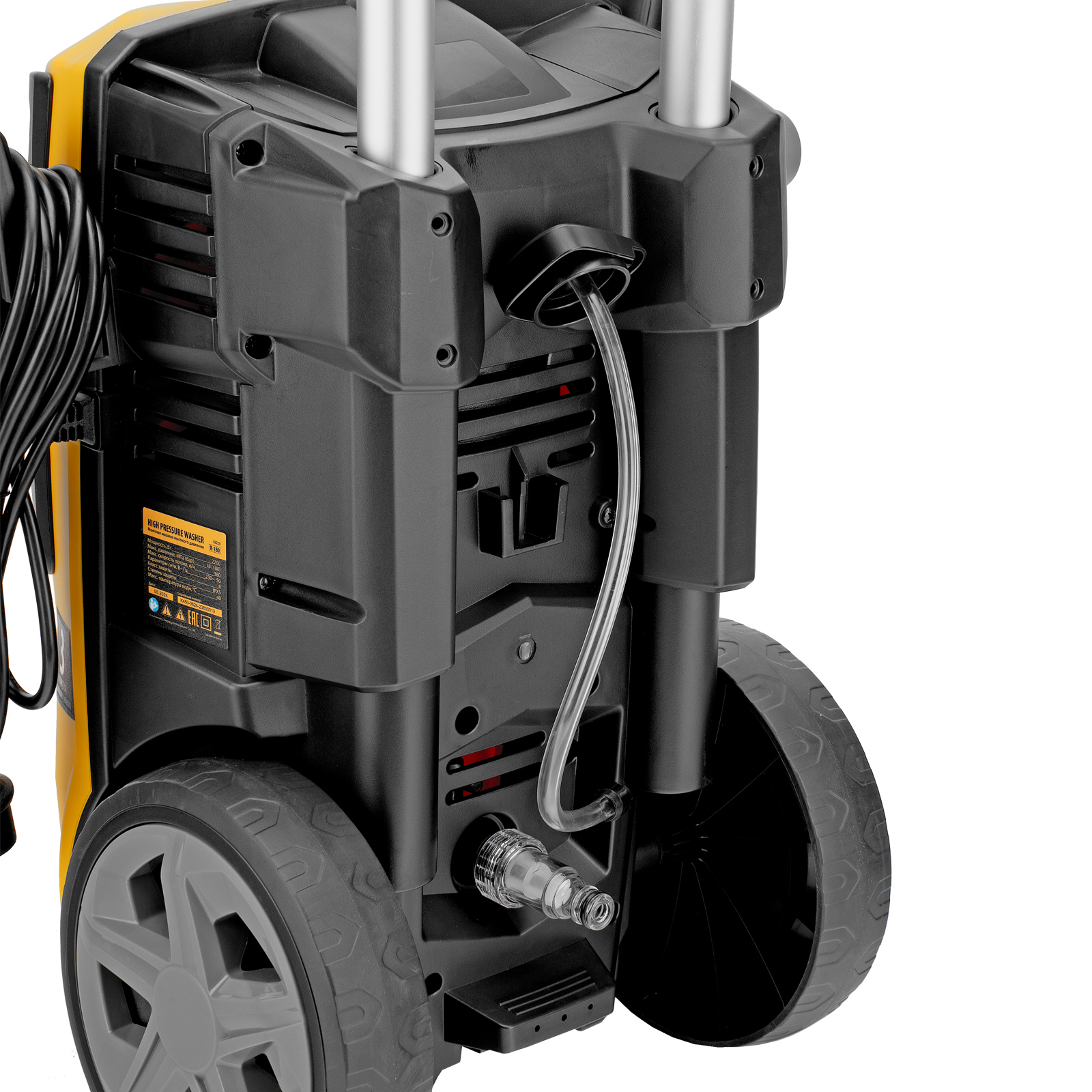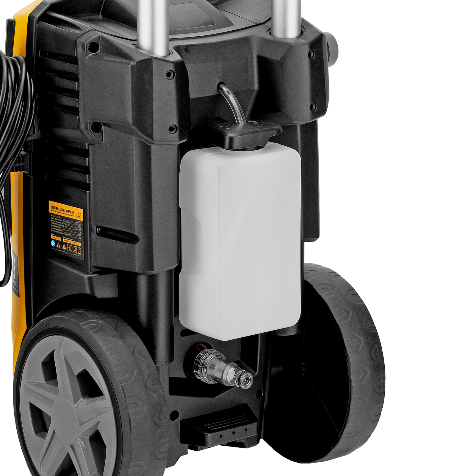 - Использование моющего средства — машина имеет встроенный бачок, также можно подключить внешний пеногенератор, входящий в комплект поставки.