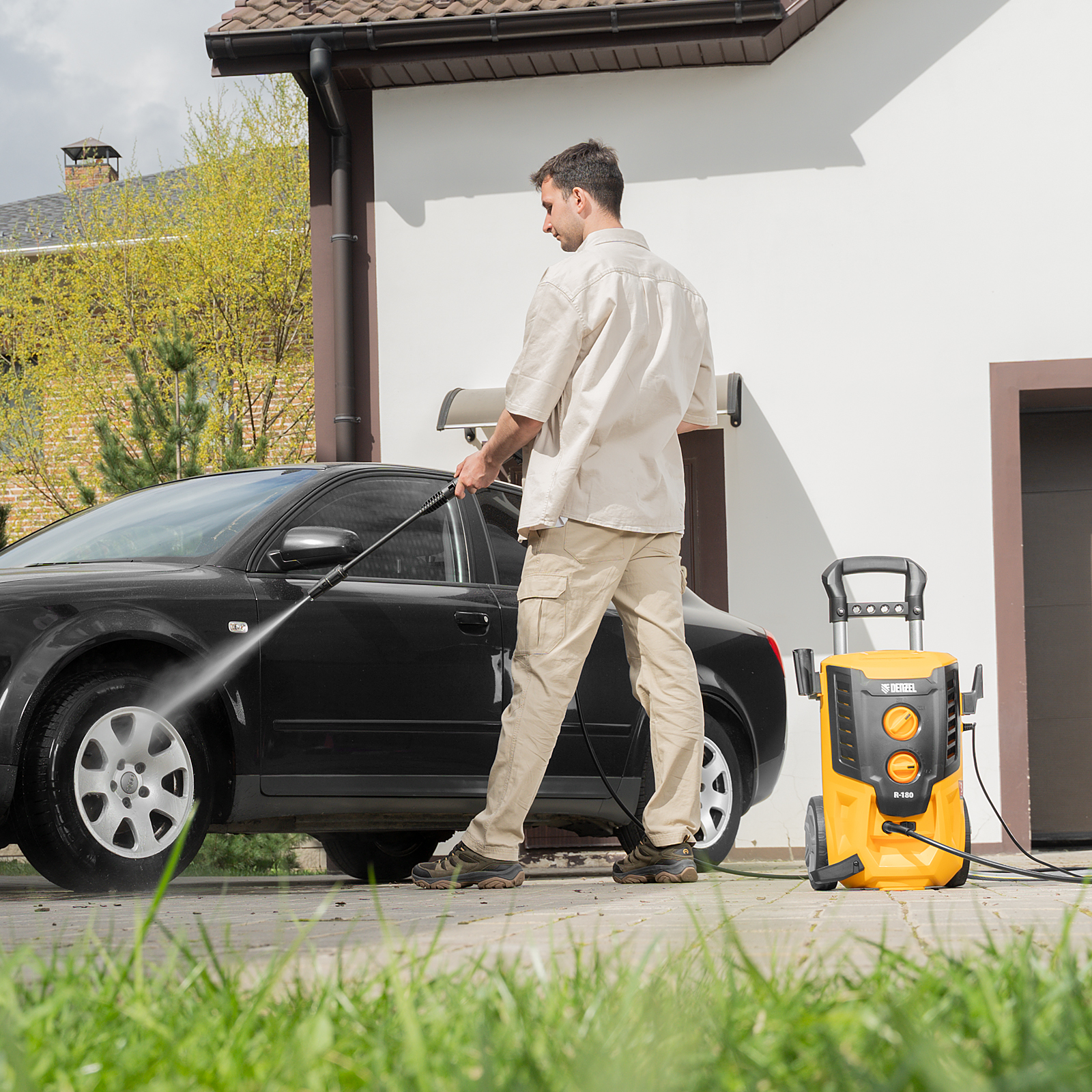 - Увеличенная рабочая зона — шланг длиной 8 м и 7-метровый кабель позволяют свободно перемещаться по участку.