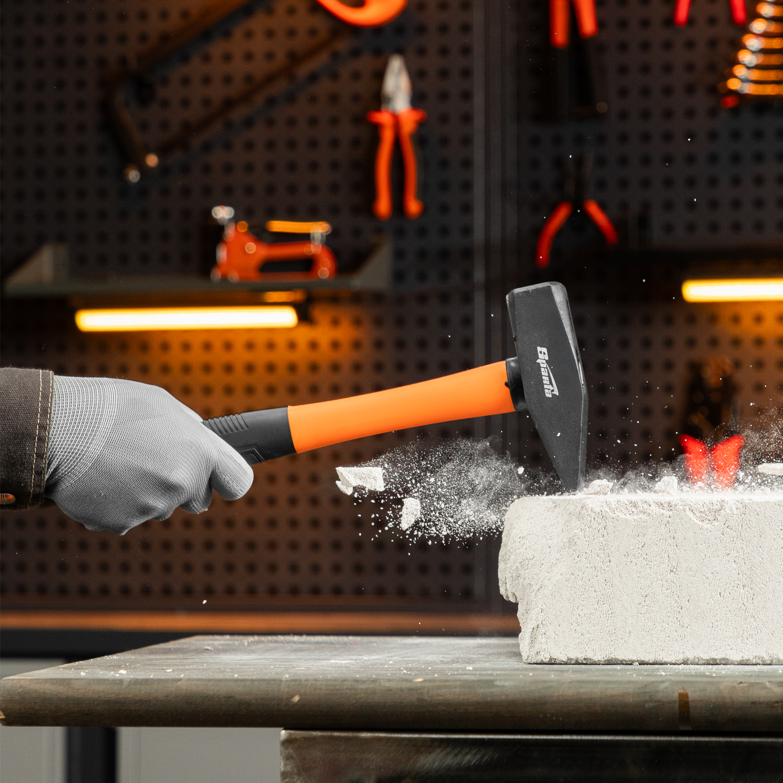 - Комфортная работа — обрезиненная фибергласовая рукоятка снижает отдачу при ударе и не выскальзывает из руки.
