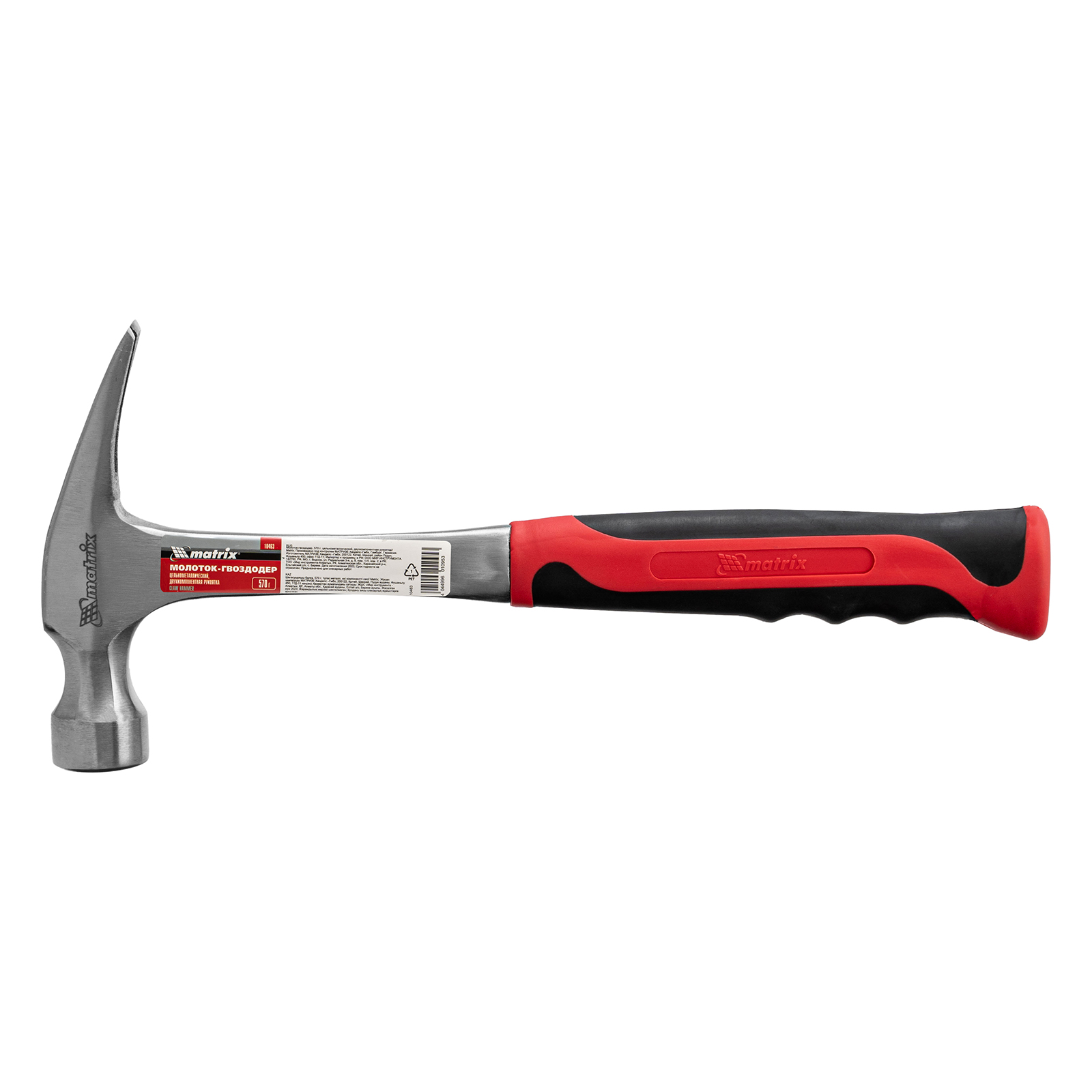 Цельнометаллический молоток-гвоздодер Matrix 10463 с рабочей головкой весом 570 г и двухкомпонентной рукояткой — ударный инструмент с функцией извлечения гвоздей. С одной стороны имеется круглый боек для нанесения ударов, а с другой — плоский изогнутый носок с клиновидной прорезью, позволяющей подцепить шляпку гвоздя. Инструмент используется в профессиональной сфере, а также подходит для решения бытовых задач.