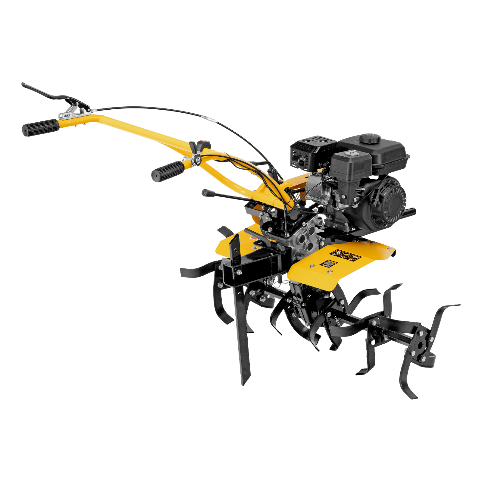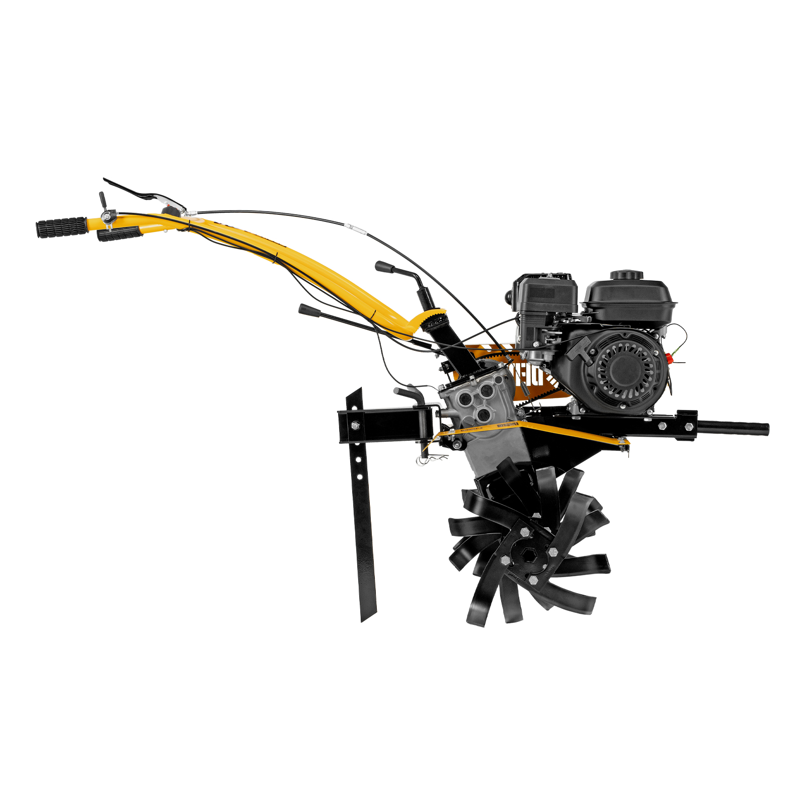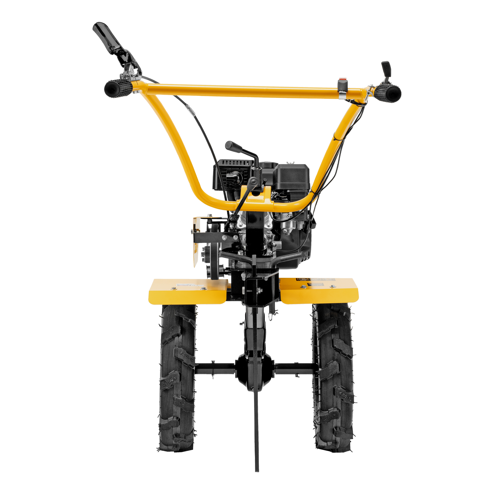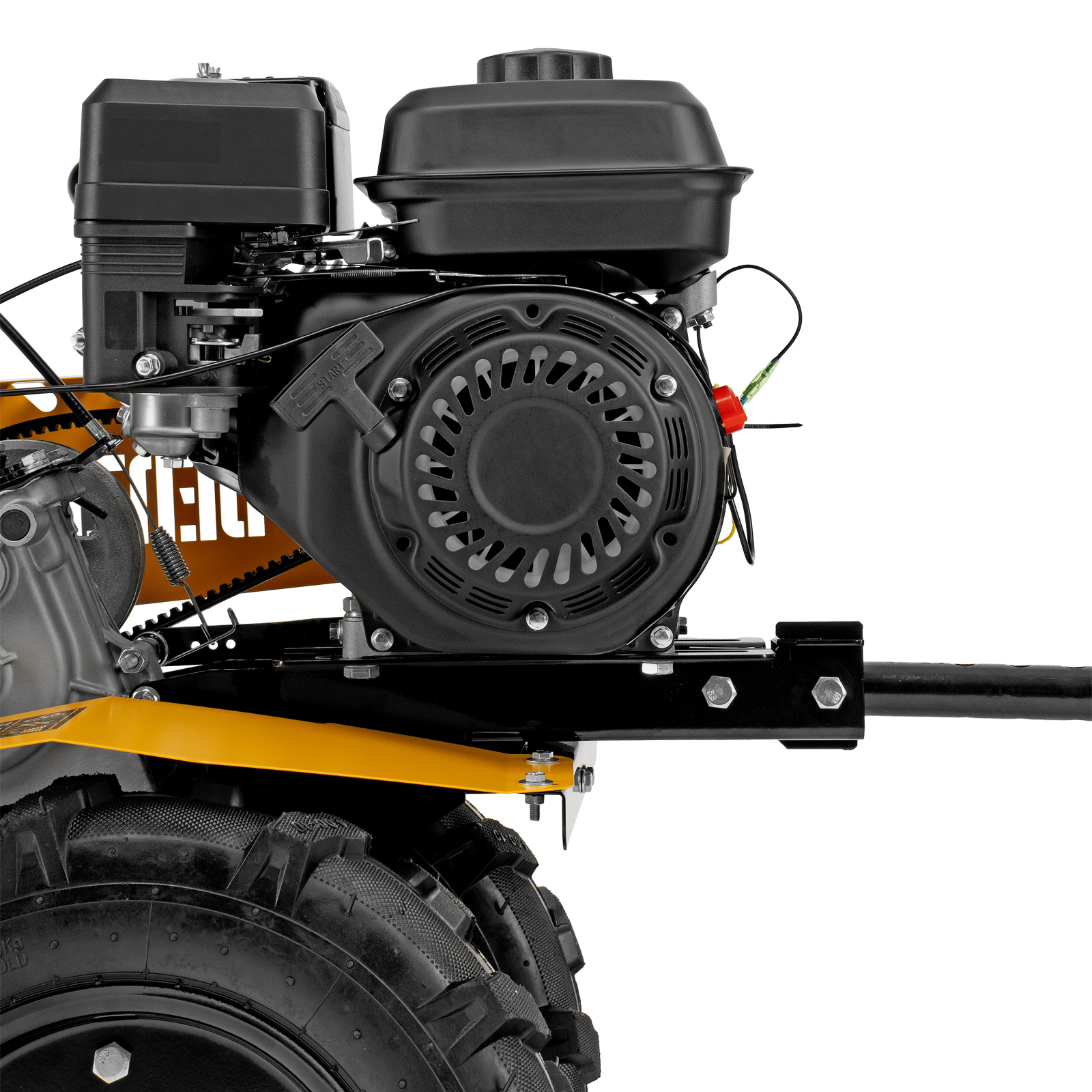 - Эффективная работа — благодаря усиленному шестеренчато-цепному редуктору с алюминиевым корпусом мотоблок успешно справляется даже с плотным, глинистым грунтом.