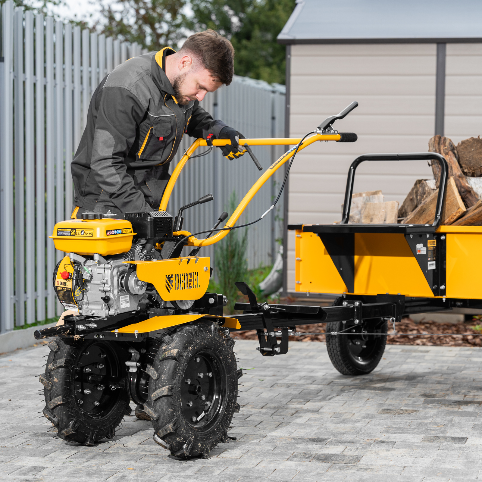 Мотоблок Denzel DPT-170S 56441 с двигателем мощностью 7 л. с., ременным механизмом сцепления, фрезами 3 х 4, шкивом отбора мощности (ШОМ) и коробкой передач 2В/1Н предназначен для проведения сельскохозяйственных работ. Максимальная ширина обработки составляет 1000 мм, глубина — 350 мм. Фрезы собираются из двух двойных и двух одинарных секций, что позволяет регулировать ширину вспашки. ,Шкив отбора мощности и универсальный кронштейн диаметром 30 мм позволяют установить любое навесное оборудование Denzel, например. плуг, окучник, картофелевыкапыватель. Такое решение значительно расширяет возможности мотоблока и позволяет минимизировать расходы на закупку сельскохозяйственной техники.