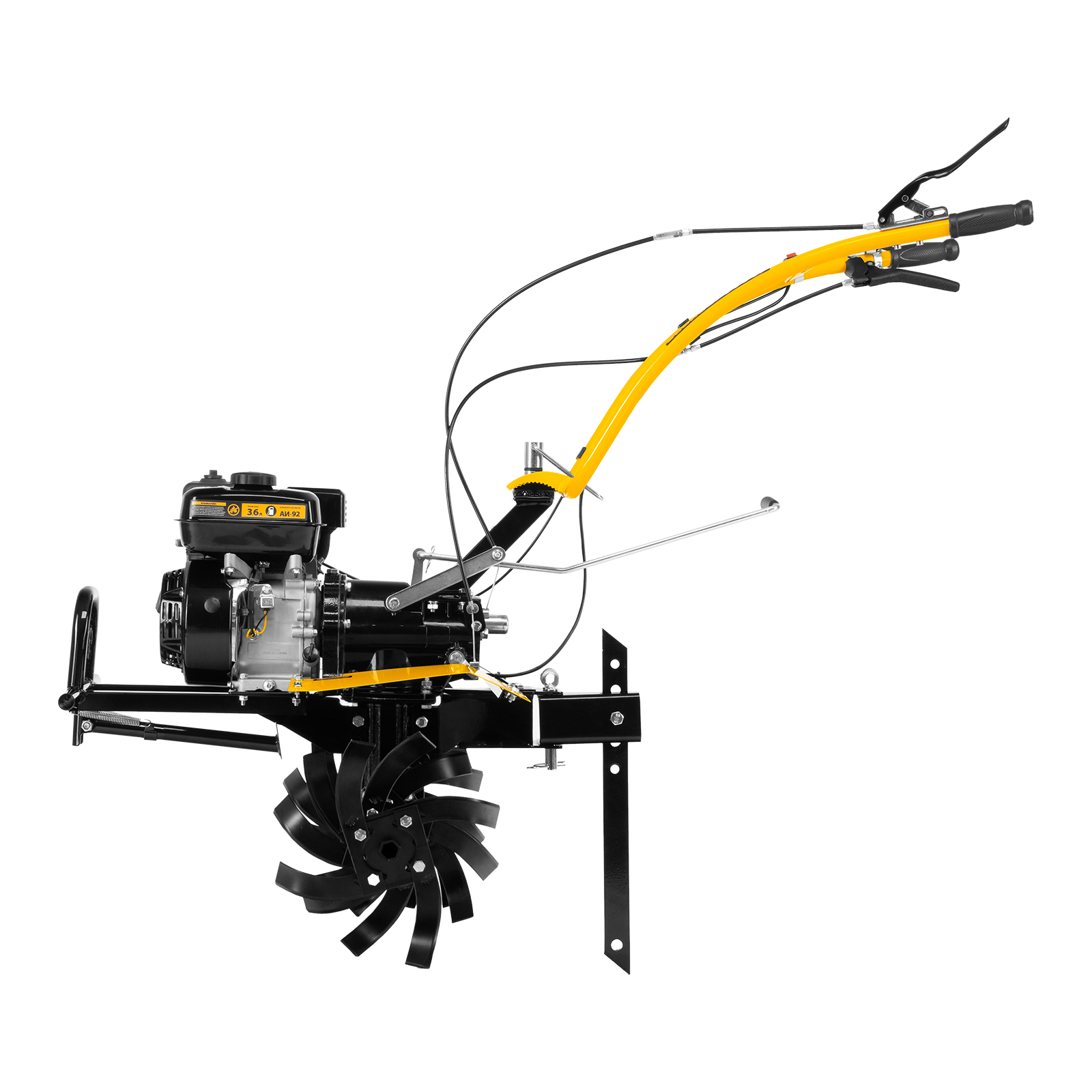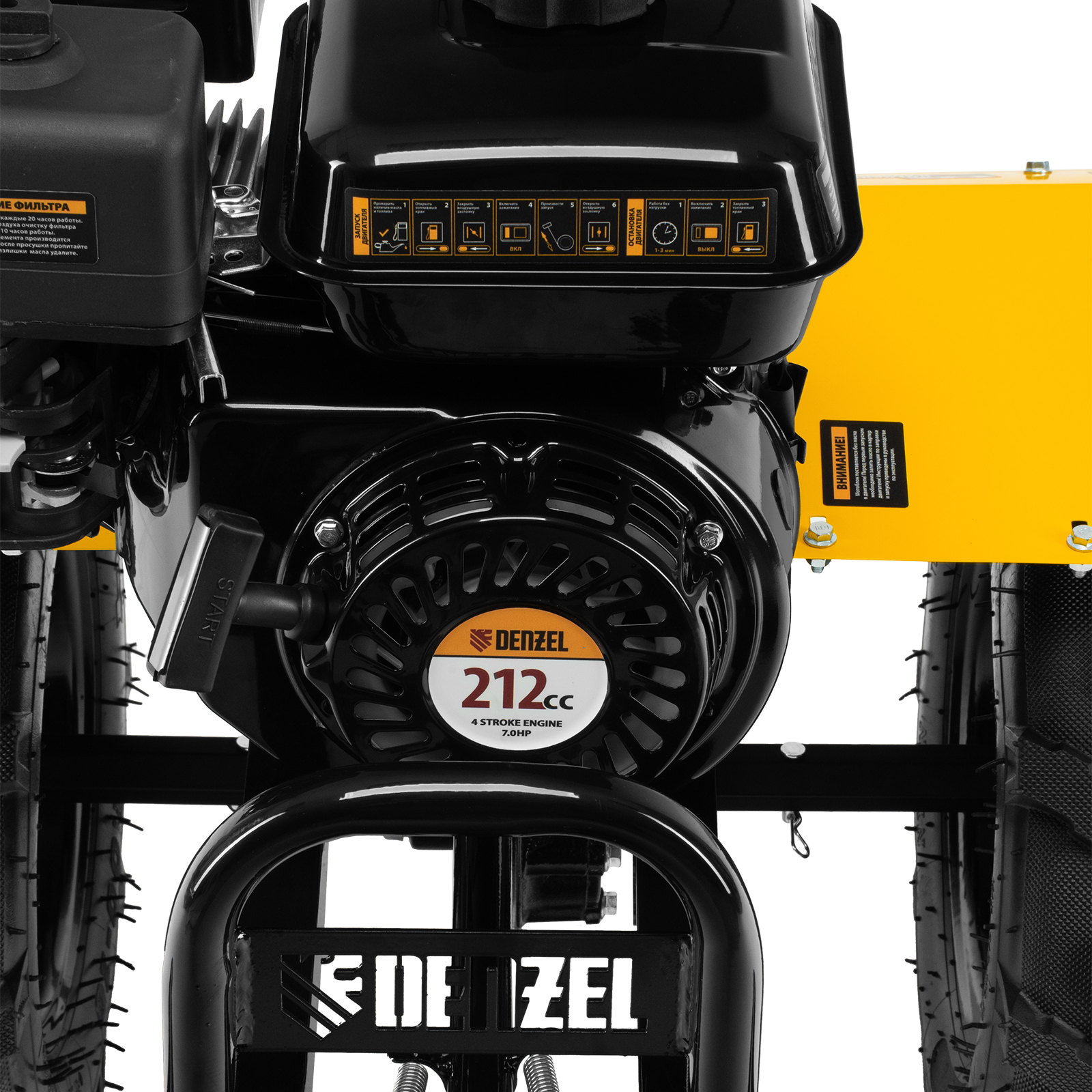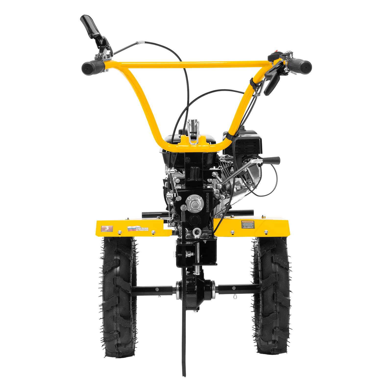 - Комфортное управление — регулятор оборотов двигателя и кнопка пуска выведены на рукоятку перед оператором, поэтому можно оперативно менять режим вспашки, не наклоняясь.