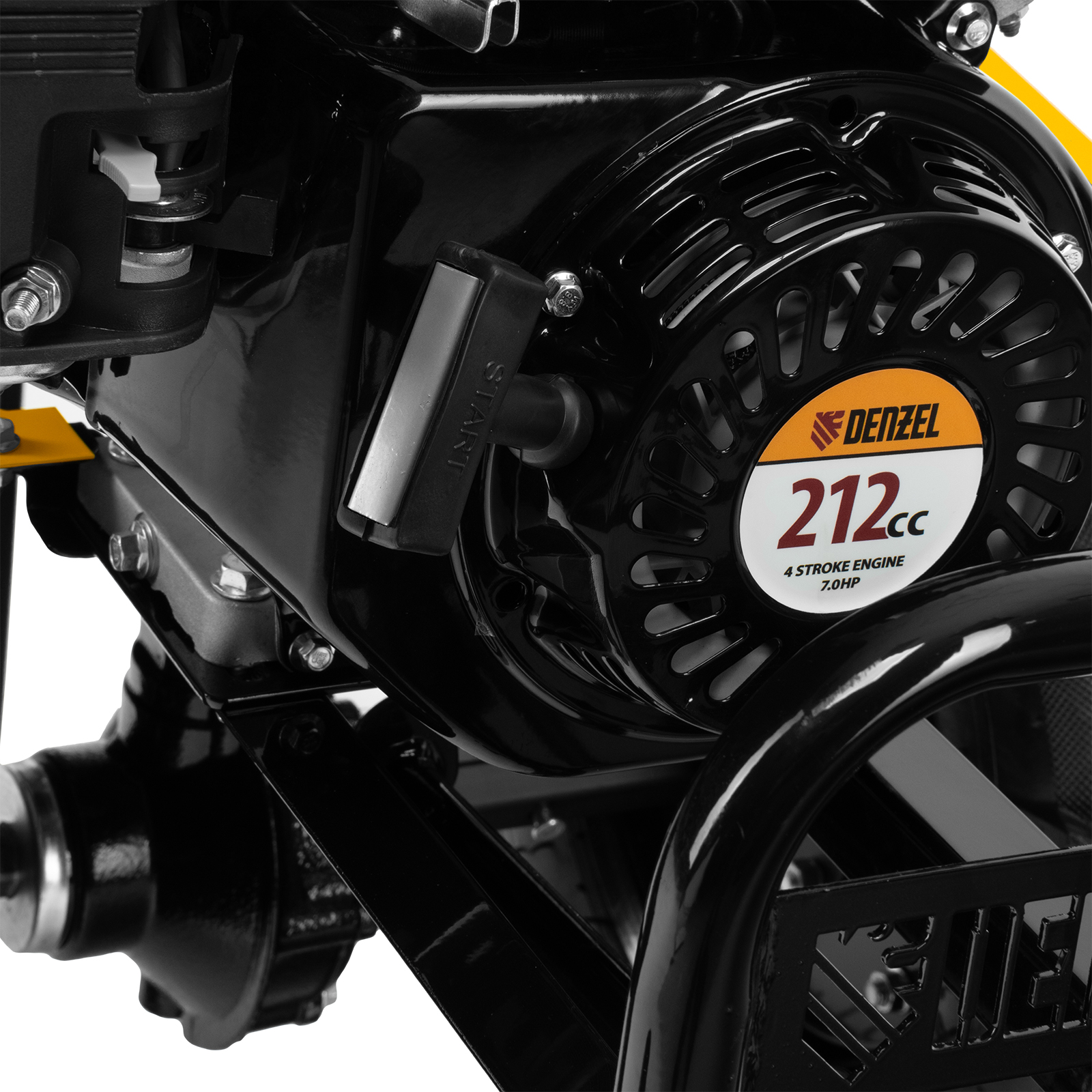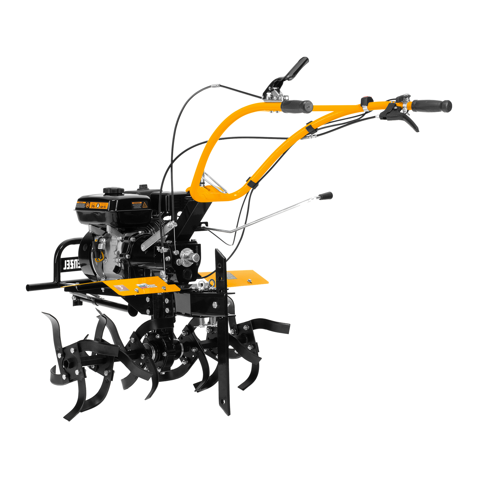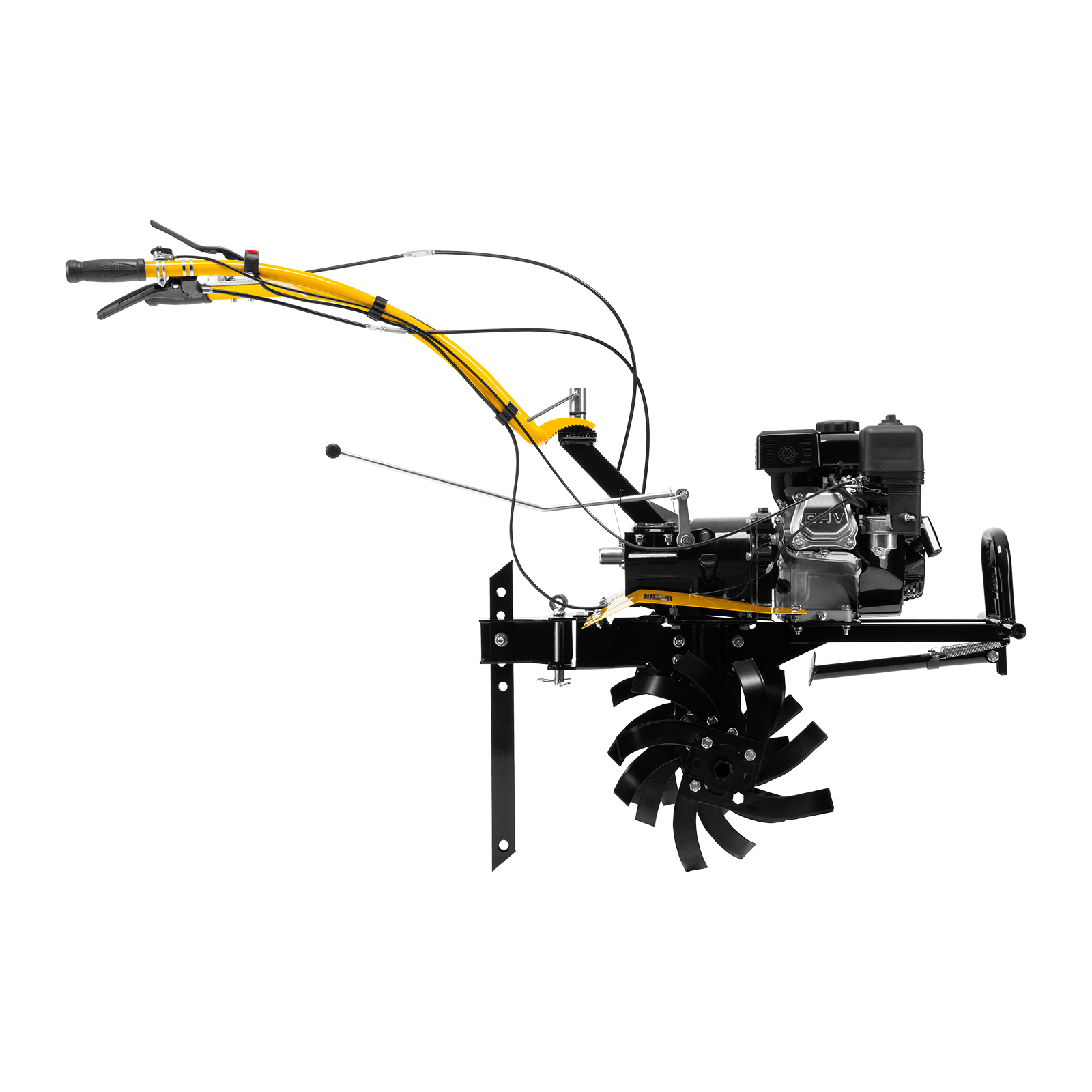 - Комфортное управление — регулятор оборотов двигателя и кнопка пуска выведены на рукоятку перед оператором, поэтому можно оперативно менять режим вспашки, не наклоняясь.