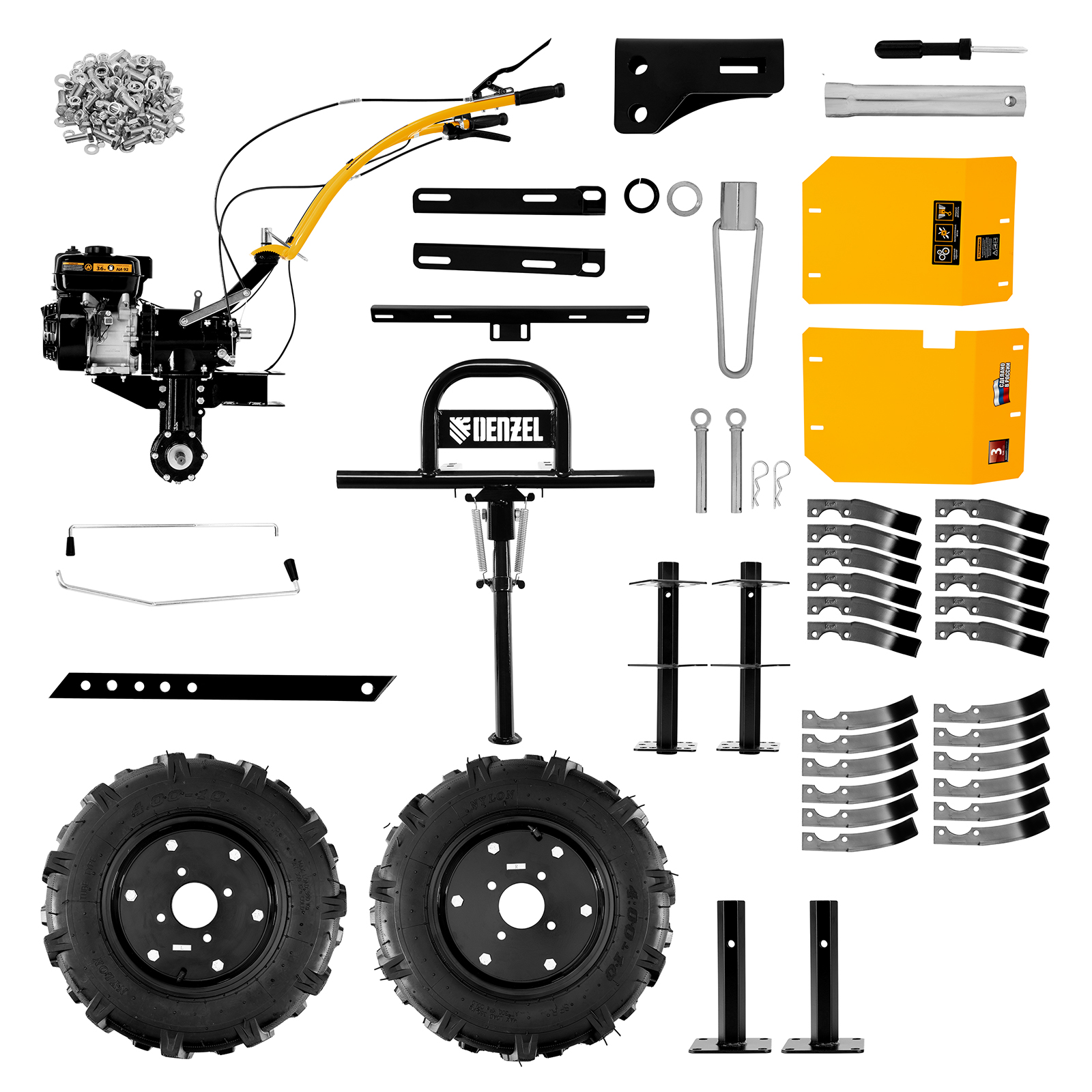 Мотоблок - 1 штКолесо - 2 шт, ось крепления колеса - 2 штКомплект фрез - 1 шт, комплект осей для крепления фрез - 1 штСошник - 1 шт, сцепка сошника - 1 штРукоятка транспортировочная - 1 штКрыло защитное - 2 штПередняя соединительная планка крыльев - 1 штЗадняя соединительная планка крыльев - 1 штРычаг переключения передач - 1 штФиксатор руля управления - 1 штКомплект крепежа - 1 штРуководство по эксплуатации с гарантийным талоном - 1 шт |