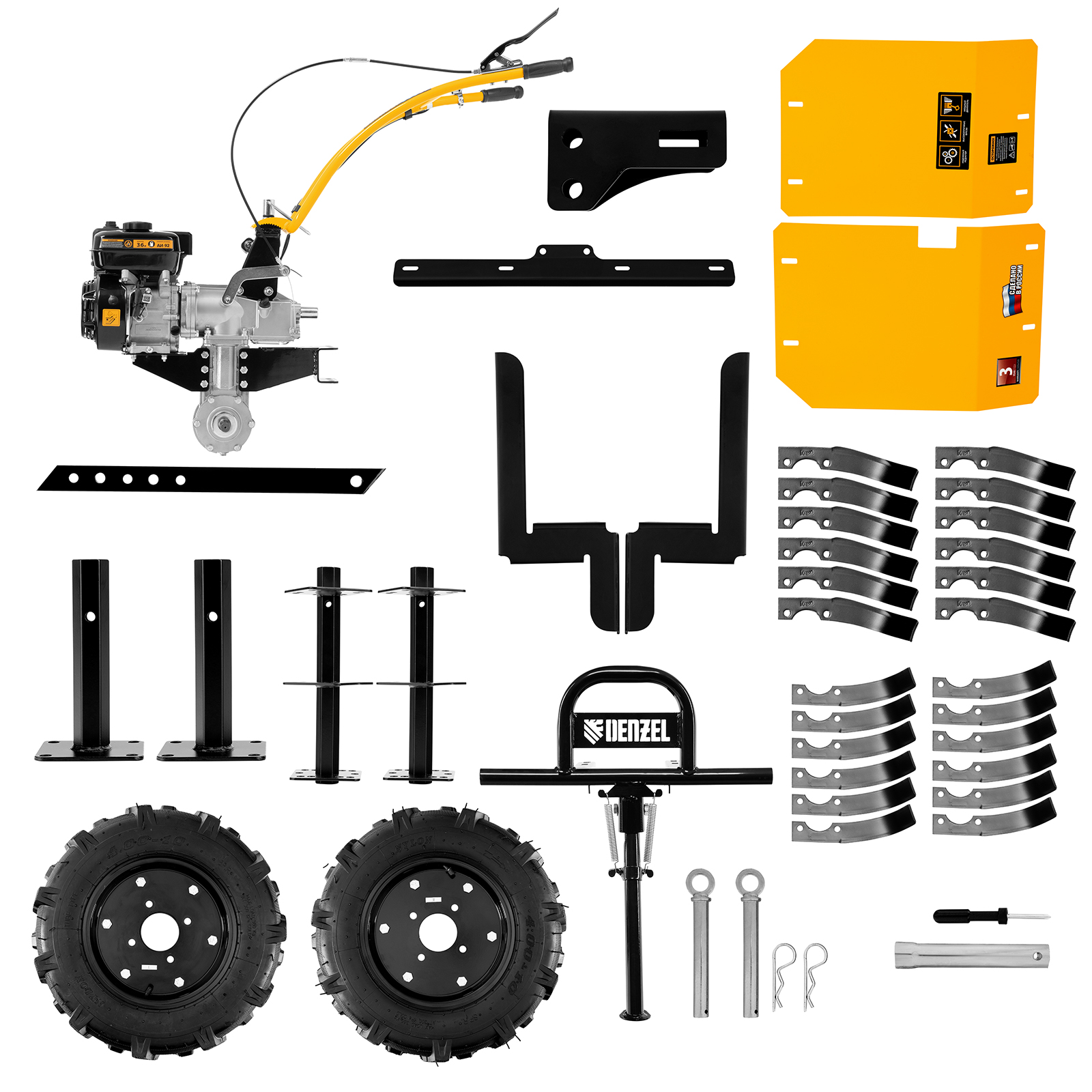 Мотоблок Denzel 56406 DPT-370X мощностью 7 л.с., с дисковым сцеплением, фрезами 3 х 4, валом отбора мощности (ВОМ), передачами 3В/1Н, имеет ширину вспахивания 90 см и глубину обработки 35 см. Предназначен для обработки почвы: рыхления, боронования, выравнивания, прополки и выполнения других задач на приусадебных и садовых участках, уверенно справляется с плотной глинистой почвой.,Мощный и экономичный одноцилиндровый четырехтактный двигатель Denzel серии Long Life с рабочим объемом 212 см3 отличается надежностью и продолжительным ресурсом. Многодисковый механизм сцепления обеспечивает передачу высокого крутящего момента на колеса. Мотоблок предназначен для работы на большой территории и широко используется в быту.