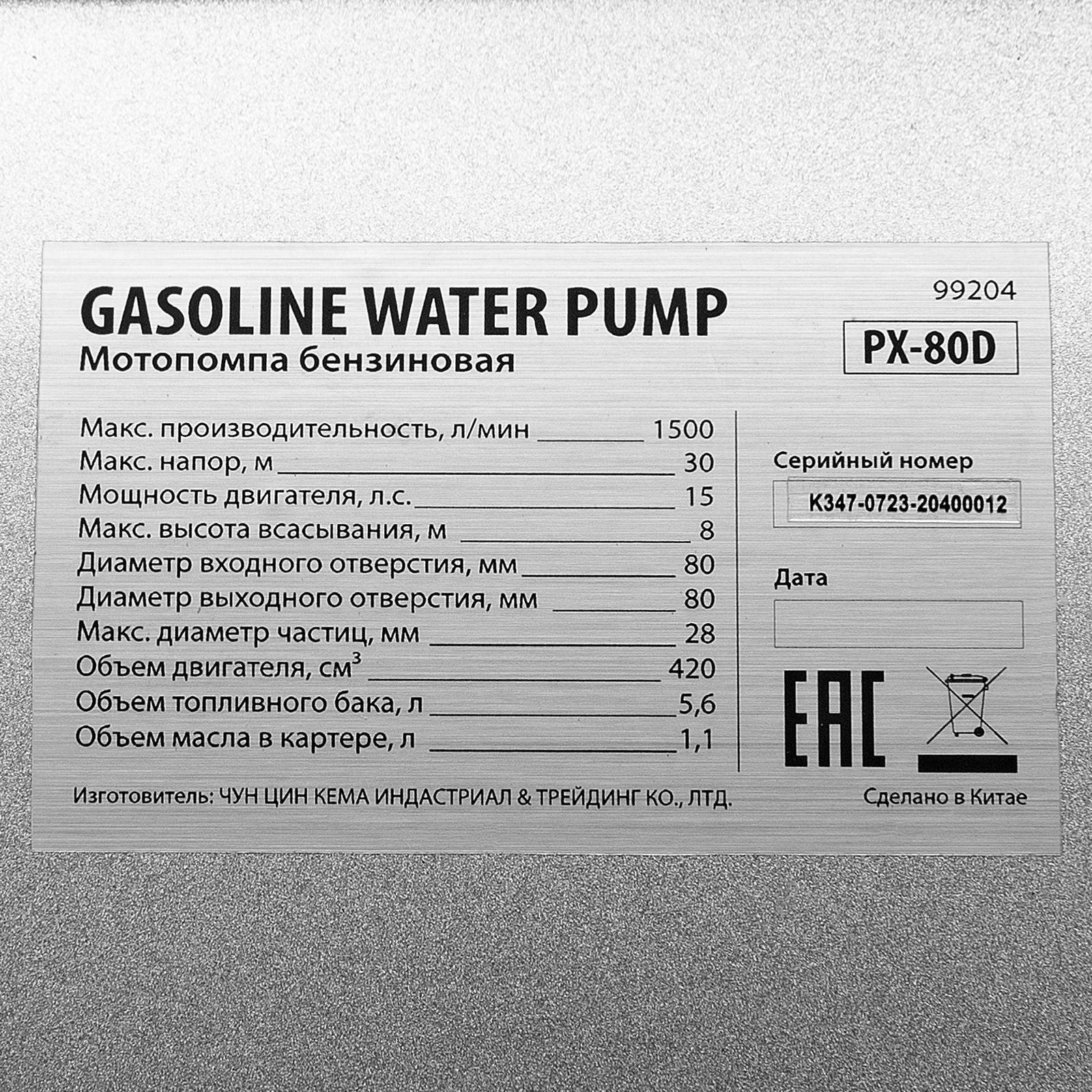 Бензиновая мотопомпа Denzel PX-80D 99204 с двигателем мощностью 15 л. с. и штуцерами диаметром 3 дюйма обеспечивает напор 30 м и применяется для откачки грязной воды со скоростью 1500 л/мин из затопленных помещений, а также котлованов, траншей, погребов, колодцев глубиной до 8 м. Оптимальна для проведения земляных работ, т. к. может работать с грязной водой, содержащей фракции размером до 28 мм. Используется также для подачи чистой воды на стройку, небольшое предприятие, на дачный участок и в систему полива.