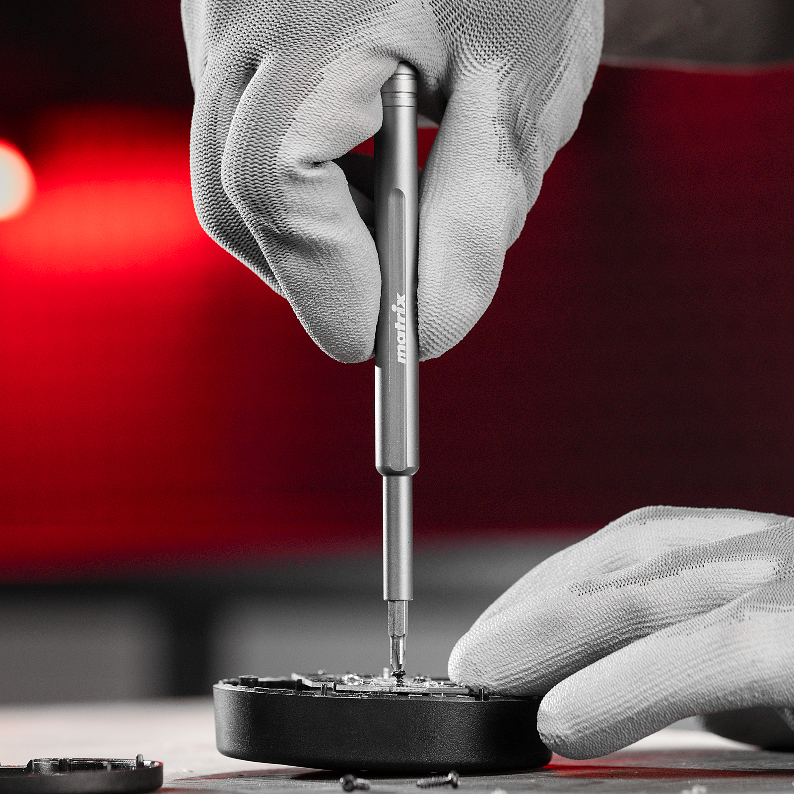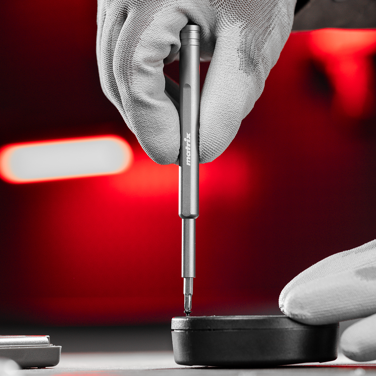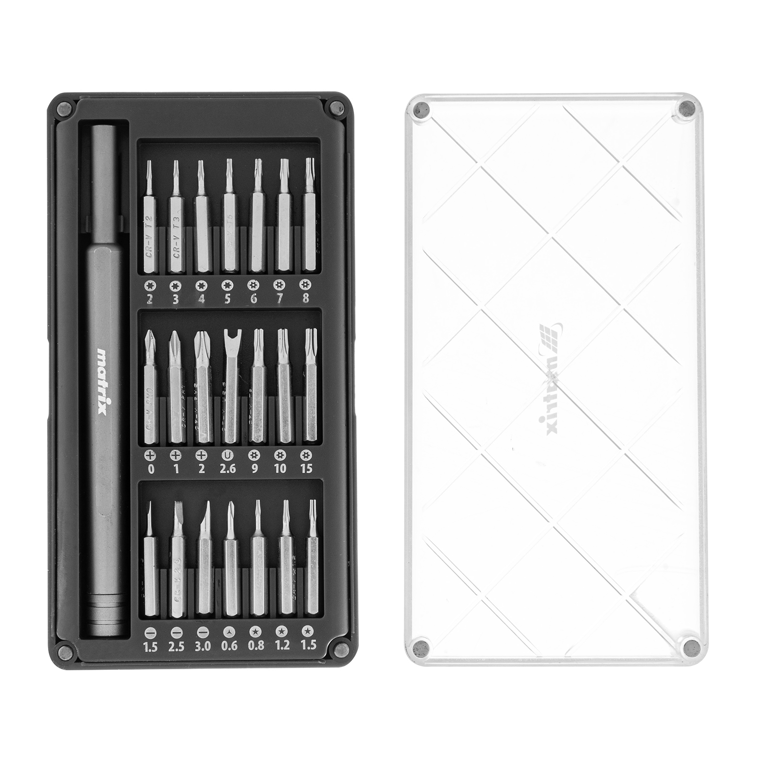 Универсальный набор для точных работ Matrix 13566 22 в 1 содержит 21 биту под шлицы PH, SL,T, H, Str, Y и U, а также отвертку-держатель. Вращающийся затыльник позволяет поворачивать отвертку перебором пальцев, что упрощает работу с мелким крепежом. При помощи входящих в набор инструментов можно отремонтировать очки, игрушки, портативную и бытовую технику и т.д.