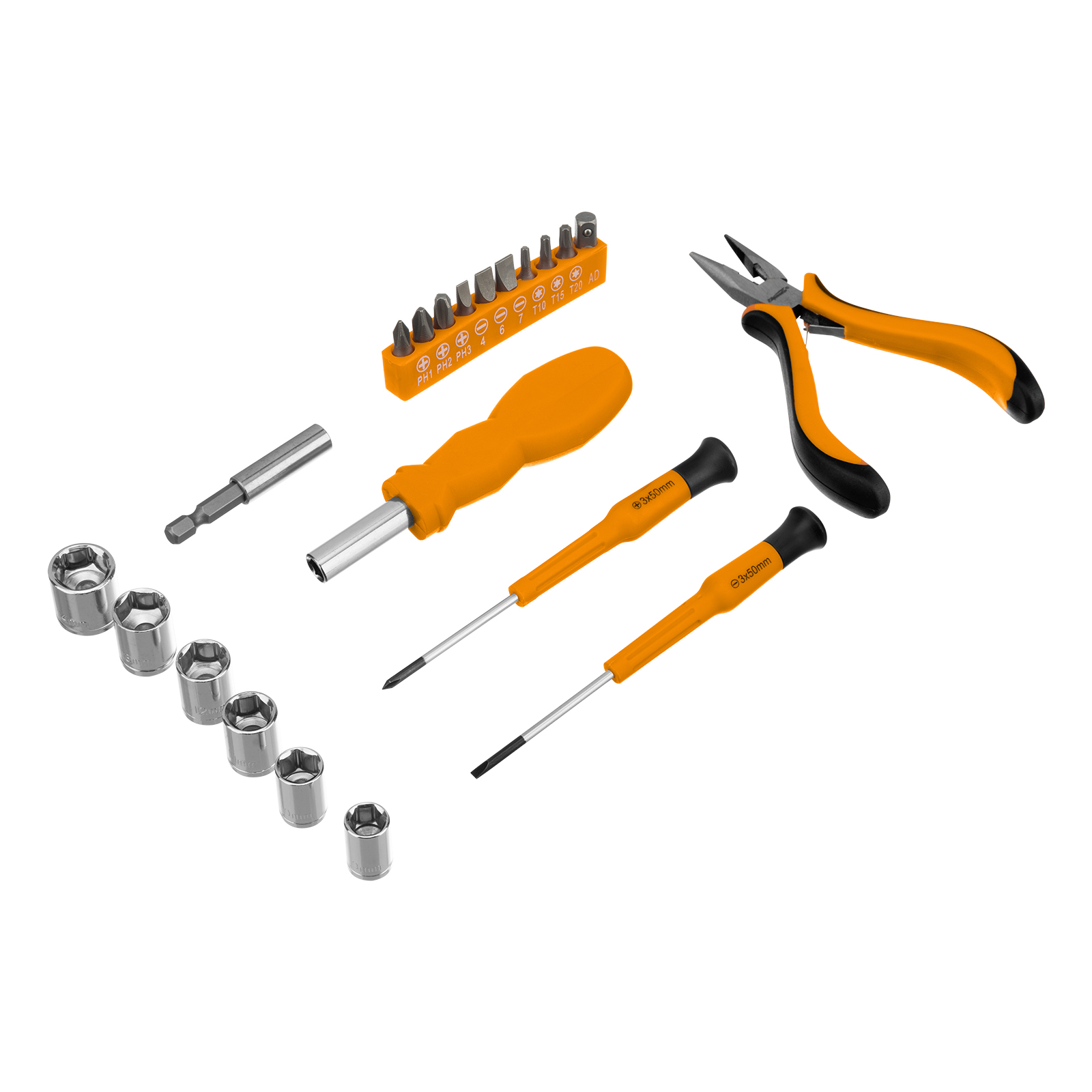 Длинногубцы - 1 штГоловки 9, 10, 11, 12, 13, 14 - 6 штОтвертки для точных работ SL, PH - 2 штОтвертка для бит - 1 штАдаптер для бит - 1 штБиты PH, SL, T - 9 штДержатель для бит с магнитом - 1 штКейс - 1 штГоловки - 1 штПассатижи - 1 шт |