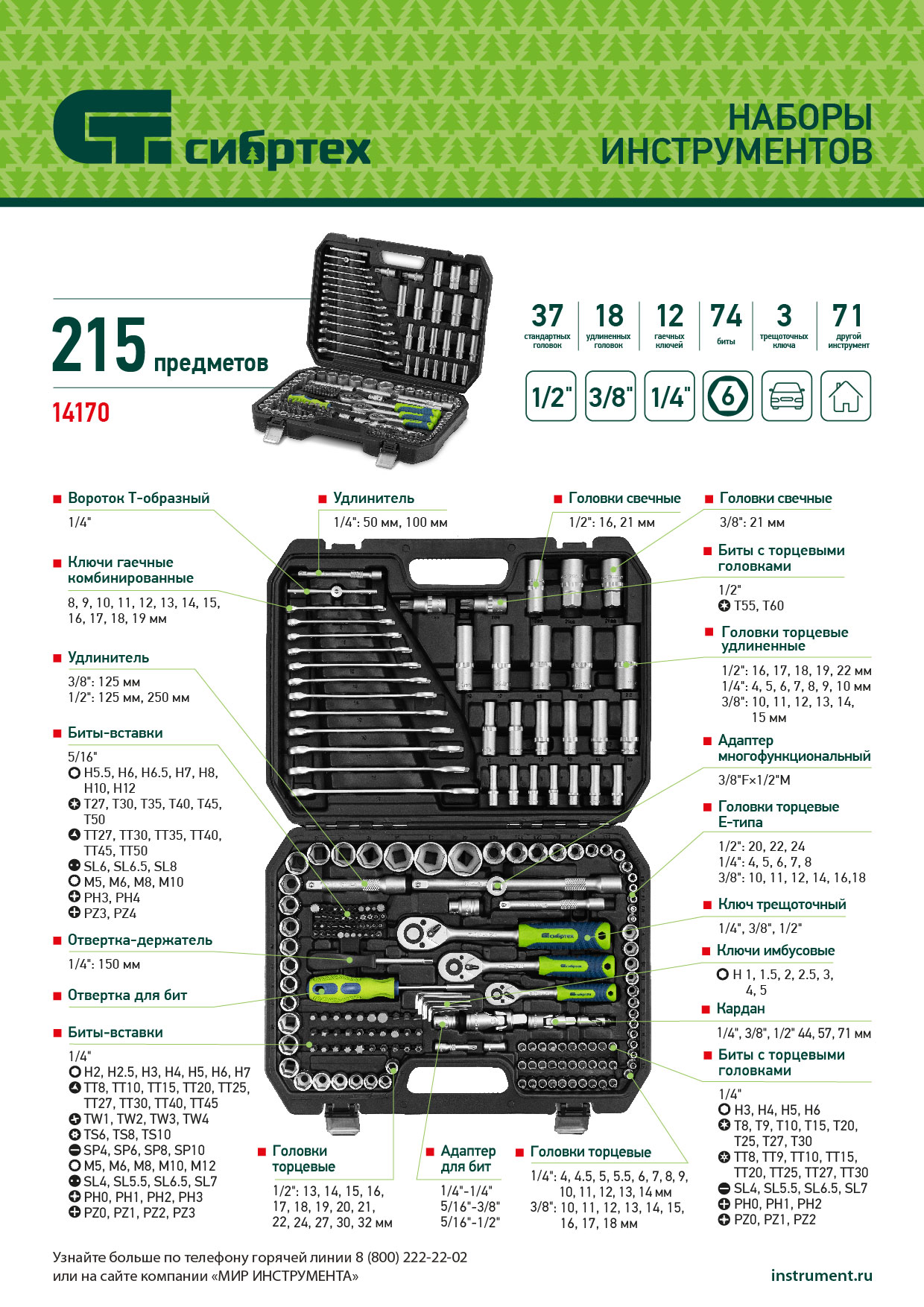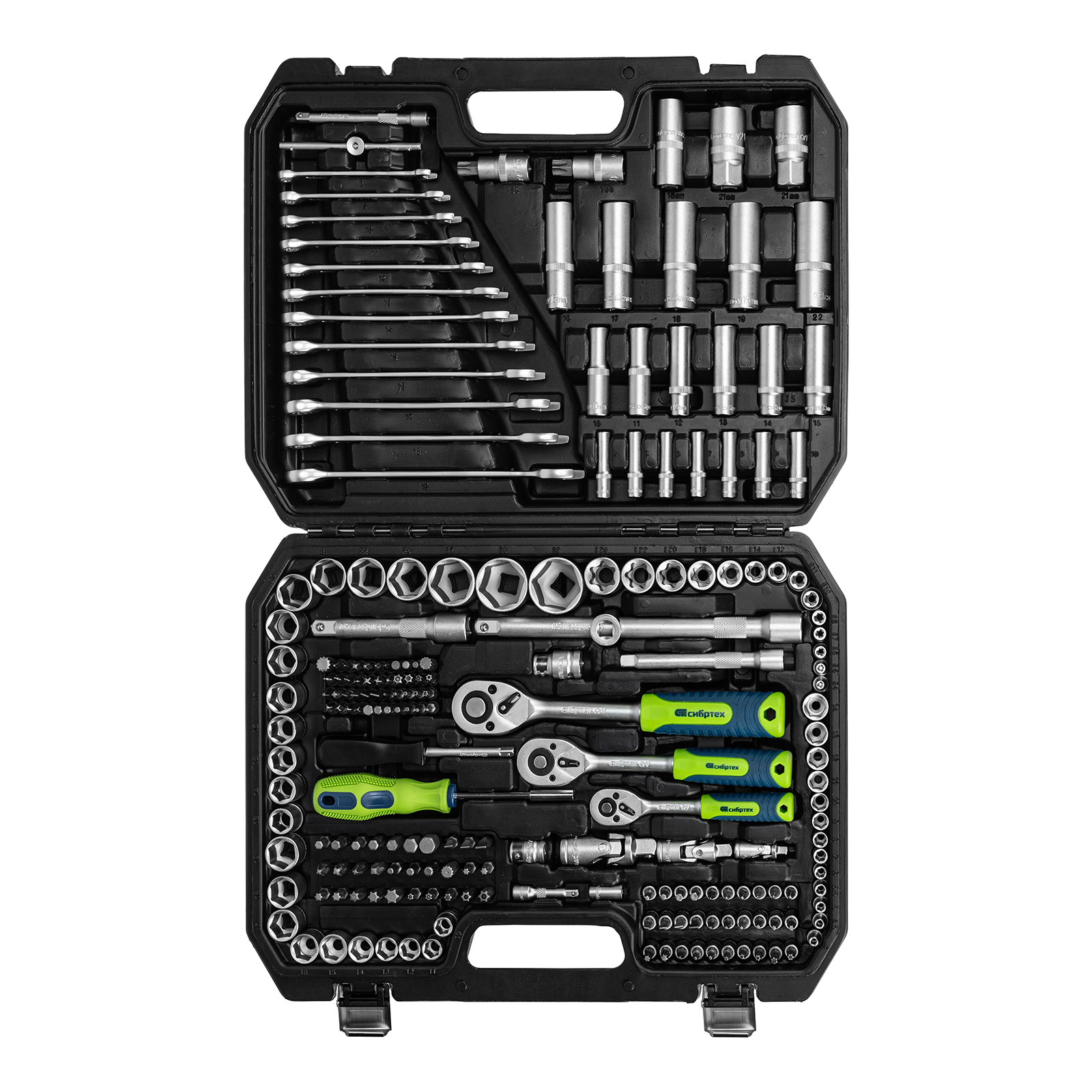 Набор инструментов Сибртех 14170 упакован в пластиковый кейс и состоит из 215 предметов с присоединительным размером 1/2", 3/8", 1/4", предназначенных для монтажа и демонтажа резьбового крепежа с разными типами шлицев. В комплект поставки входят карданы, удлинители и переходники, облегчающие работу в труднодоступных местах. Набор используется для ремонта автомобилей, а также будет полезен в быту.