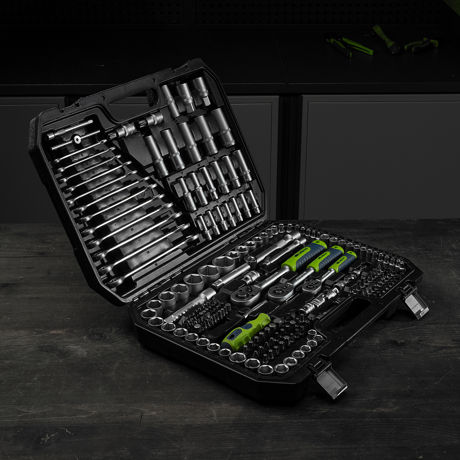 - Удобное хранение и транспортировка — инструменты и насадки упакованы в ударопрочный пластиковый кейс с металлическими замками.