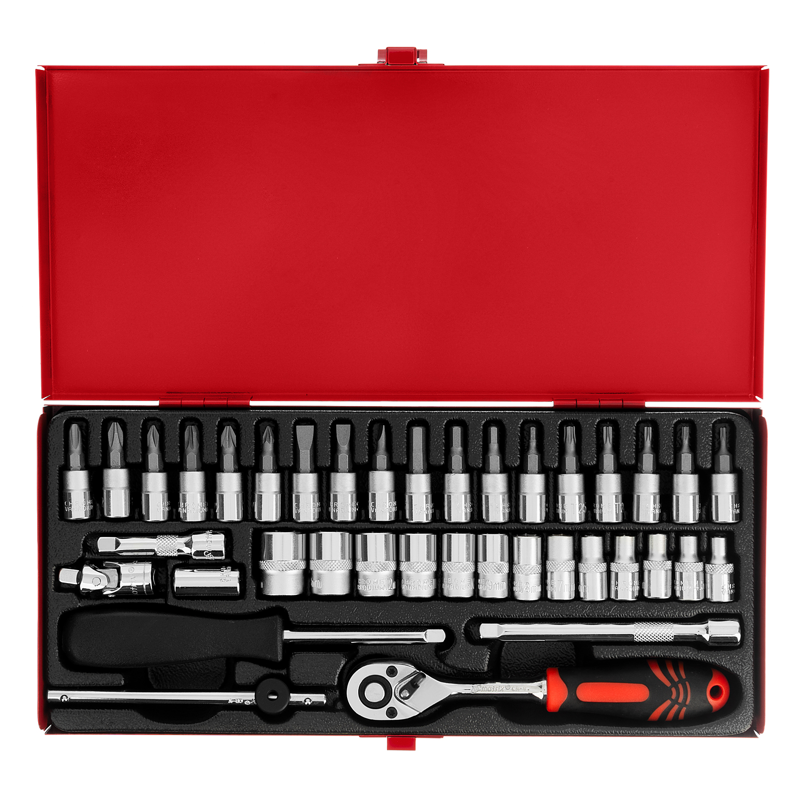 Слесарно-монтажный набор Matrix 13522 состоит из 38 предметов с присоединительным квадратом 1/4" и используется для монтажа и демонтажа гаек, болтов, шурупов, винтов и другого резьбового крепежа. Незаменим в мастерской или гараже, пригодится в быту. В набор входят торцевые головки размером от 4 до 14 мм, что позволяет решать широкий спектр задач.