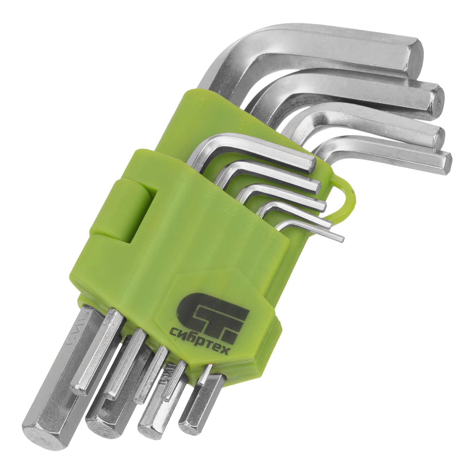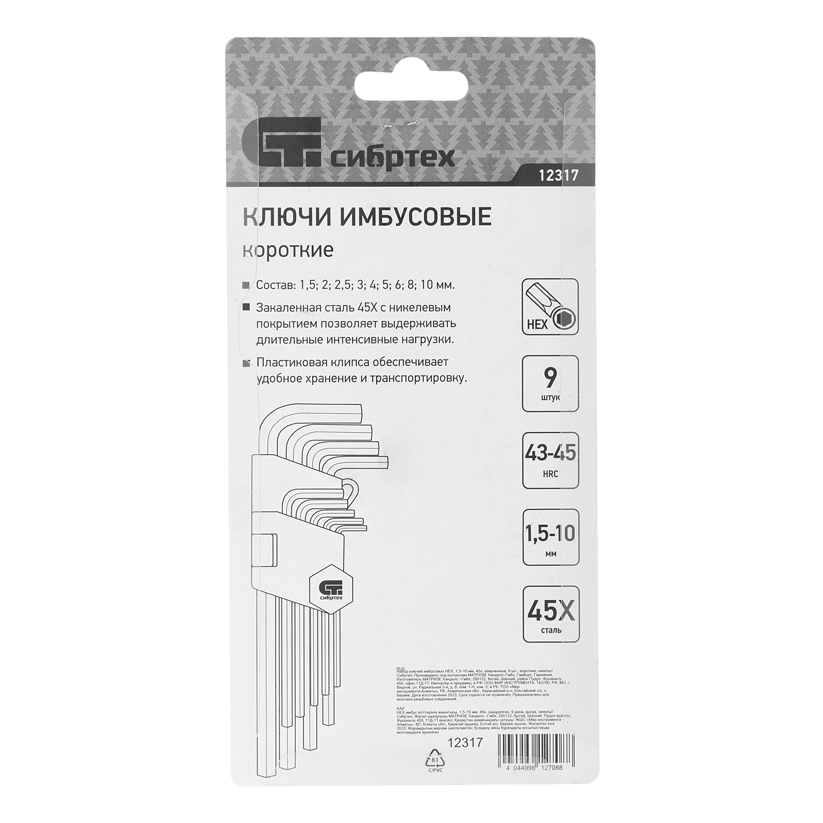 Набор ключей имбусовых HEX, 1.5-10 мм, 45x, закаленные, 9 шт, короткие, никель Сибртех в Москве