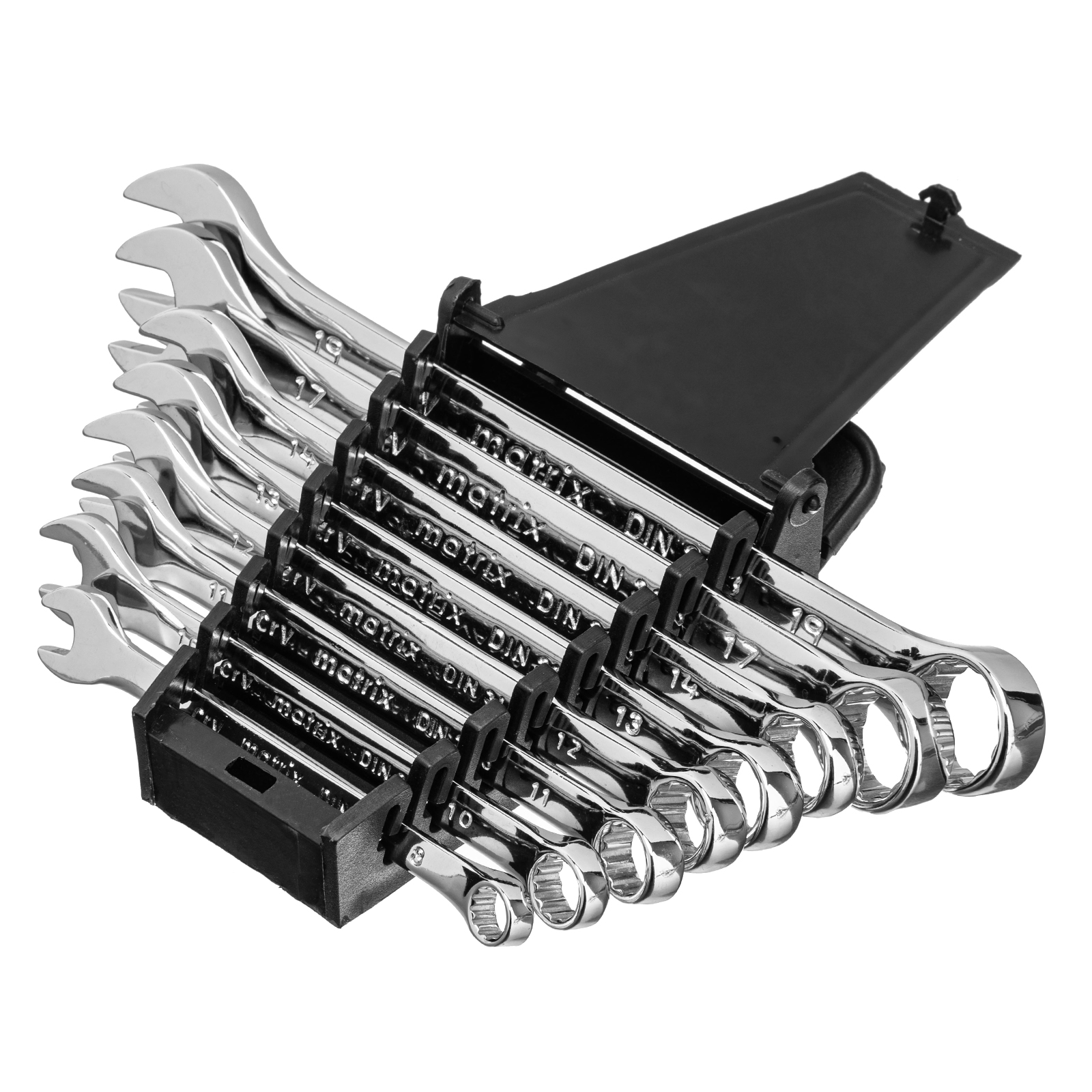 Набор Matrix 15418 включает 8 комбинированных ключей из стали CrV, размером 8-19 мм, с покрытием «полированный хром», которые пригодятся во время ремонтных работ дома или в гараже. С их помощью можно быстро монтировать и демонтировать крепежные элементы. В набор входят инструменты основных типоразмеров, позволяющие эффективно решать поставленные задачи.