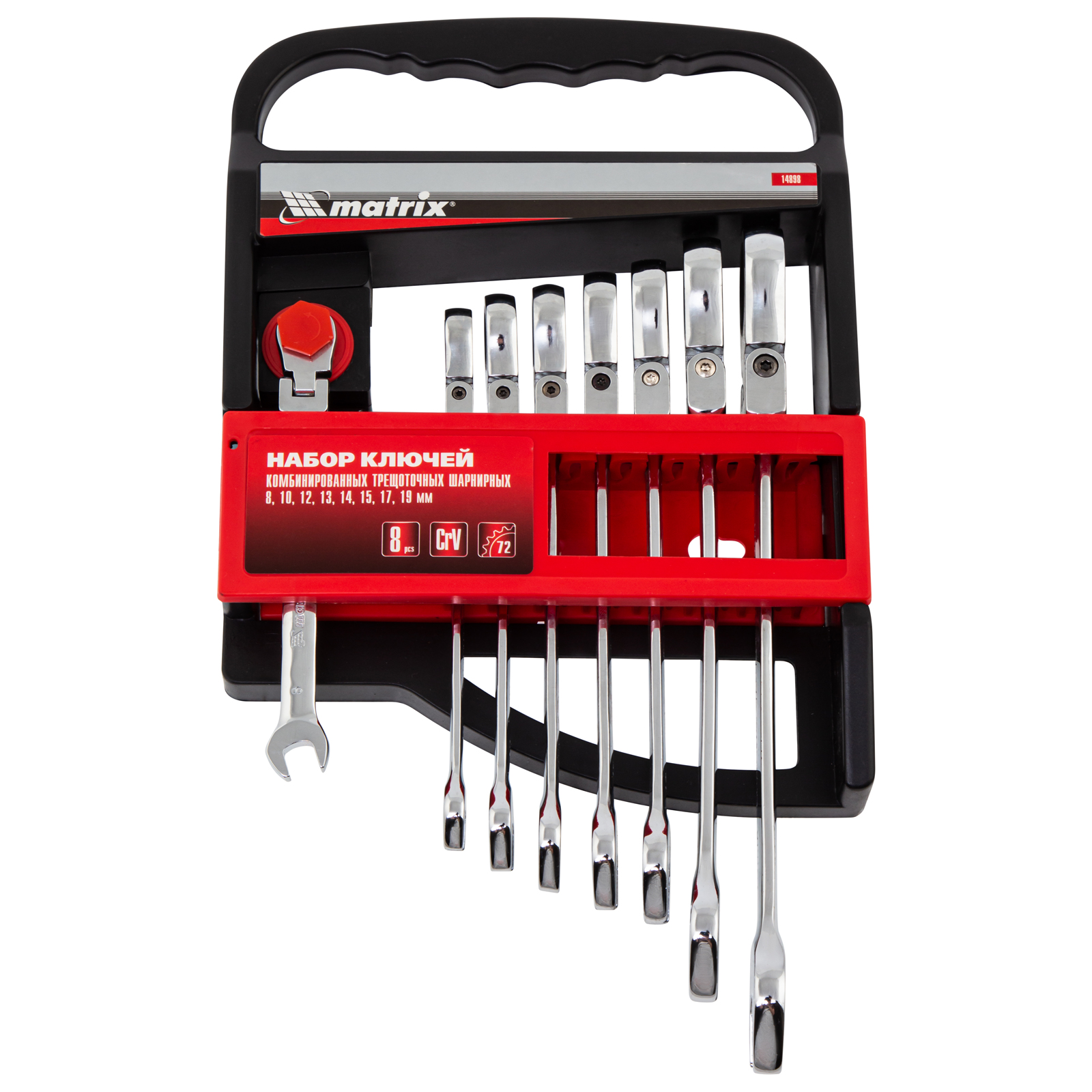 Набор из 8 комбинированных трещоточных шарнирных ключей Matrix 14898 пригодится мастерам и автолюбителям для фиксации и раскручивания крепежных элементов. Трещоточный механизм повышает скорость работы и легко справляется даже с закисшим крепежом.