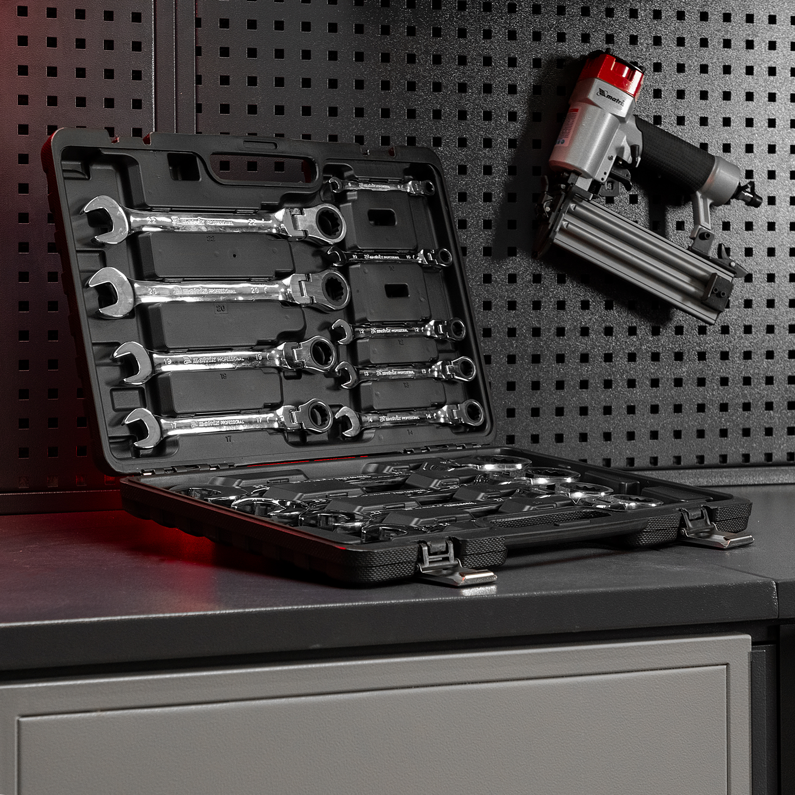 Набор из 13 комбинированных трещоточных шарнирных ключей Matrix 14798 пригодится мастерам и автолюбителям для фиксации и раскручивания крепежных элементов. Трещоточный механизм повышает скорость работы и легко справляется даже с закисшим крепежом.