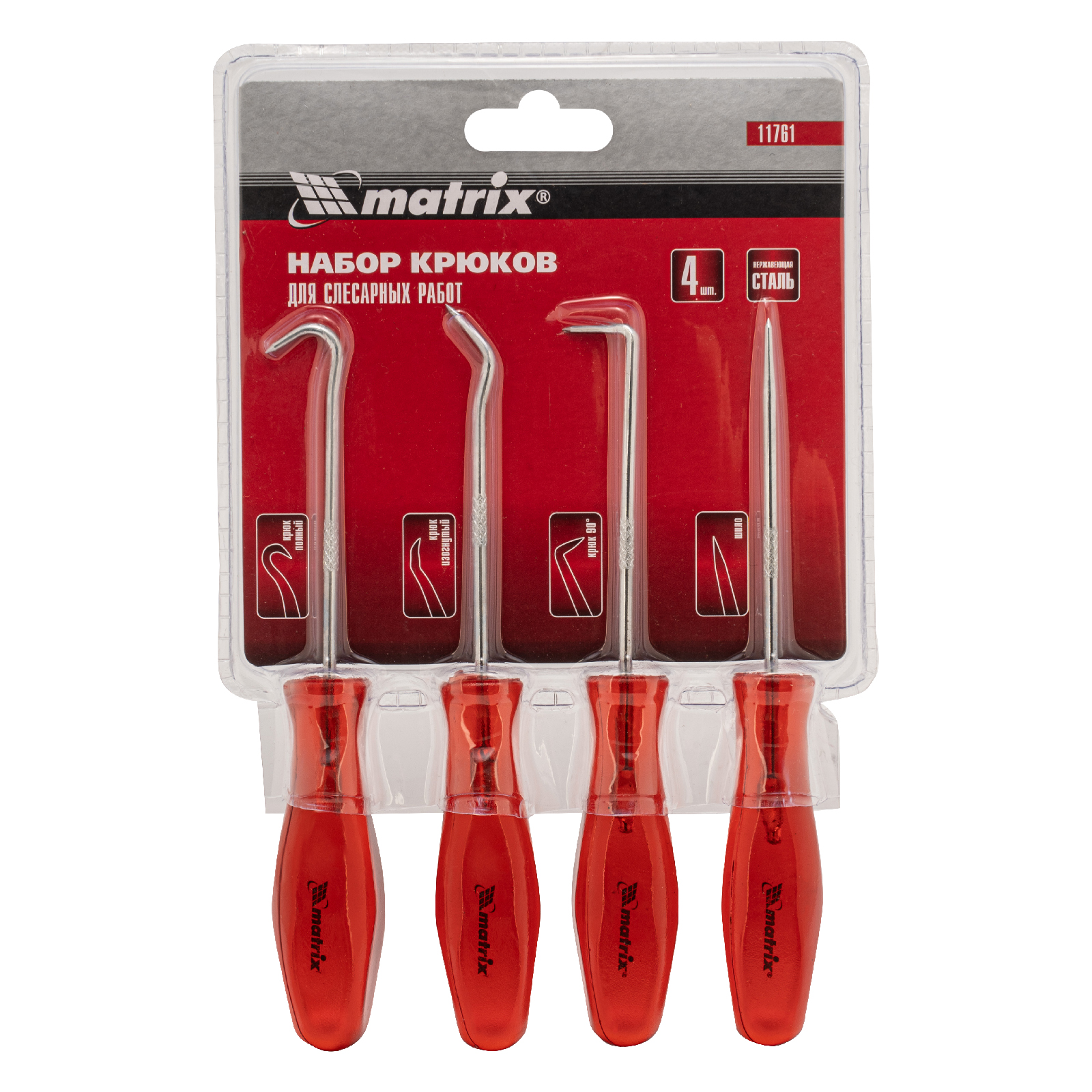 Набор крюков для слесарных работ Matrix 11761 состоит из 4 предметов длиной 155 мм — шила, полного и углового крюков, а также крюка на 90°. Набор позволяет решать разнообразные бытовые и профессиональные задачи: снимать уплотнительные кольца и сальники, размечать металлические детали, проделывать отверстия в коже, дереве и других материалах. Инструменты будут полезны при выполнении строительных, слесарных и столярных работ, пригодятся в автосервисе, а также дома или на даче.