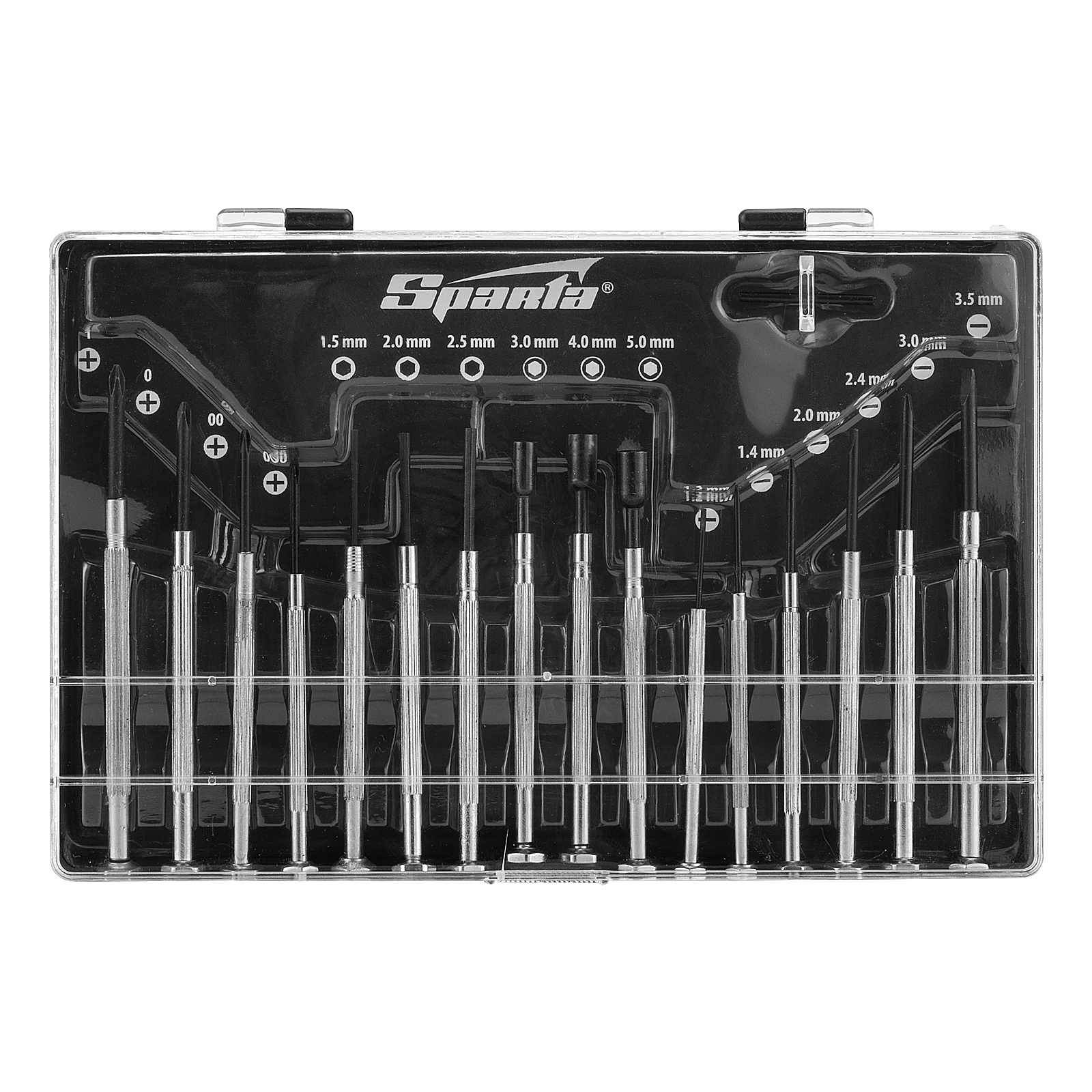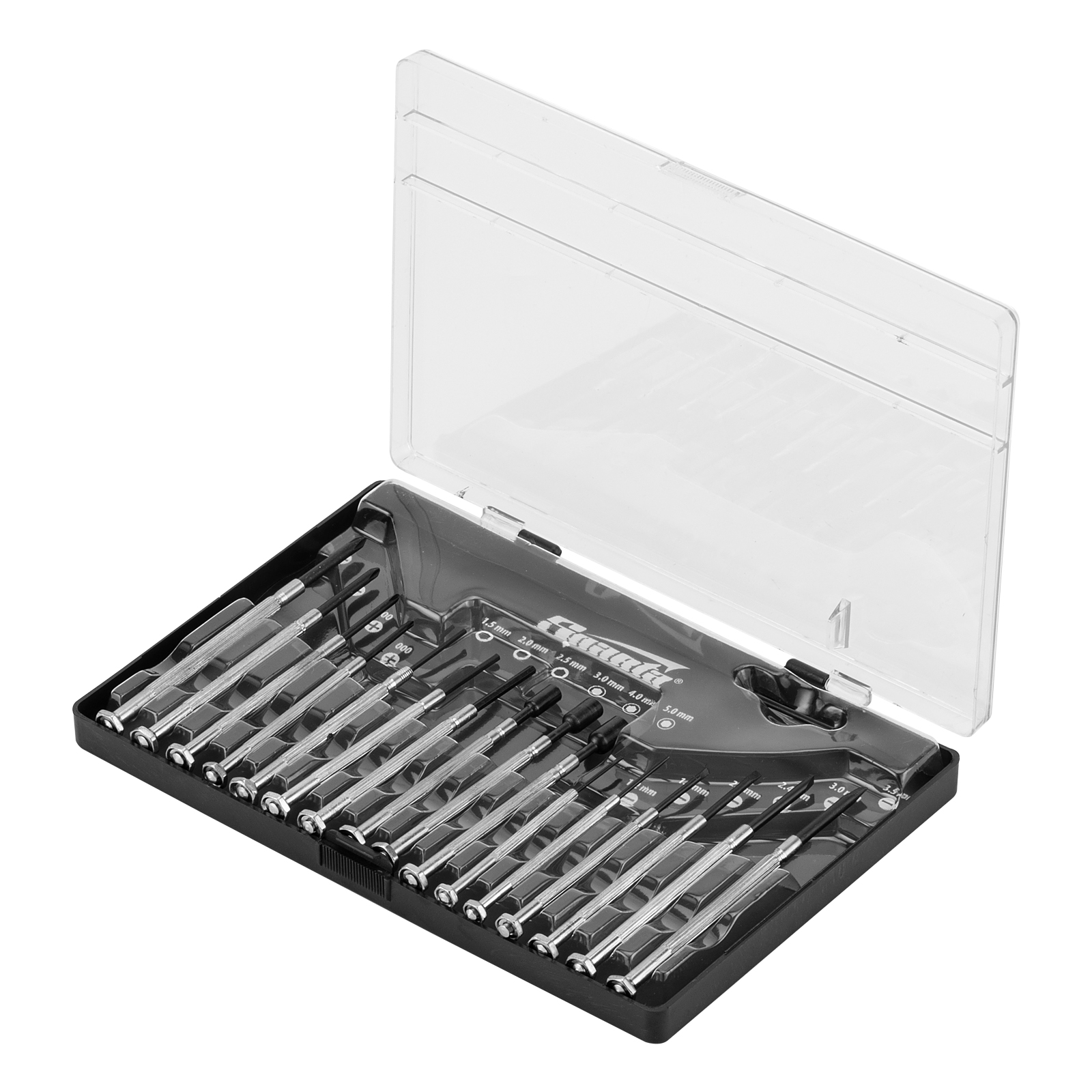 Отвертки для точной механики: РН000, РН00, РН0, РН1, SL1.2, SL1.4, SL2, SL2.4, SL3, SL3.5, H1.5, H2, H2.5 - 13 штТорцевые головки: 3, 4, 5 - 3 штПластиковый кейс - 1 шт |