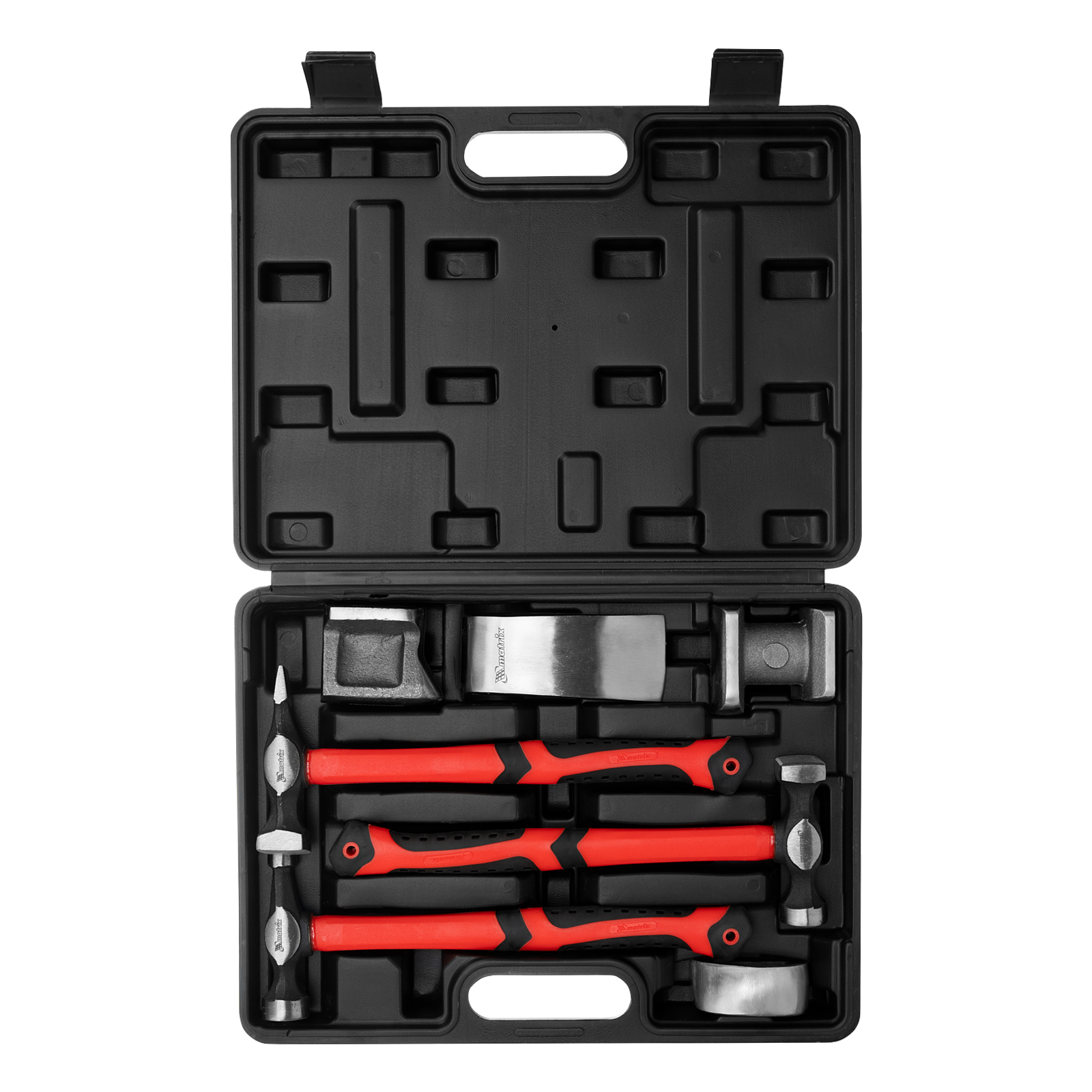 Рихтовочный набор Matrix 10845, включающий 3 молотка с фибергласовыми ручками и 4 наковальни, предназначен для исправления геометрии элементов автомобильного кузова. Наковальни и ударные головки имеют различную форму, что позволяет работать с деталями разной степени кривизны. Набор используется в автомастерских.