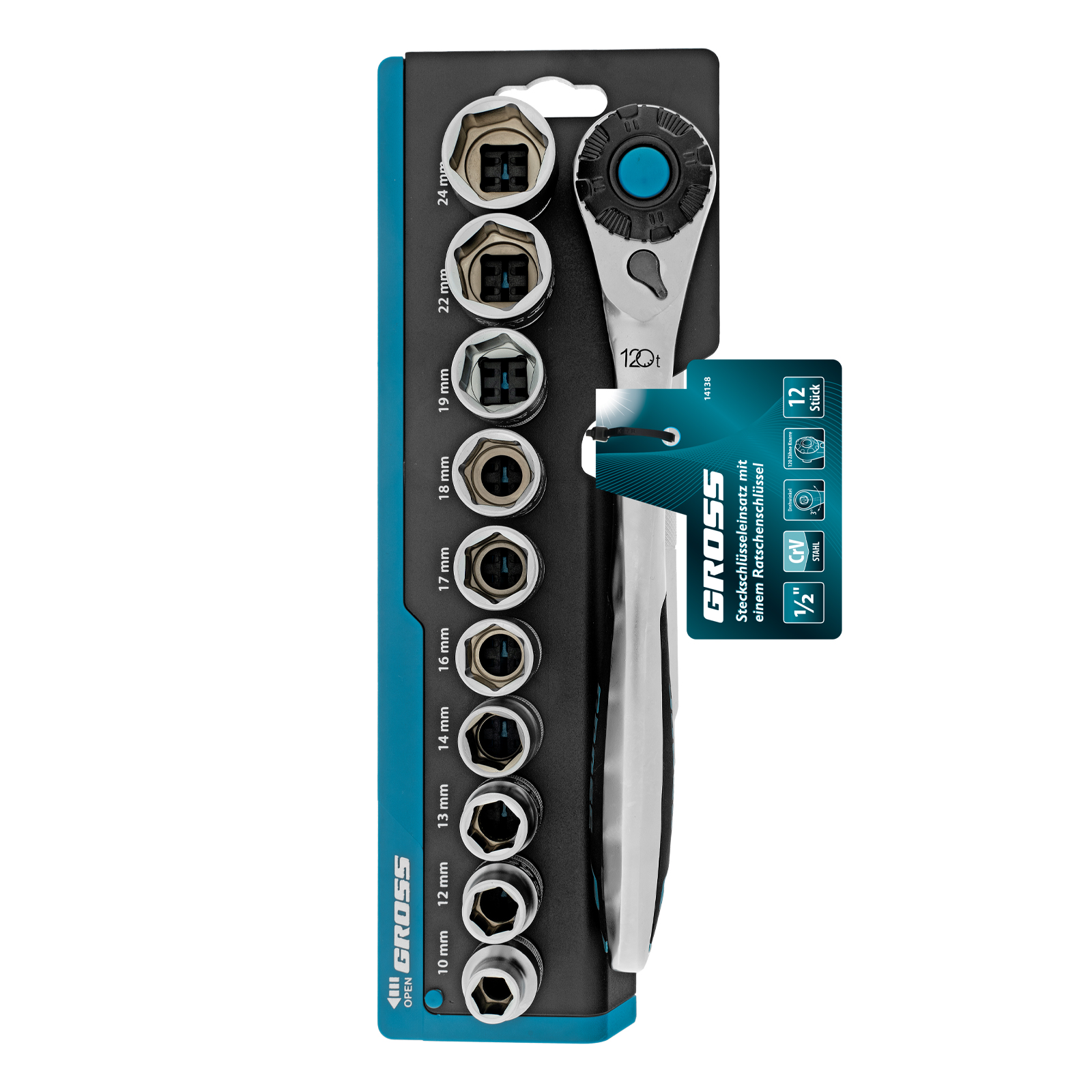 Набор Gross 14138 включает в себя 12 предметов из стали CrV-группы с посадочным квадратом 1/2 дюйма: 10 торцевых головок, трещотку со 120 зубьями и удлинитель 100 мм. Применяется для монтажа и демонтажа резьбовых соединений при проведении технического обслуживания авто или для бытовых ремонтных работ. Набор подходит не только для самостоятельного использования в гараже и дома, но и для профессиональной эксплуатации на станциях техобслуживания.