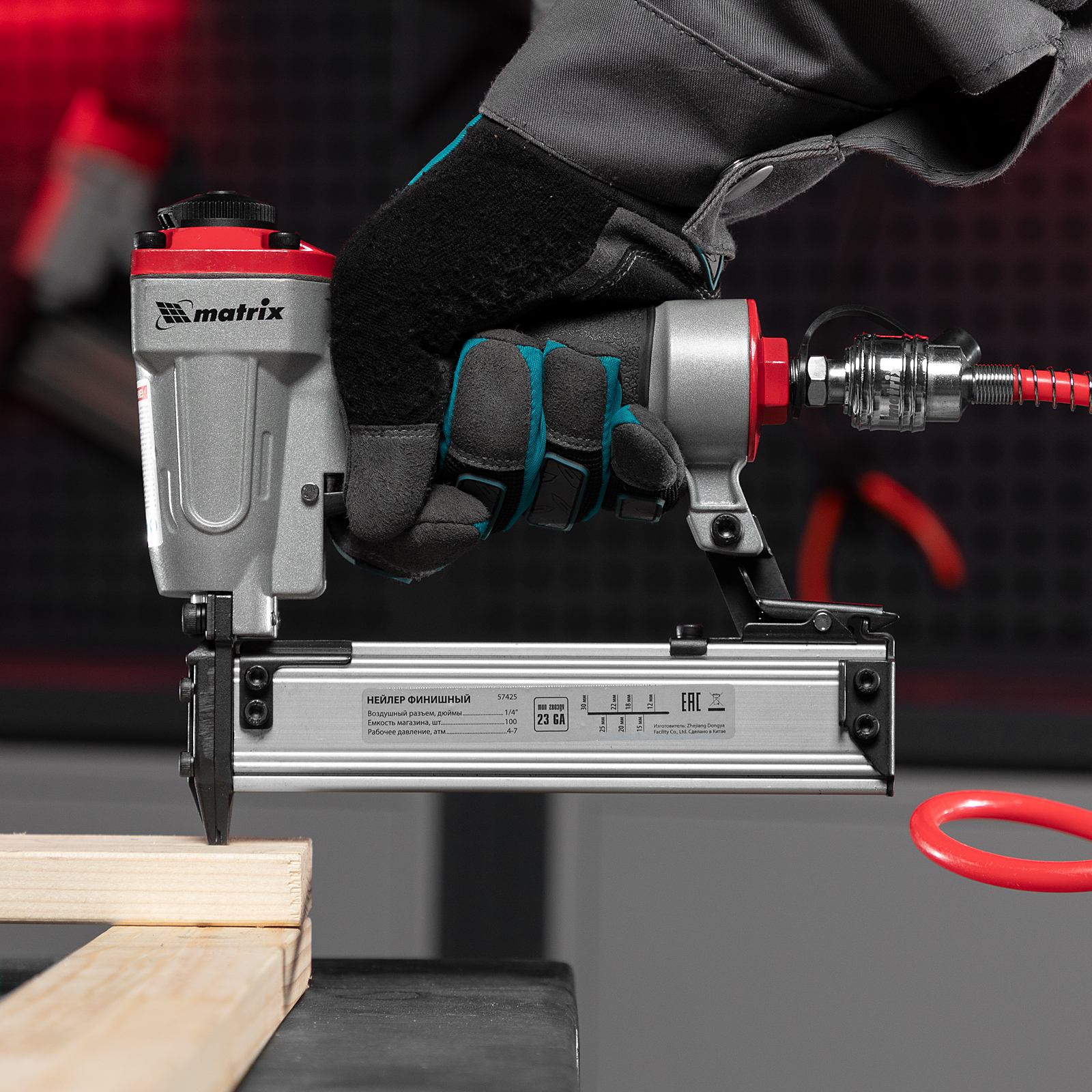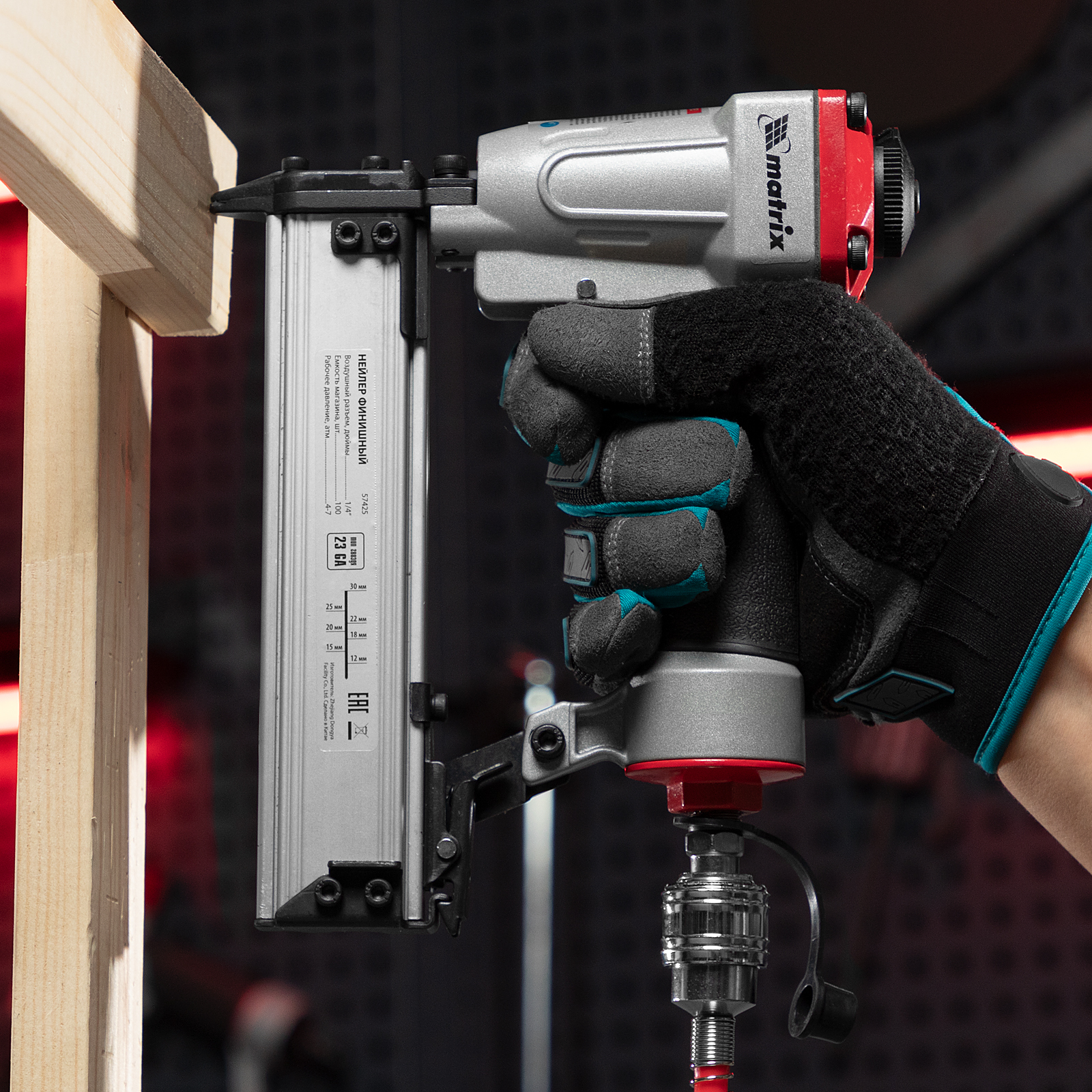Пневматический финишный нейлер Matrix 57425 (шпилькозабивной пистолет) предназначен для забивания гвоздей 23GA диаметром 0,64 мм и длиной 10-30 мм. Он используется для финишной отделки, а также сборки мебели и производства упаковки. Благодаря низкому расходу воздуха 0,7 л/мин нейлер совместим с любым типом компрессоров.