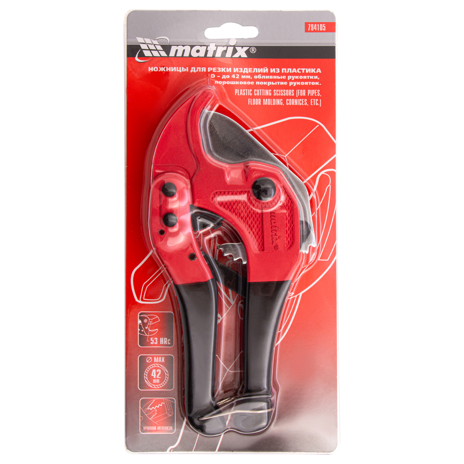 Ножницы Matrix 784105 предназначены для резки изделий из пластика диаметром или шириной до 42 мм — поливинилхлоридных труб, профилей, плинтусов, галтелей, а также резиновых шлангов и других предметов. Благодаря трапециевидному полотну с двумя режущими кромками инструмент позволяет эффективно решать поставленные задачи. Ножницы используются для выполнения сантехнических и отделочных работ.