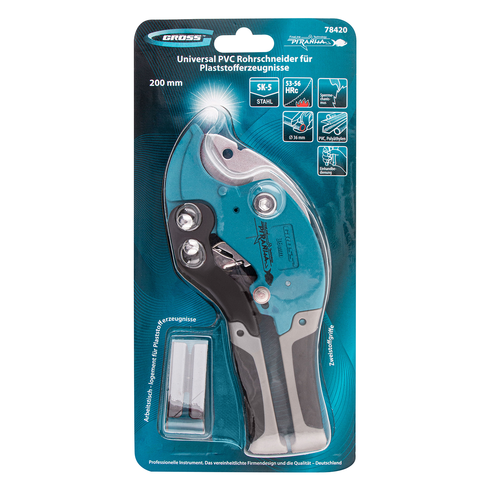Ножницы для резки изделий из ПВХ Gross 78420 с двухкомпонентными рукоятками и рабочим столиком используются для разрезания резиновых шлангов и пластиковых заготовок диаметром до 36 мм — труб, плинтусов, профилей, галтелей, планок, реек. Трапециевидное полотно с двумя рабочими кромками обеспечивает высокую производительность инструмента. Стол, устанавливаемый на опорную поверхность ножниц, позволяет резать плоские предметы. Инструмент рекомендован для профессионального применения.