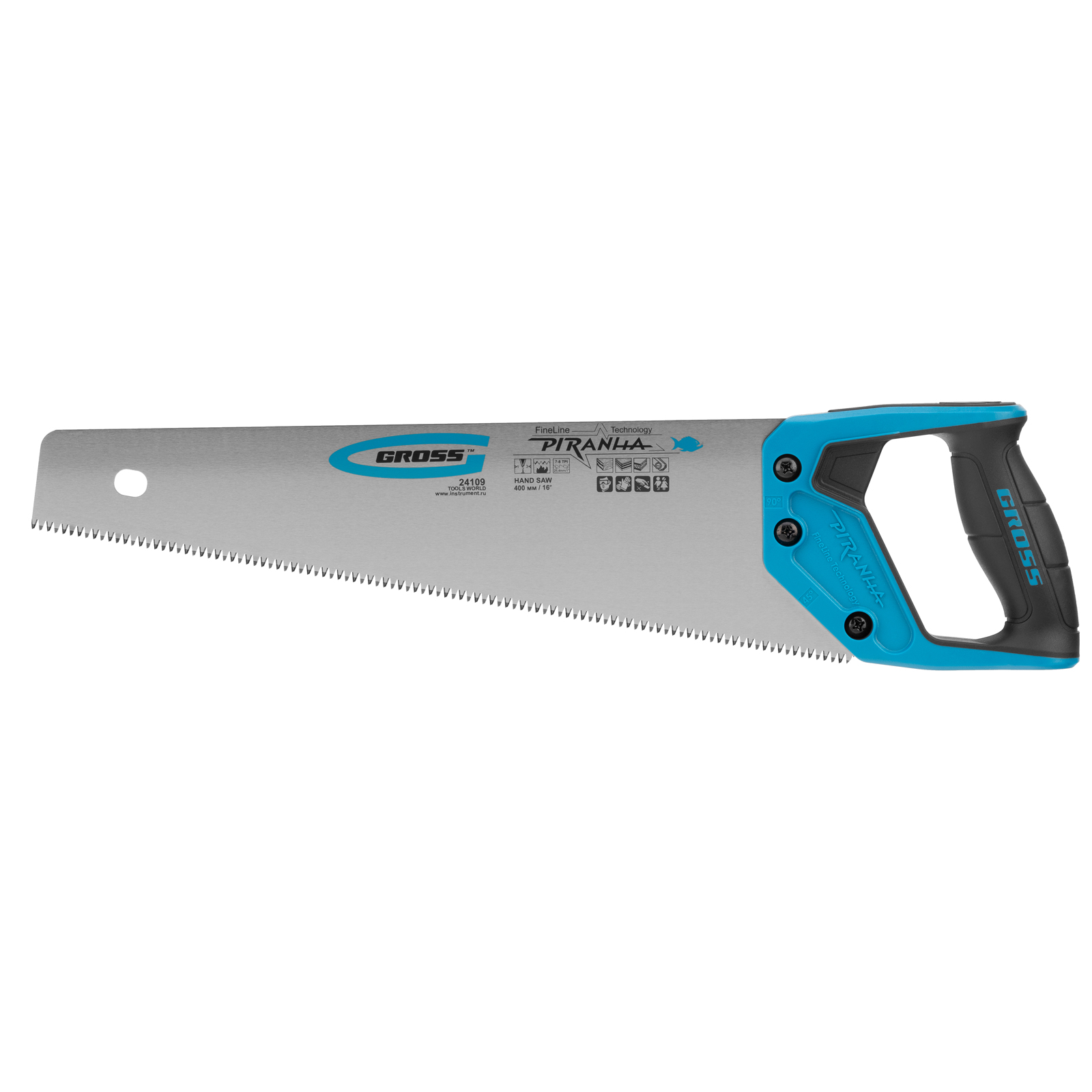Ножовка по дереву Gross PIRANHA 24109 с полотном длиной 400 мм, калеными зубьями с 3D-заточкой и шагом 7-8 TPI, 2-компонентной рукояткой, используется для распиливания древесины, МДФ, ДСП, ДВП, ламината, а также пенополистирола, полиуретана и других пластических материалов. Подходит для продольного и поперечного пиления. Зубья имеют универсальный шаг 7-8 TPI, поэтому ножовка подходит для решения широкого спектра задач. Трехгранная заточка зубьев обеспечивает максимальную производительность и высокое качество пиления. Ножовка предназначена для столярных и плотницких работ, пригодится во время ремонта и будет полезна в быту.