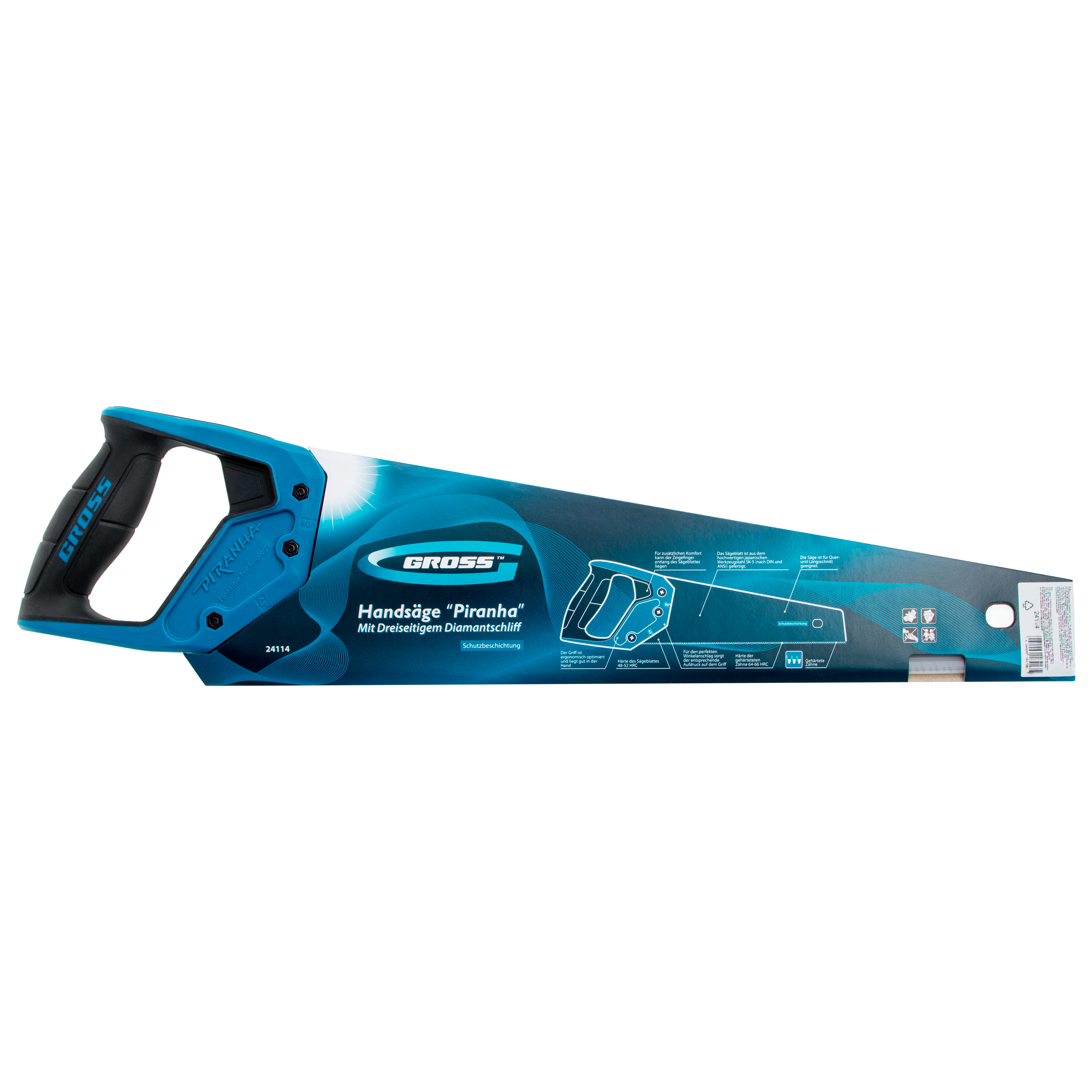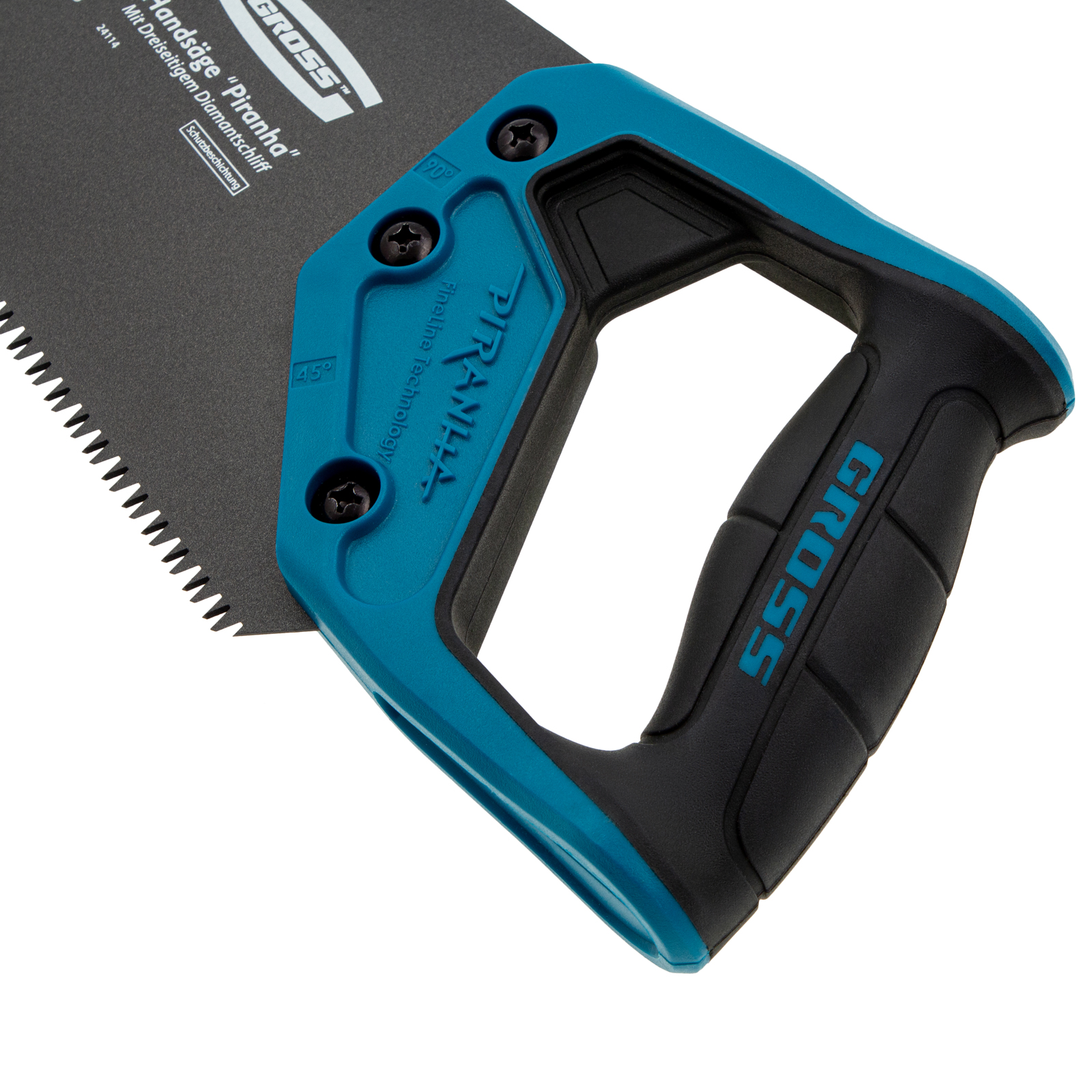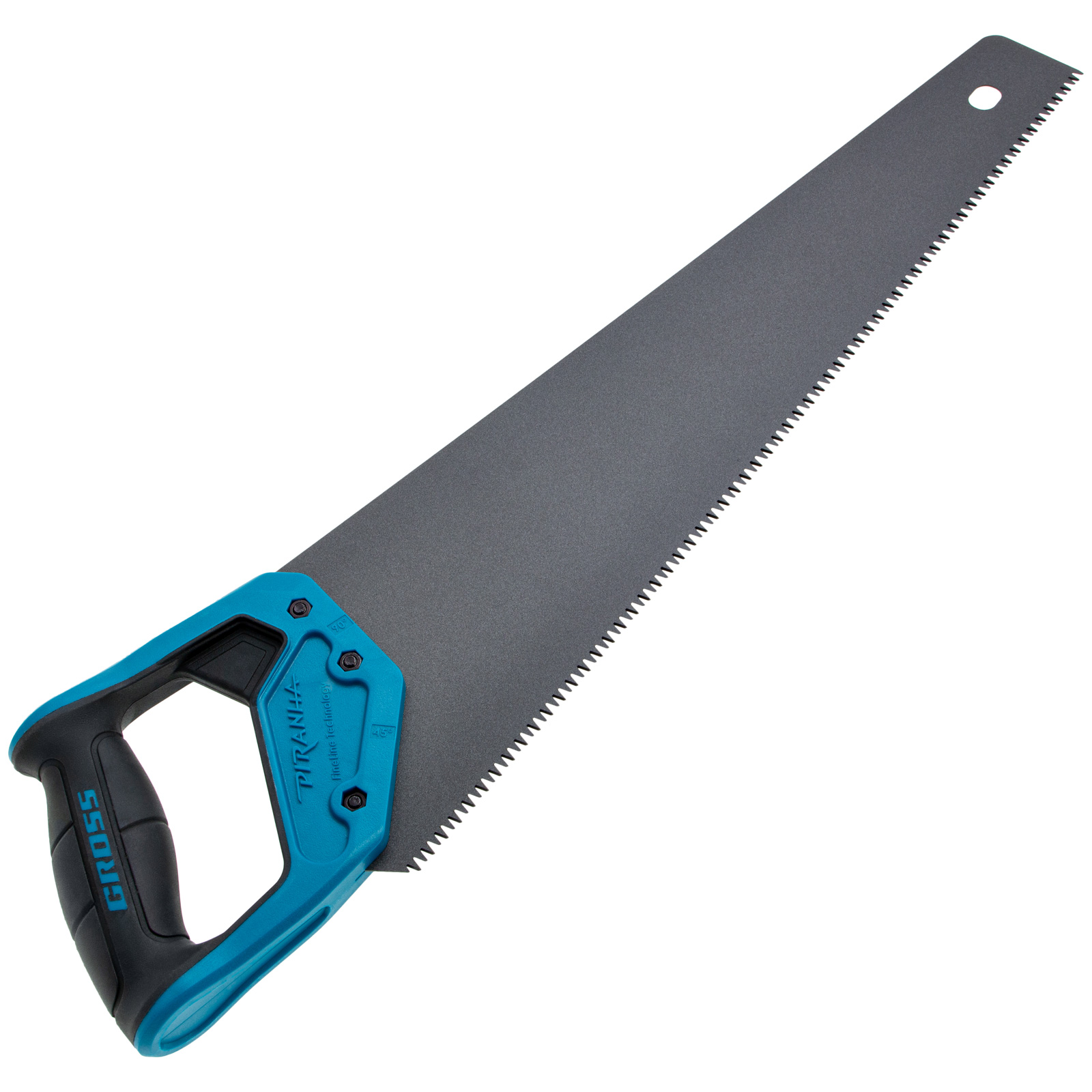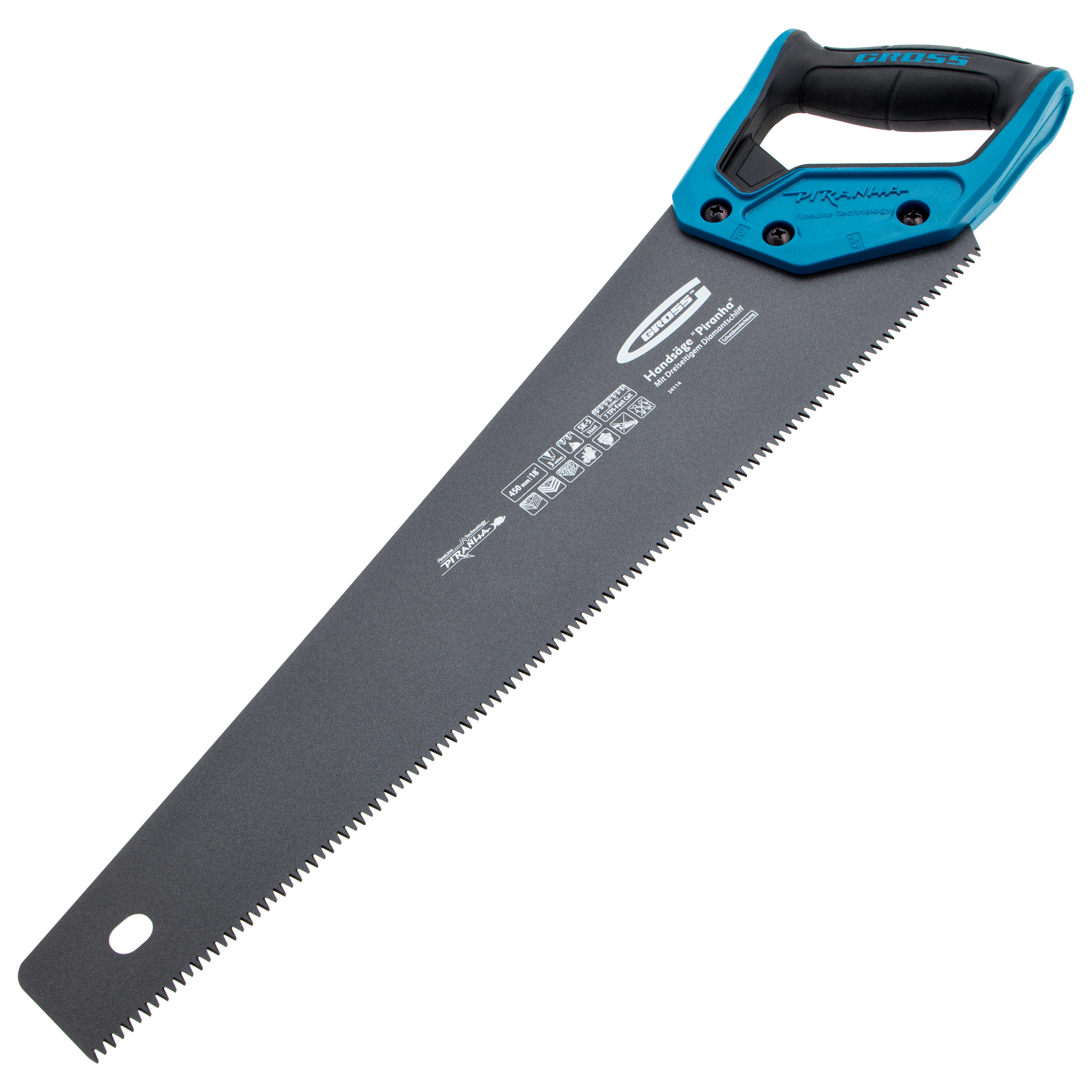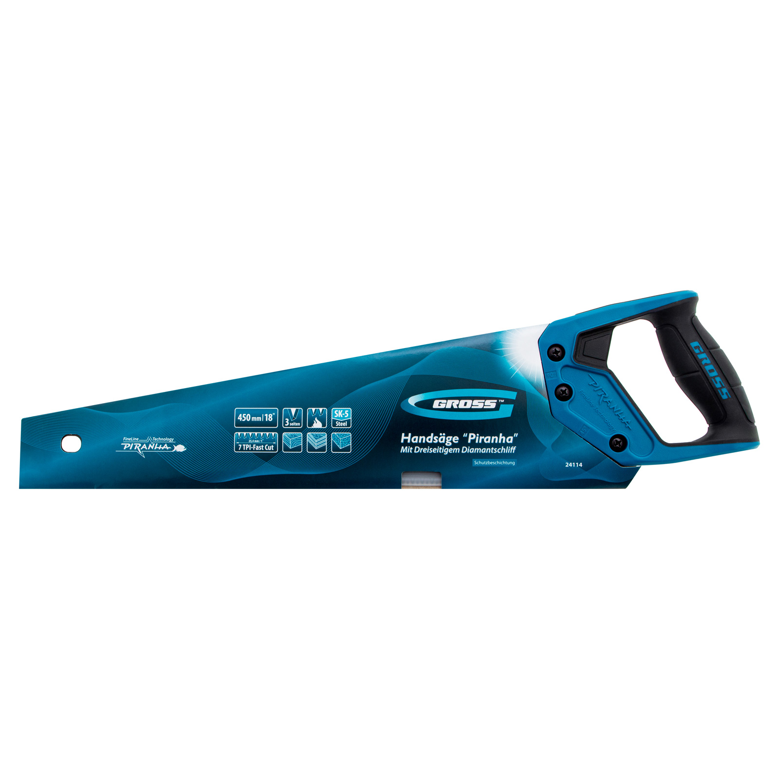 Ножовка по дереву Gross PIRANHA 24114 с полотном длиной 450 мм, калеными зубьями с 3D-заточкой и шагом 7 TPI, с тефлоновым покрытием полотна и 2-компонентной рукояткой, используется для продольного и поперечного распиливания древесины различных пород, МДФ, ДСП, ДВП, ламината, а также пенополистирола, полиуретана и других синтетических материалов. Рабочая часть состоит из крупных зубьев, поэтому ножовка подходит для решения широкого спектра задач. Трехгранная заточка зубьев увеличивает производительность инструмента без потери качества распиловки. Ножовка предназначена для столярных работ.