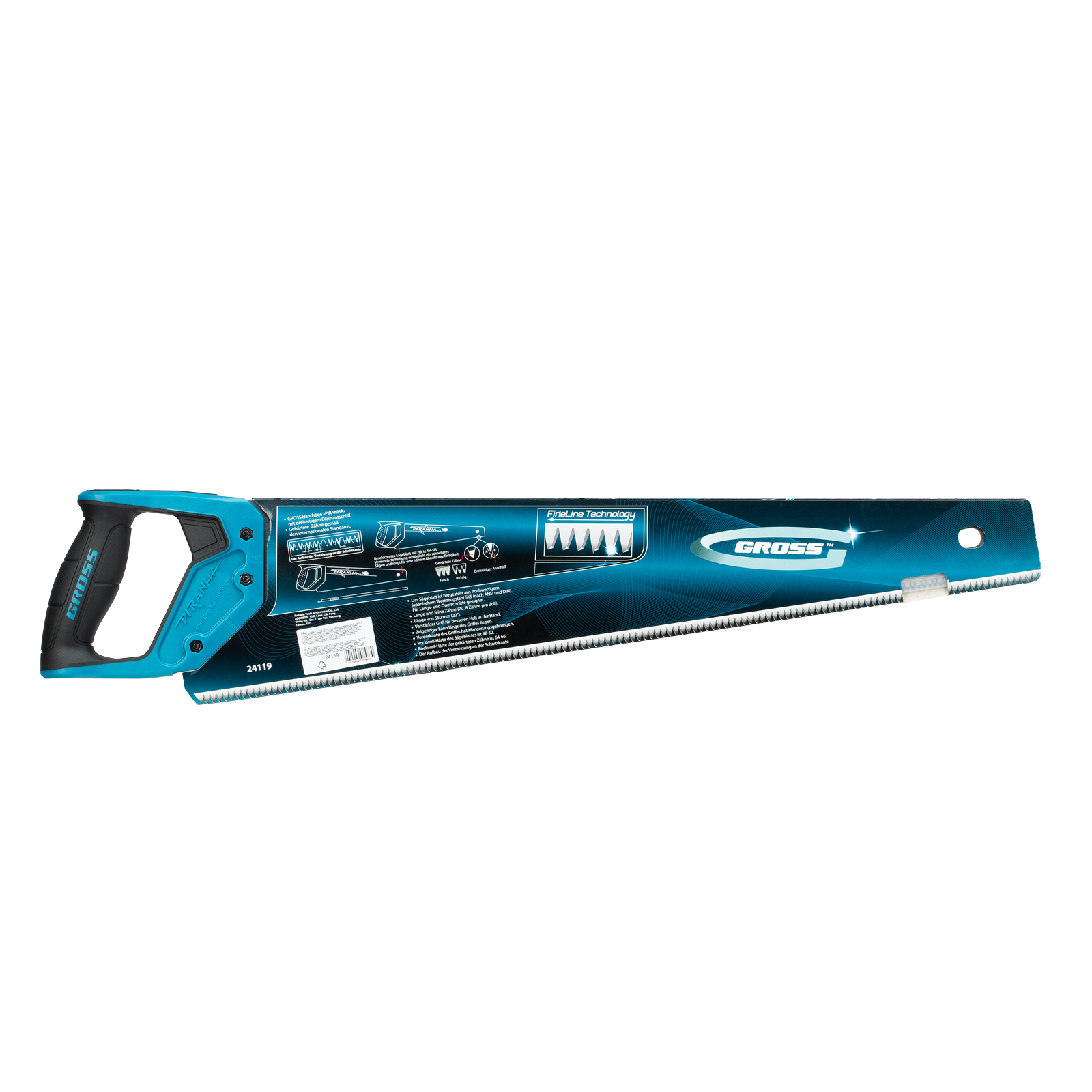 Ножовка по дереву Gross PIRANHA 24119 с полотном длиной 550 мм, зубьями с 3D-заточкой и шагом 7-8 TPI, с 2-компонентной рукояткой, имеет сегментное строение рабочей кромки и предназначена для продольного и поперечного распиливания древесины, МДФ, ДСП, ДВП, а также пенополистирола, полиуретана и других синтетических материалов. Зубья с универсальным шагом 7-8 TPI обеспечивают быстрый и ровный рез, а их трехгранная заточка увеличивает производительность ножовки. Разделение рабочей кромки на сегменты улучшает отвод стружки, благодаря чему полотно не застревает в материале заготовки. Ножовка пригодится столярам, плотникам, а также будет полезна домашним мастерам.