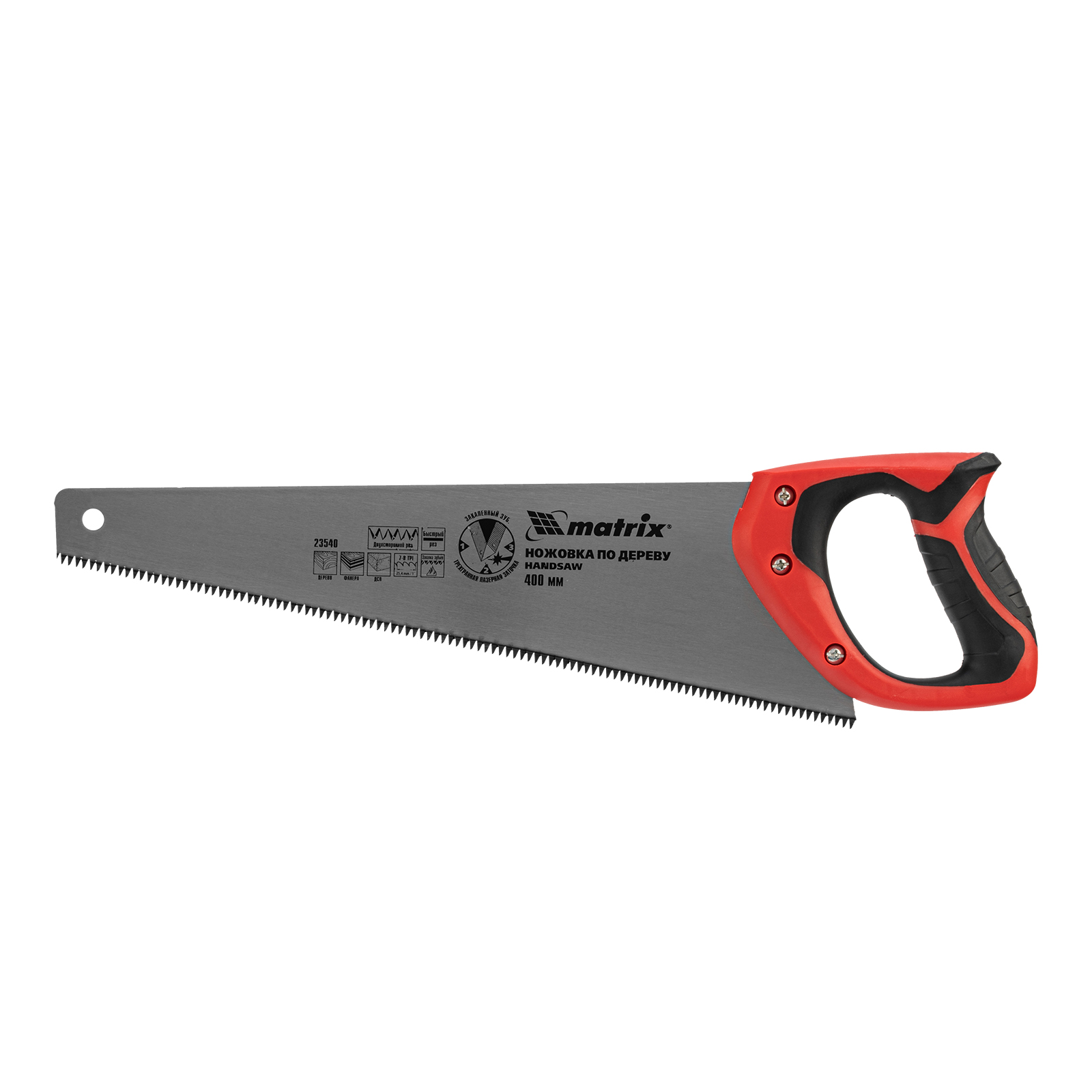 Ножовка по дереву Matrix 23540 с полотном длиной 400 мм, с калеными зубьями с 3D-заточкой и шагом 7-8 TPI, с двухкомпонентной рукояткой, используется для продольного и поперечного пиления досок, брусков, листов фанеры, ДСП. Благодаря трехгранной заточке зубьев пила характеризуется высокой производительностью. Шаг зубьев составляет 7-8 TPI, что обеспечивает быстрый и качественный рез. Ножовка пригодится в столярной мастерской, а также будет полезна в хозяйстве.