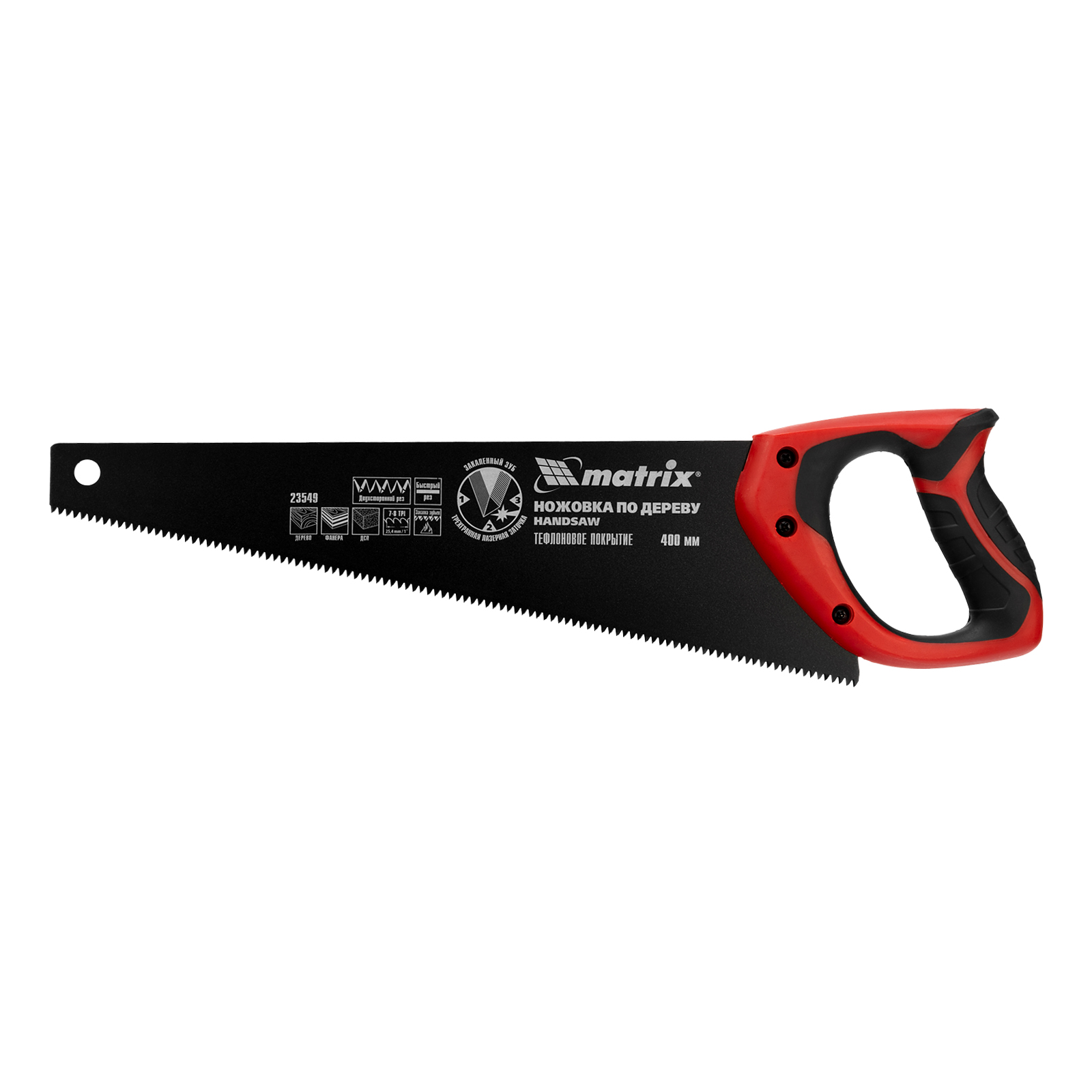 Ножовка по дереву Matrix 23549 с полотном длиной 400 мм, калеными зубьями с шагом 7-8 TPI и 3D-заточкой, с тефлоновым покрытием полотна и 2-компонентной рукояткой, пилит древесину, фанеру и ДСП. Подходит для продольного и поперечного пиления, используется для быстрой распиловки заготовок. Трехгранная заточка зубьев обеспечивает повышенную производительность. Ножовка будет полезна столяру, плотнику, пригодится также в домашнем хозяйстве.