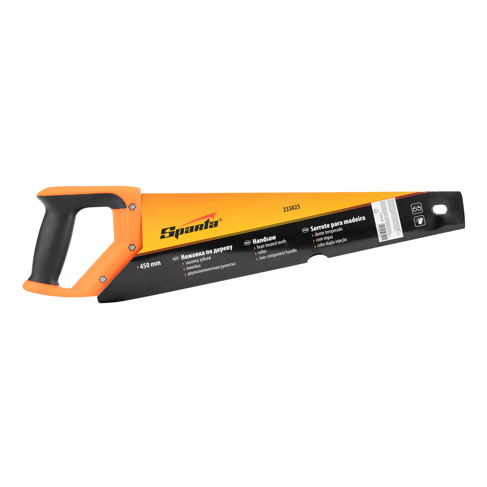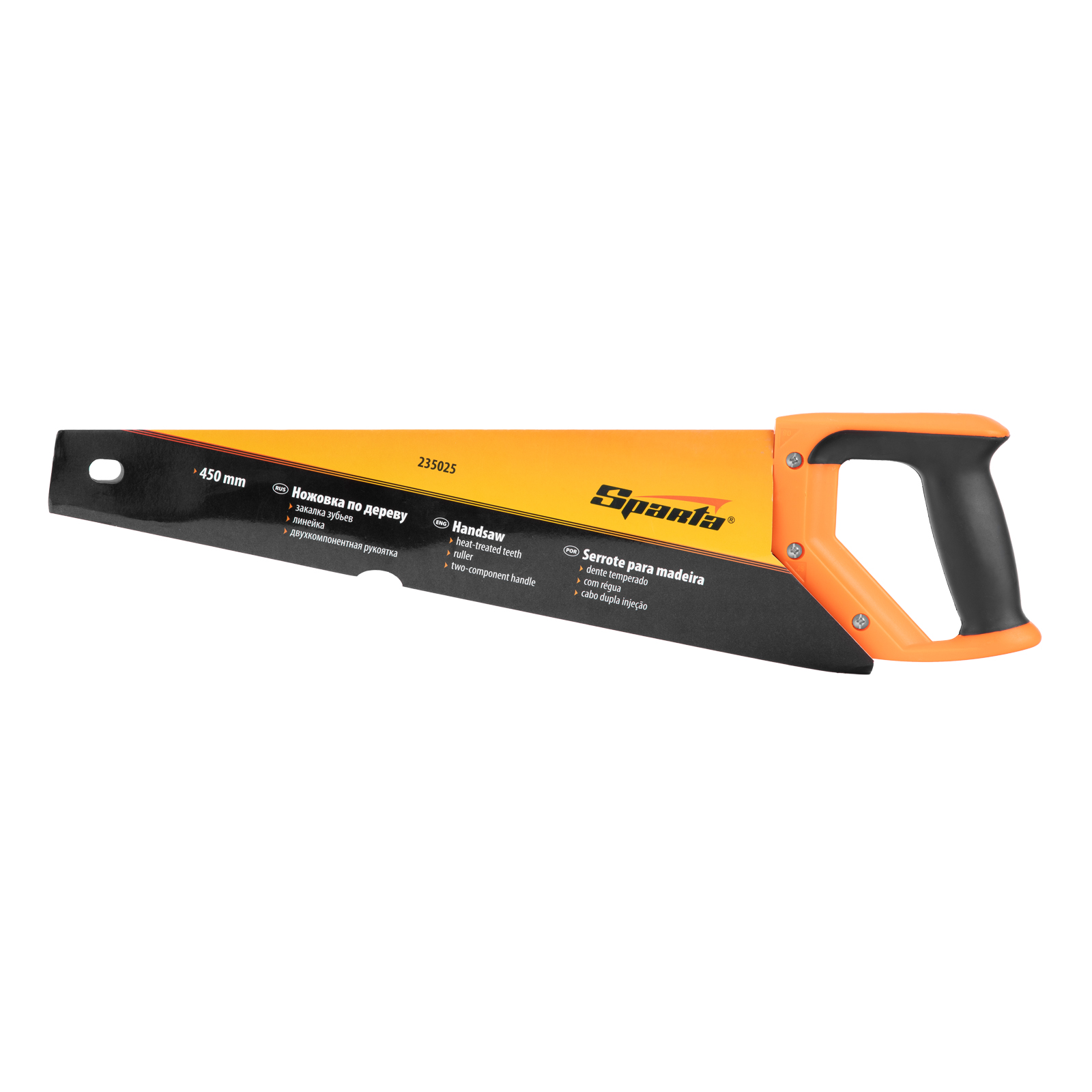 Ножовка по дереву Sparta 235025 с полотном длиной 450 мм, с калеными зубьями с 2D-заточкой и шагом 7-8 TPI, с двухкомпонентной рукояткой, используется во время столярных и плотницких работ. Зубья имеют двухгранную заточку, поэтому ножовкой можно пилить как от себя, так и на себя. Шаг зубьев составляет 7-8 TPI, что обеспечивает быстрый рез. В случае снижения производительности пилы ее рабочую кромку можно заточить.