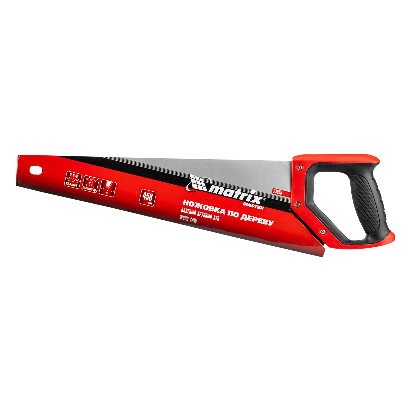 Ножовка по дереву Matrix 23558 с полотном длиной 450 мм, с крупными калеными зубьями с шагом 5-6 TPI и 2D-заточкой, с двухкомпонентной рукояткой, используется для быстрой продольной или поперечной распиловки древесины. Высокая скорость работы достигается благодаря крупным зубьям с волновой заточкой и универсальным шагом 4-5 мм. Двухгранная заточка зубьев дает возможность пилить в направлении как от себя, так и на себя, а также перетачивать режущую кромку при необходимости. Ножовка подходит для выполнения плотницких и хозяйственных работ.